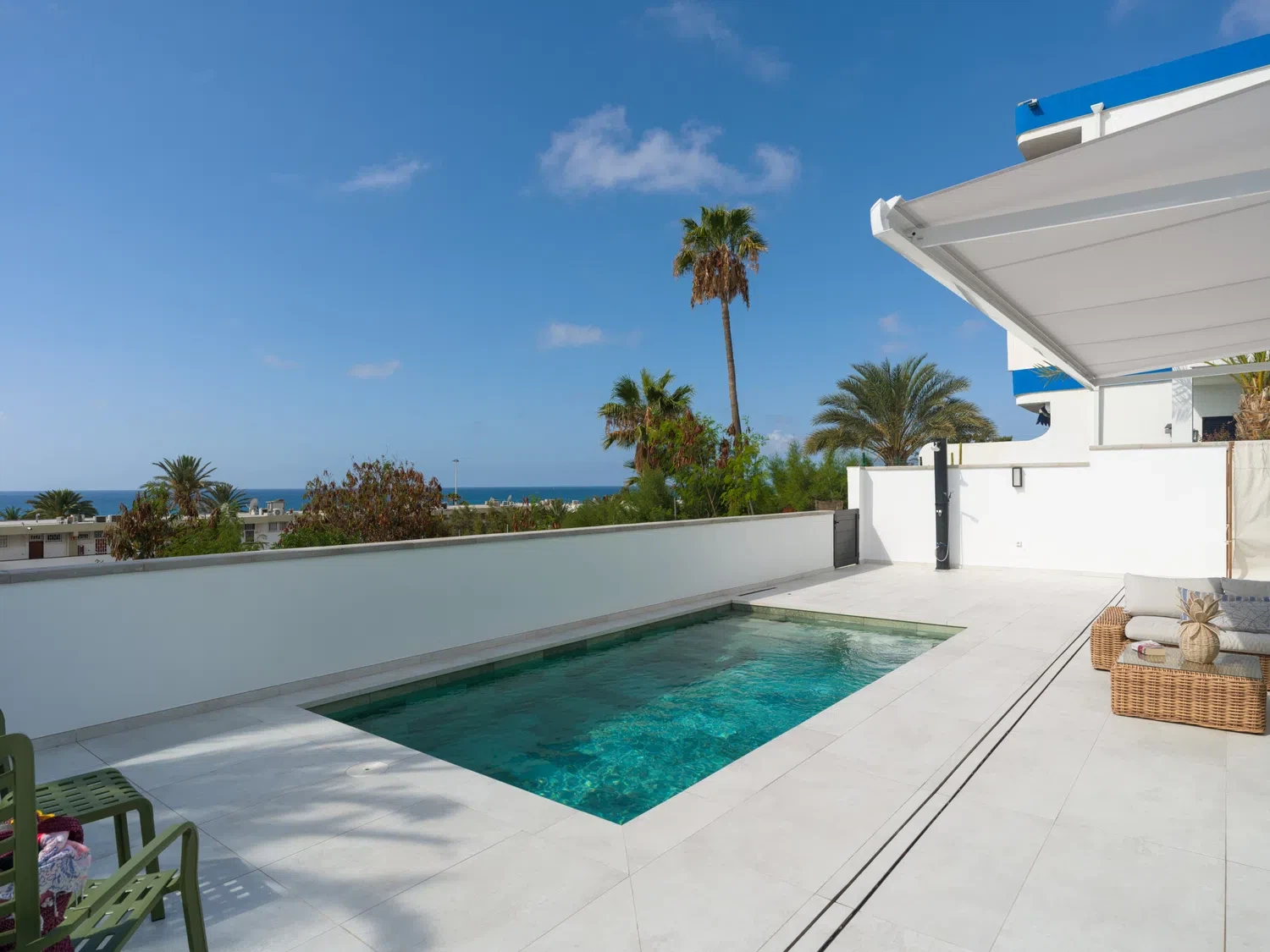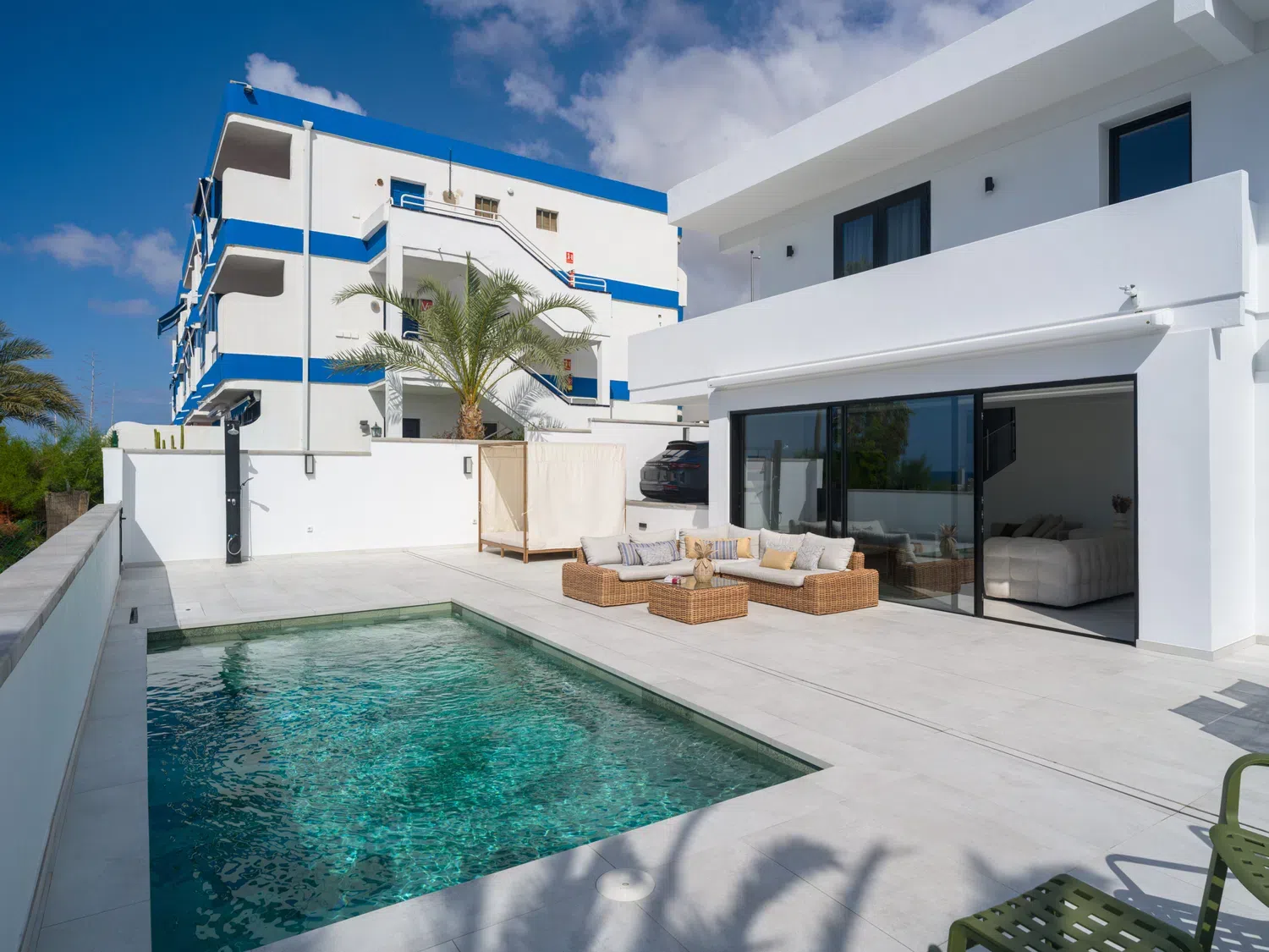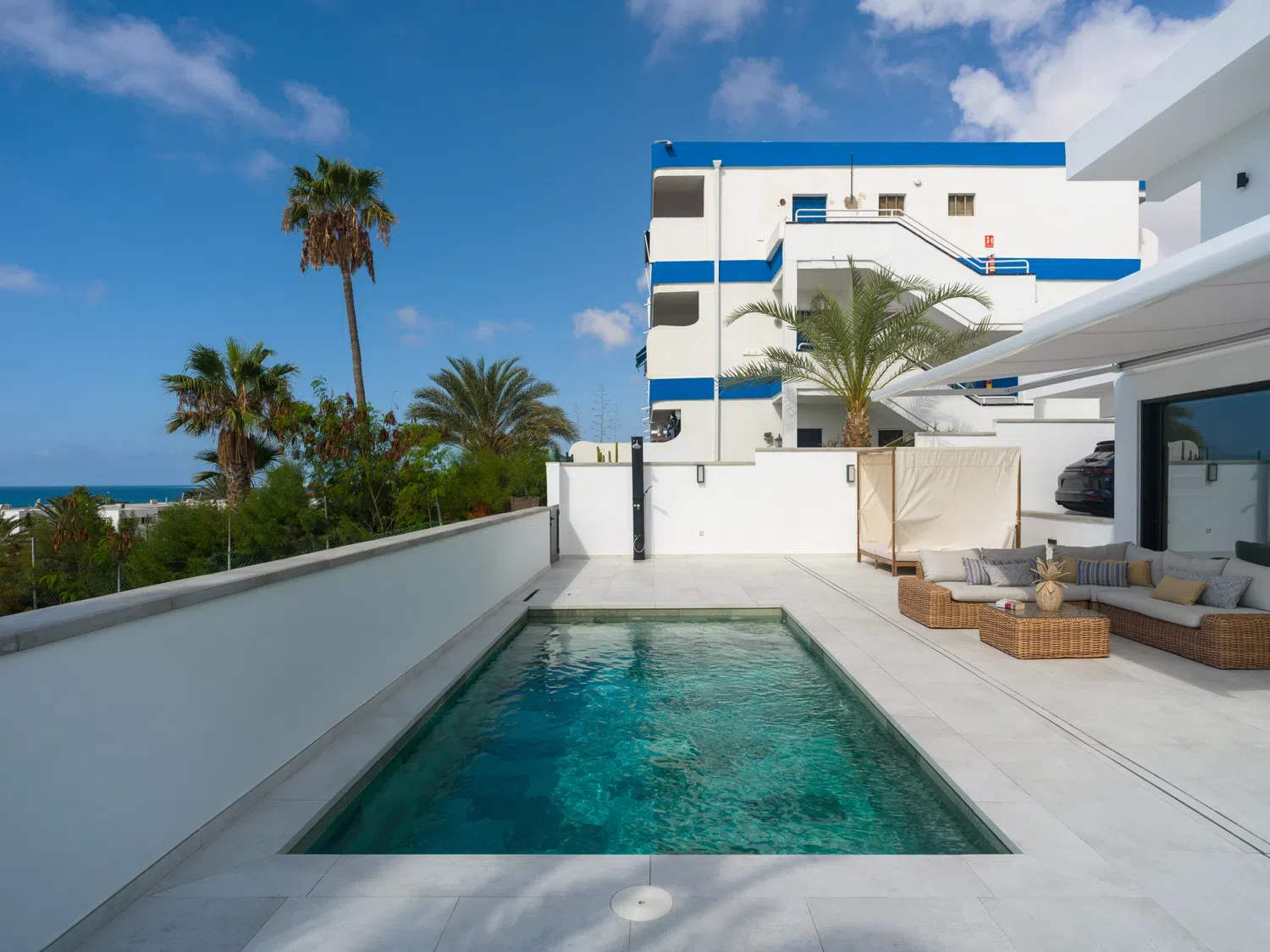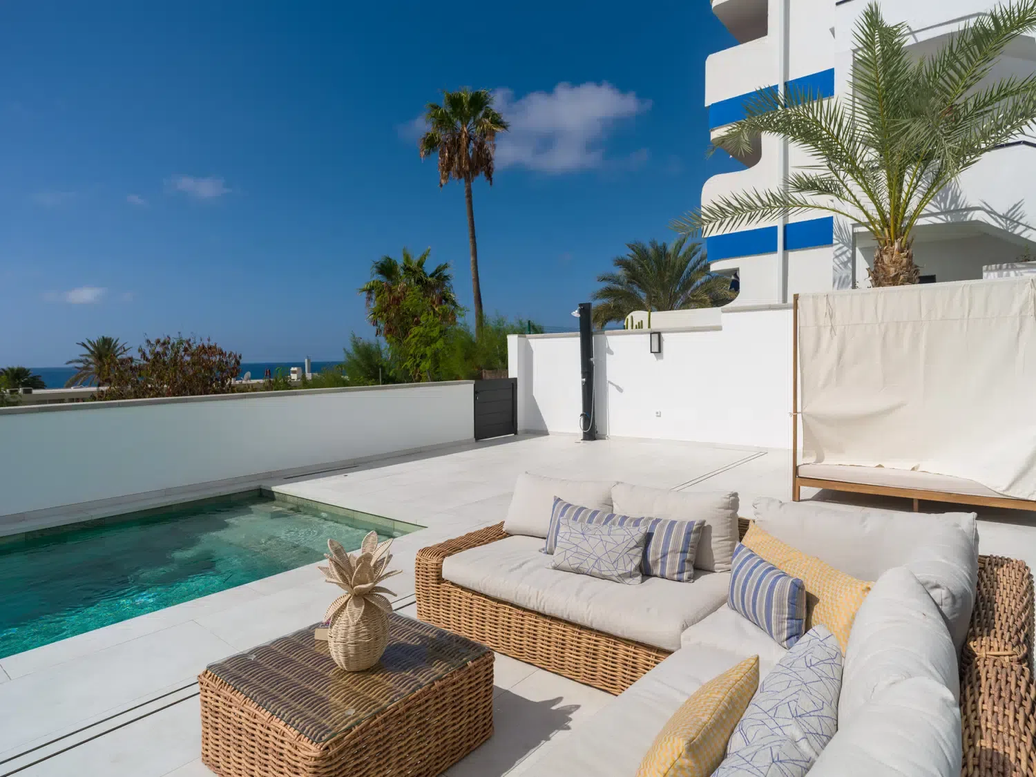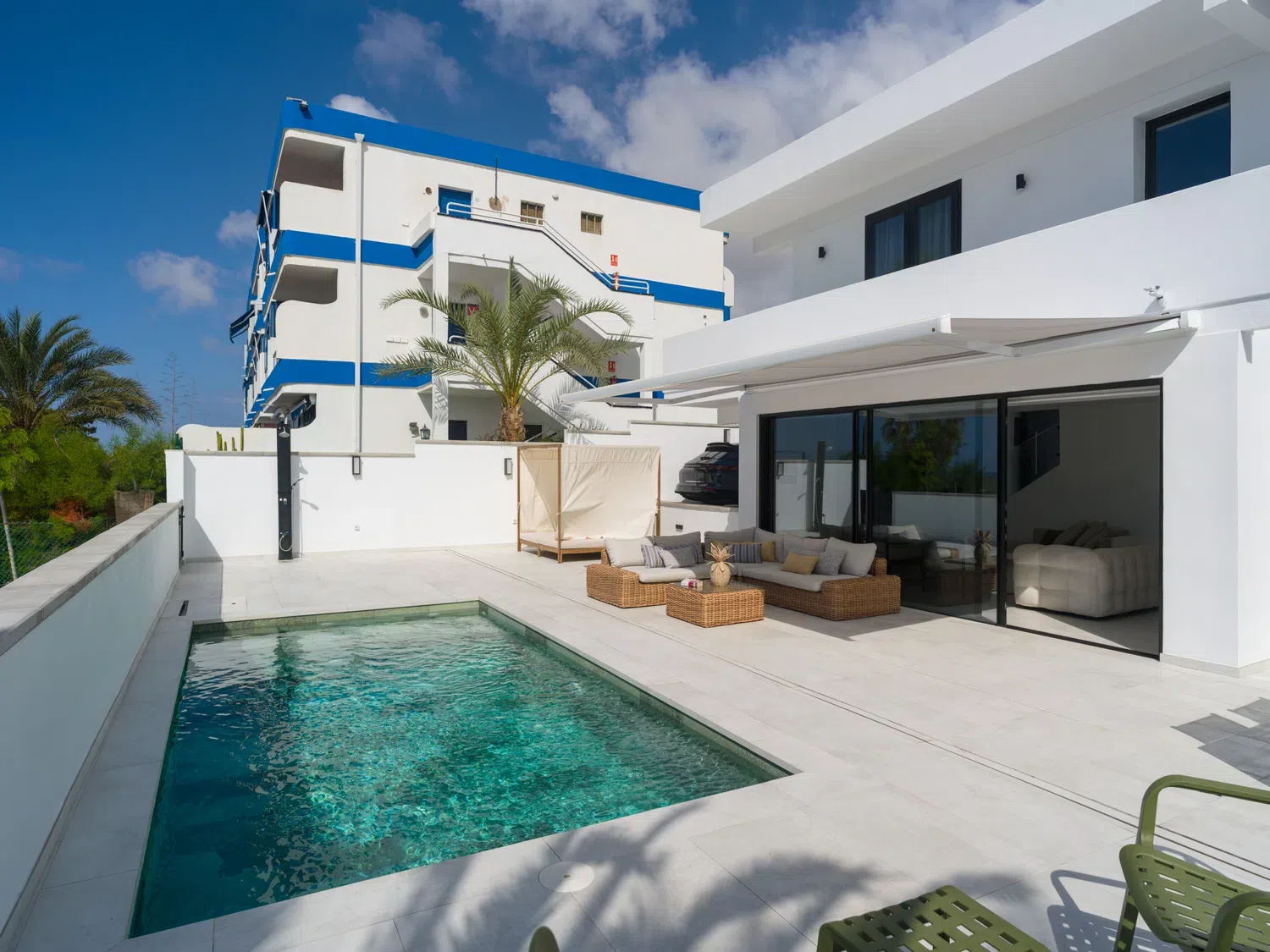 ☀️ Espaciosa terraza con piscina privada (5,80 x 3,00 x 1.40 m), cama balinesa, tumbonas, zona de comedor exterior con mesa y sillas 🍽️ y sofás exteriores para relajarse al aire libre.