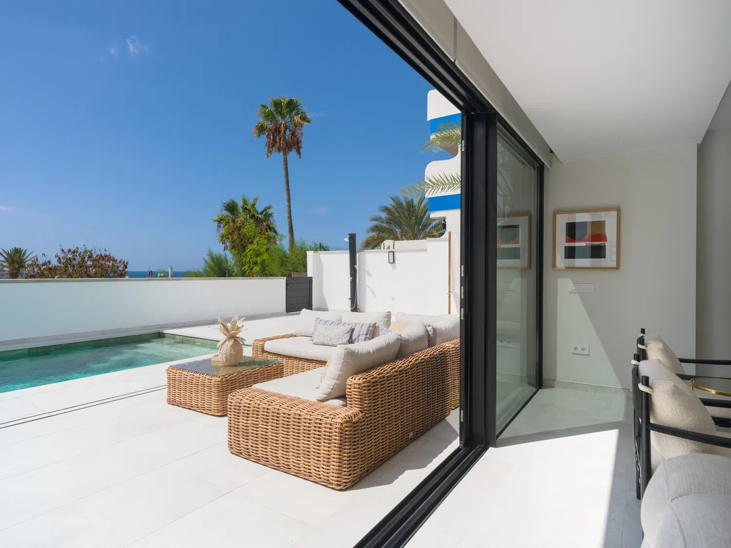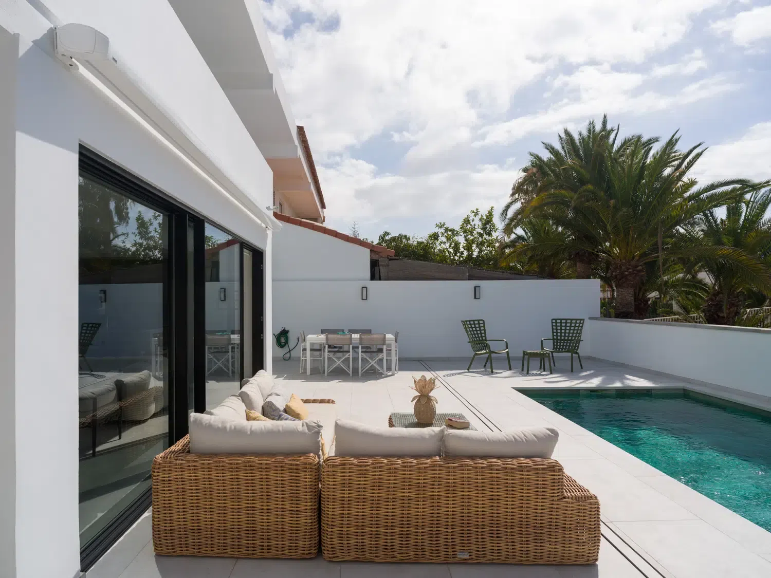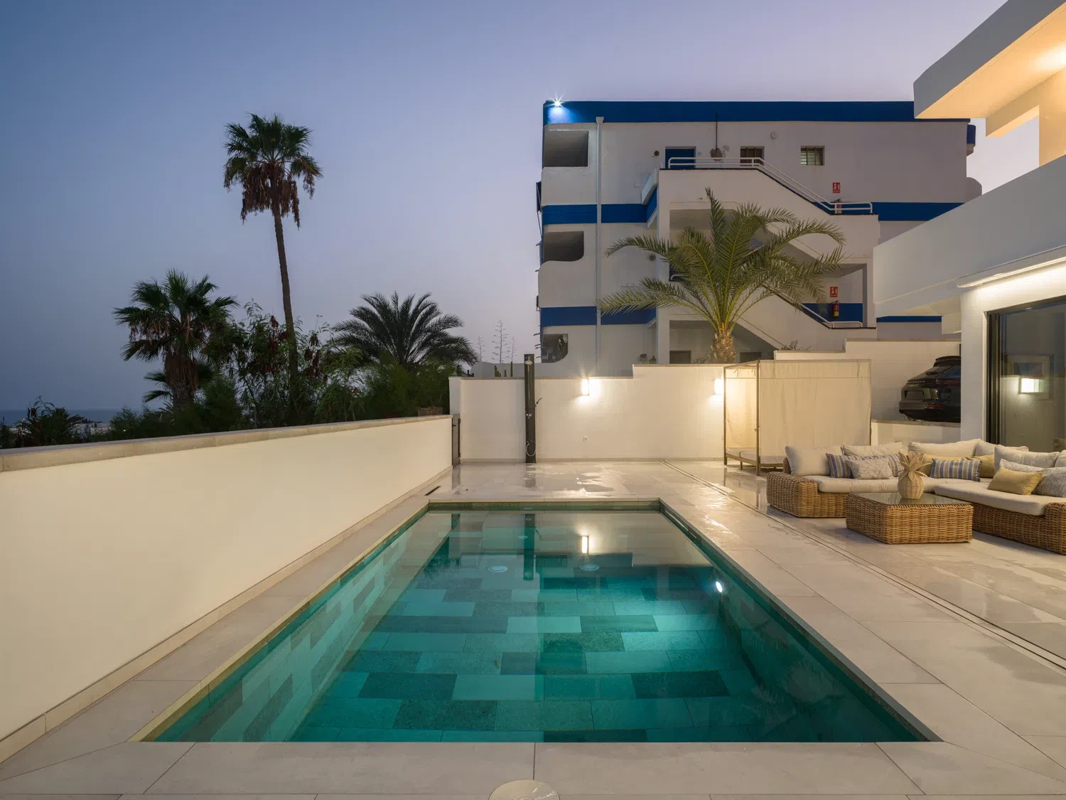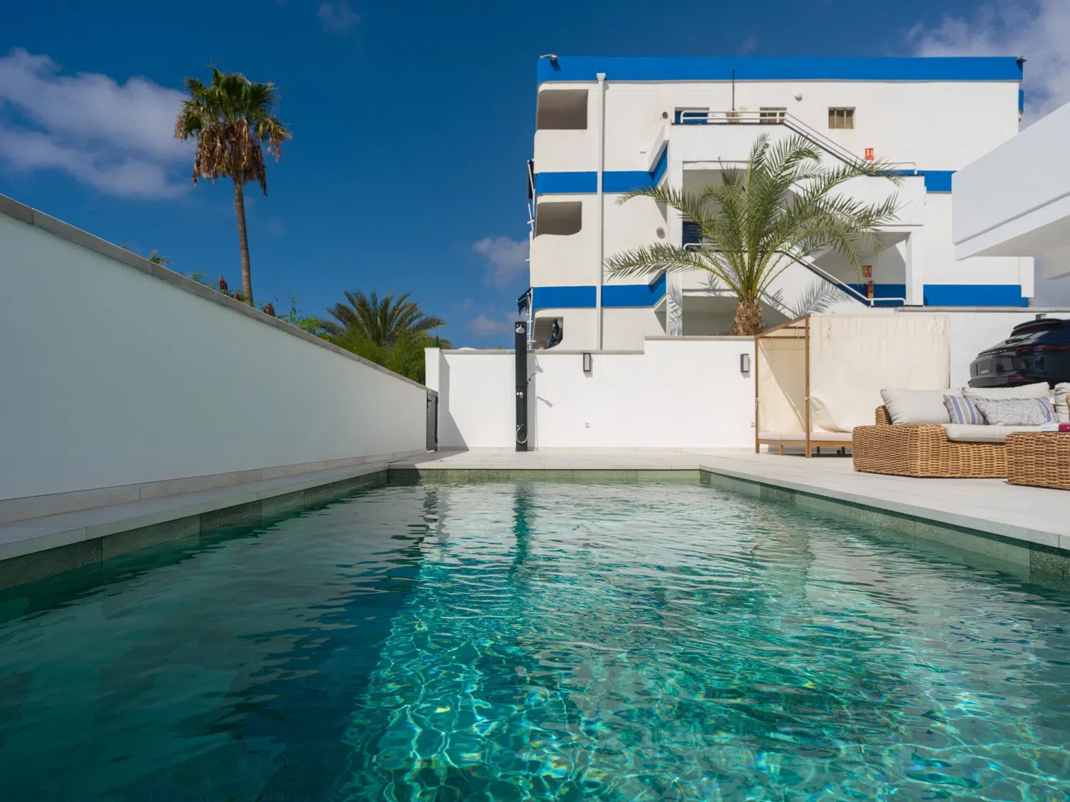 ☀️ Espaciosa terraza con piscina privada (5,80 x 3,00 x 1.40 m), cama balinesa, tumbonas, zona de comedor exterior con mesa y sillas 🍽️ y sofás exteriores para relajarse al aire libre.