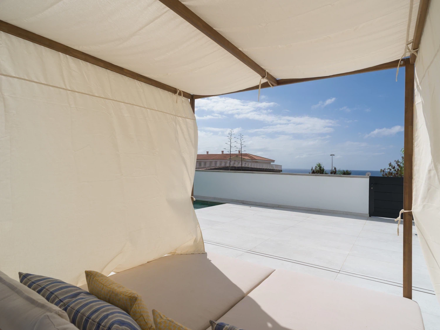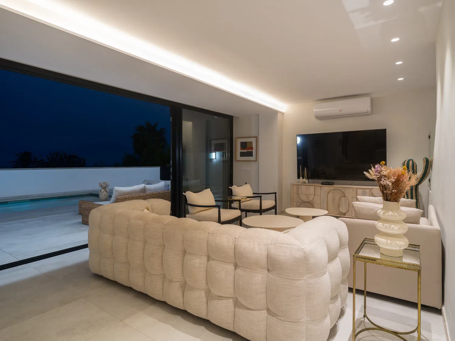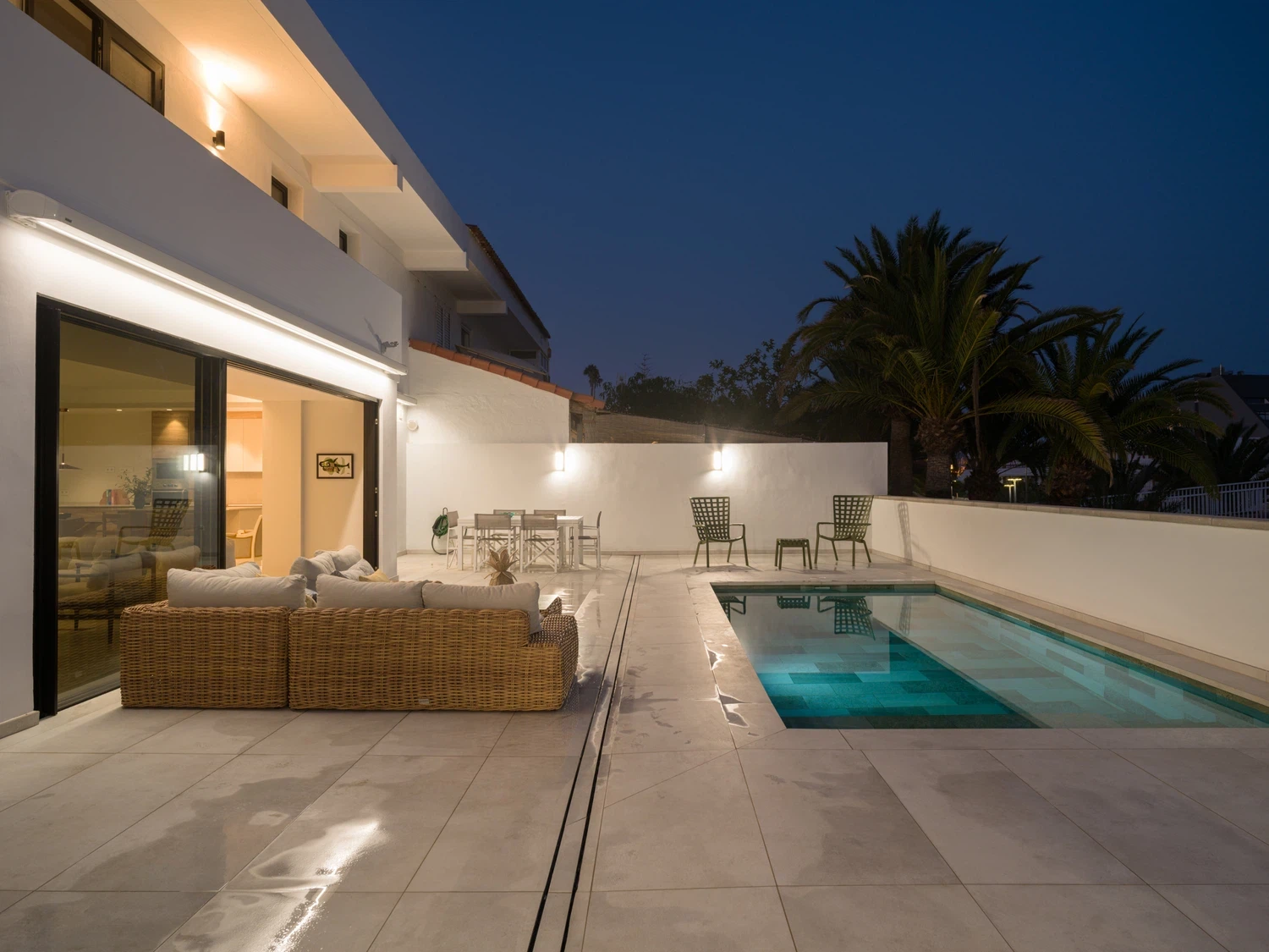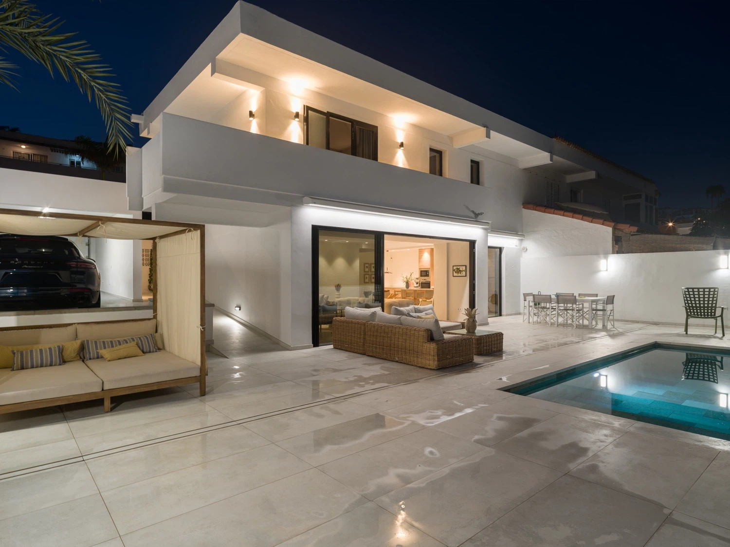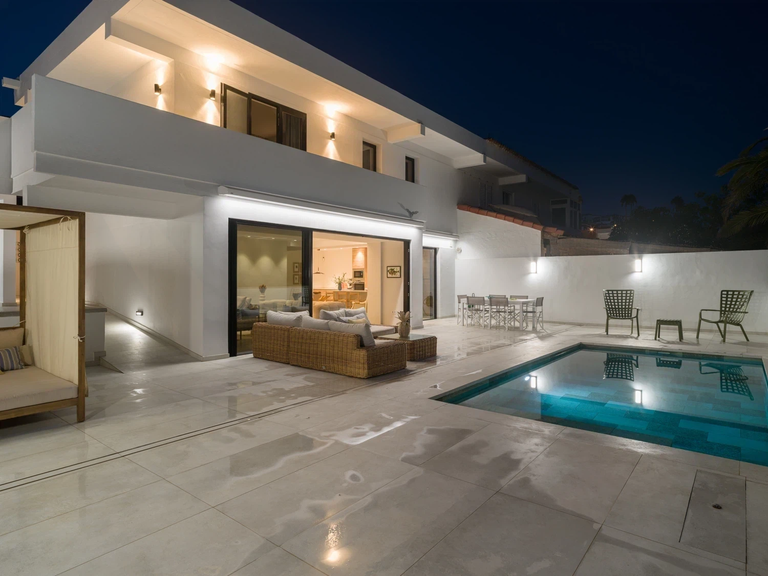 ☀️ Espaciosa terraza con piscina privada (5,80 x 3,00 x 1.40 m), cama balinesa, tumbonas, zona de comedor exterior con mesa y sillas 🍽️ y sofás exteriores para relajarse al aire libre.