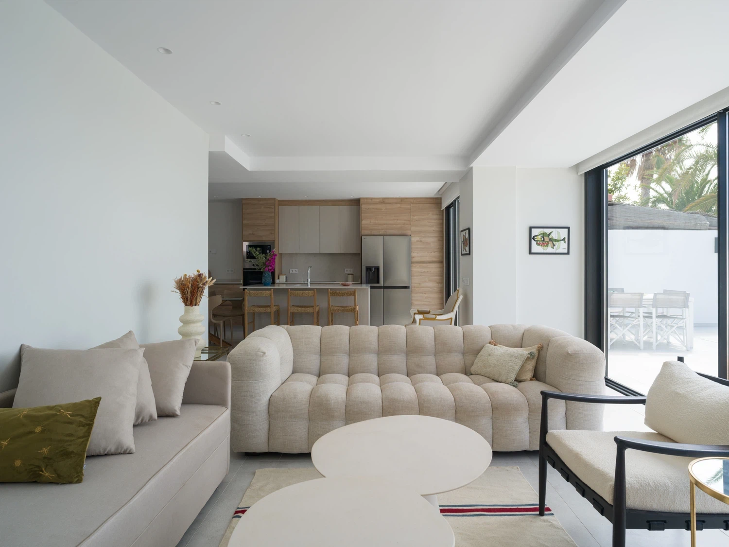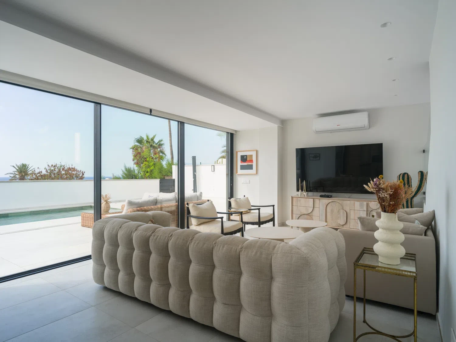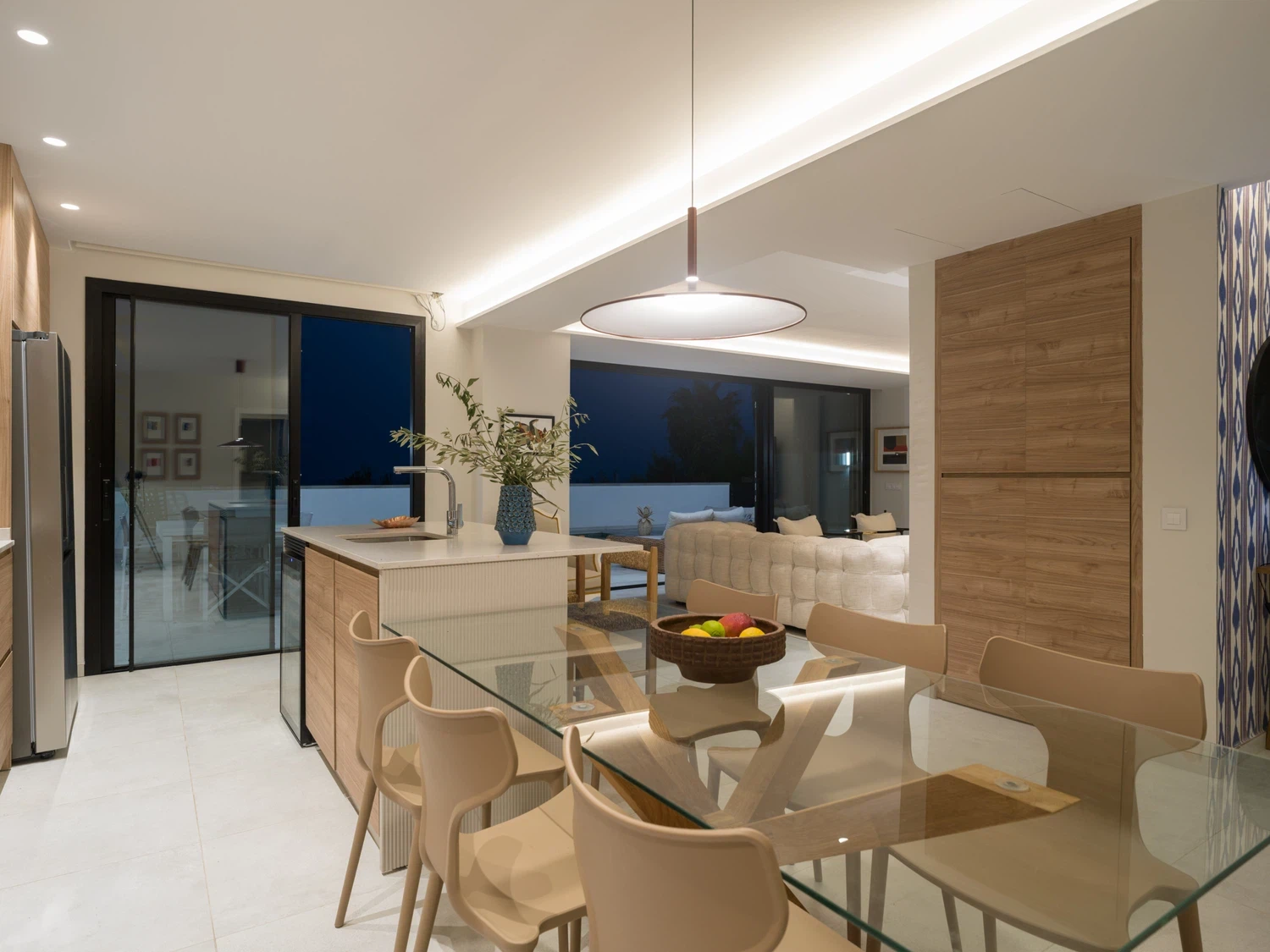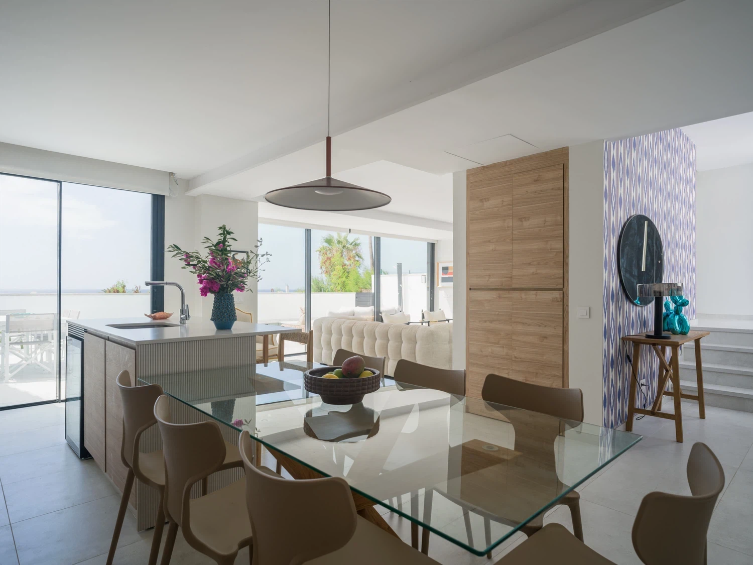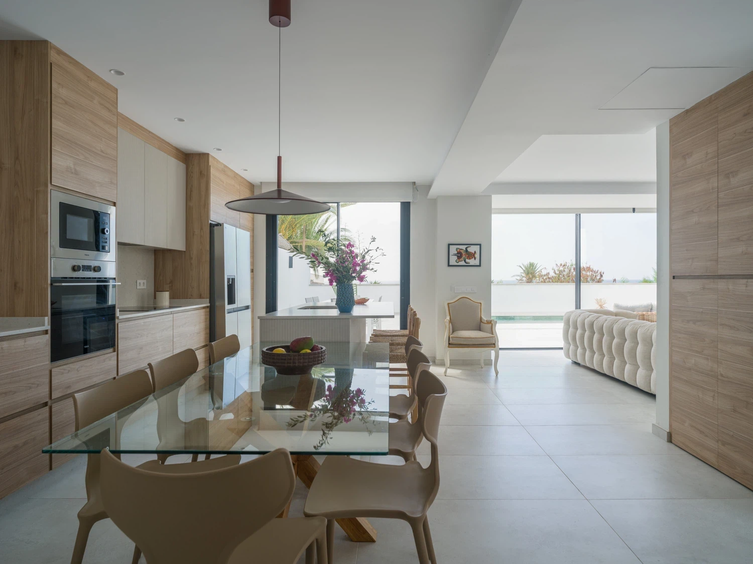 Salón-cocina integrado, con acceso directo a la terraza mediante grandes puertas correderas que permiten disfrutar de las vistas al mar 🌊. El salón incluye Smart TV de 65" con canales internacionales.