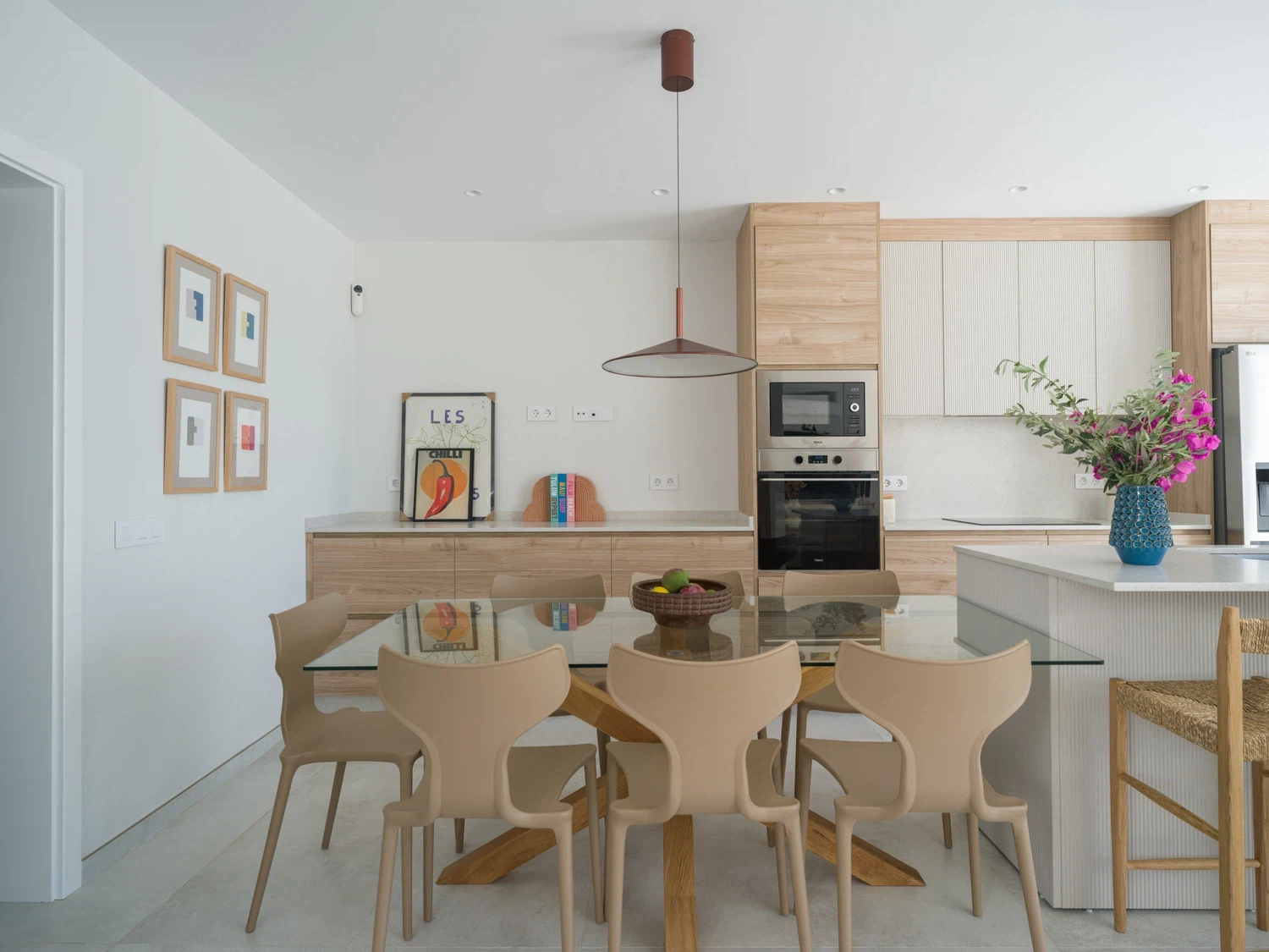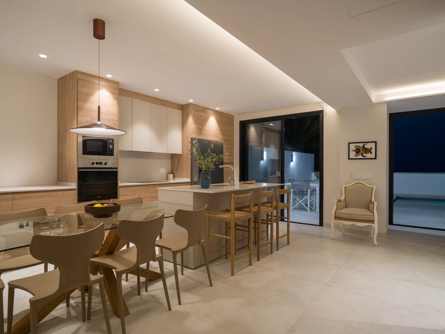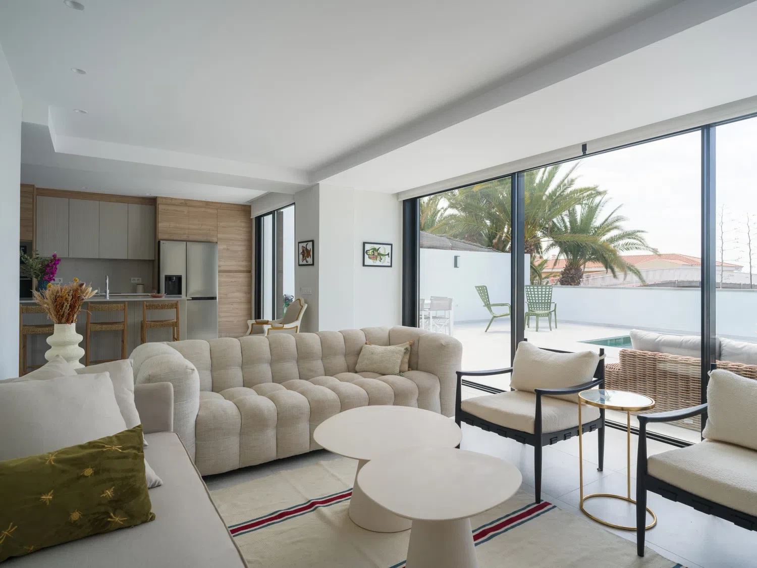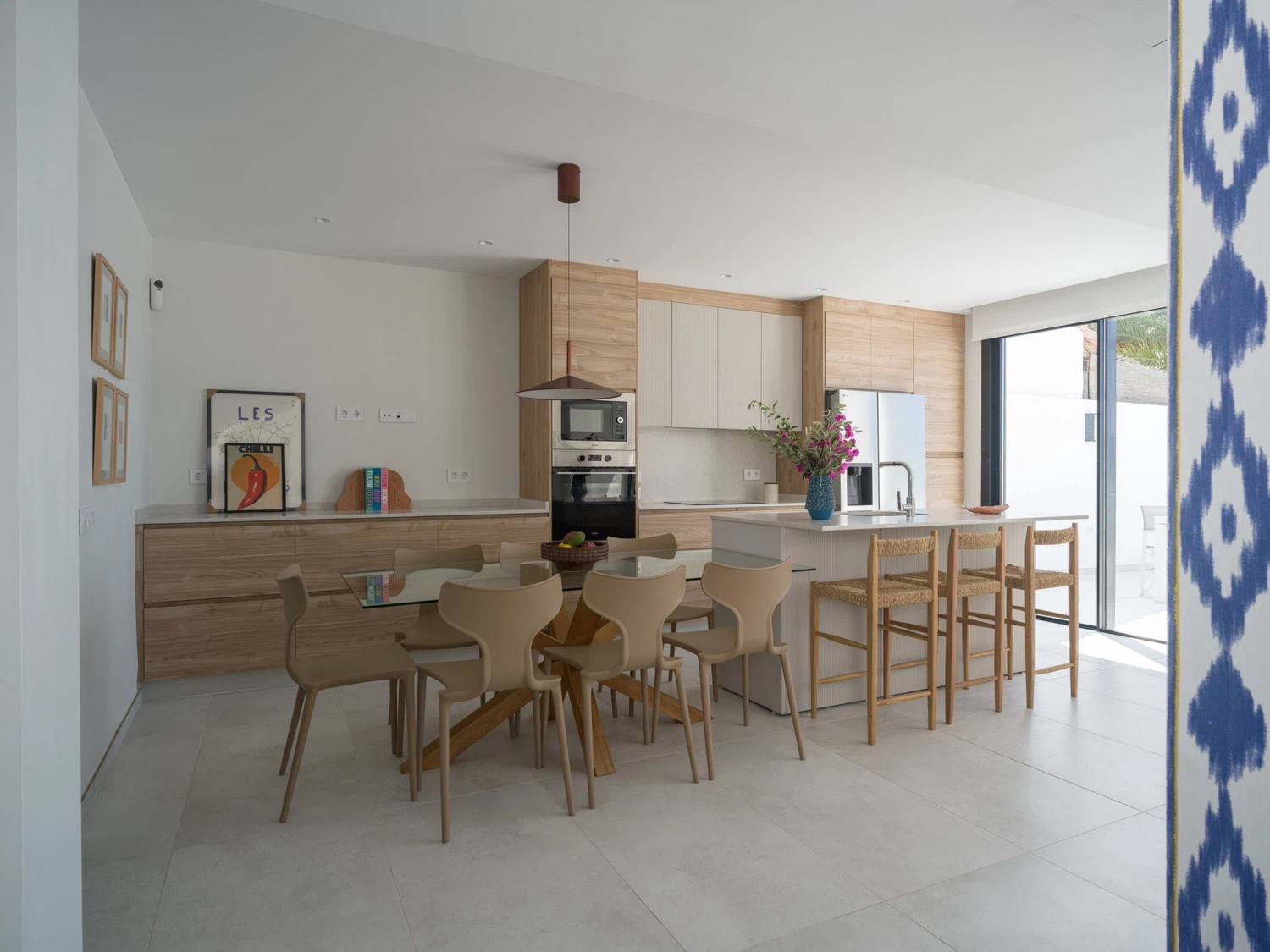 Salón-cocina integrado, con acceso directo a la terraza mediante grandes puertas correderas que permiten disfrutar de las vistas al mar 🌊. El salón incluye Smart TV de 65" con canales internacionales.