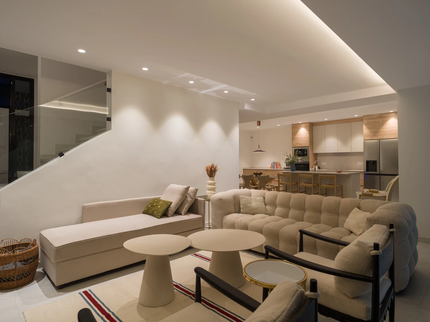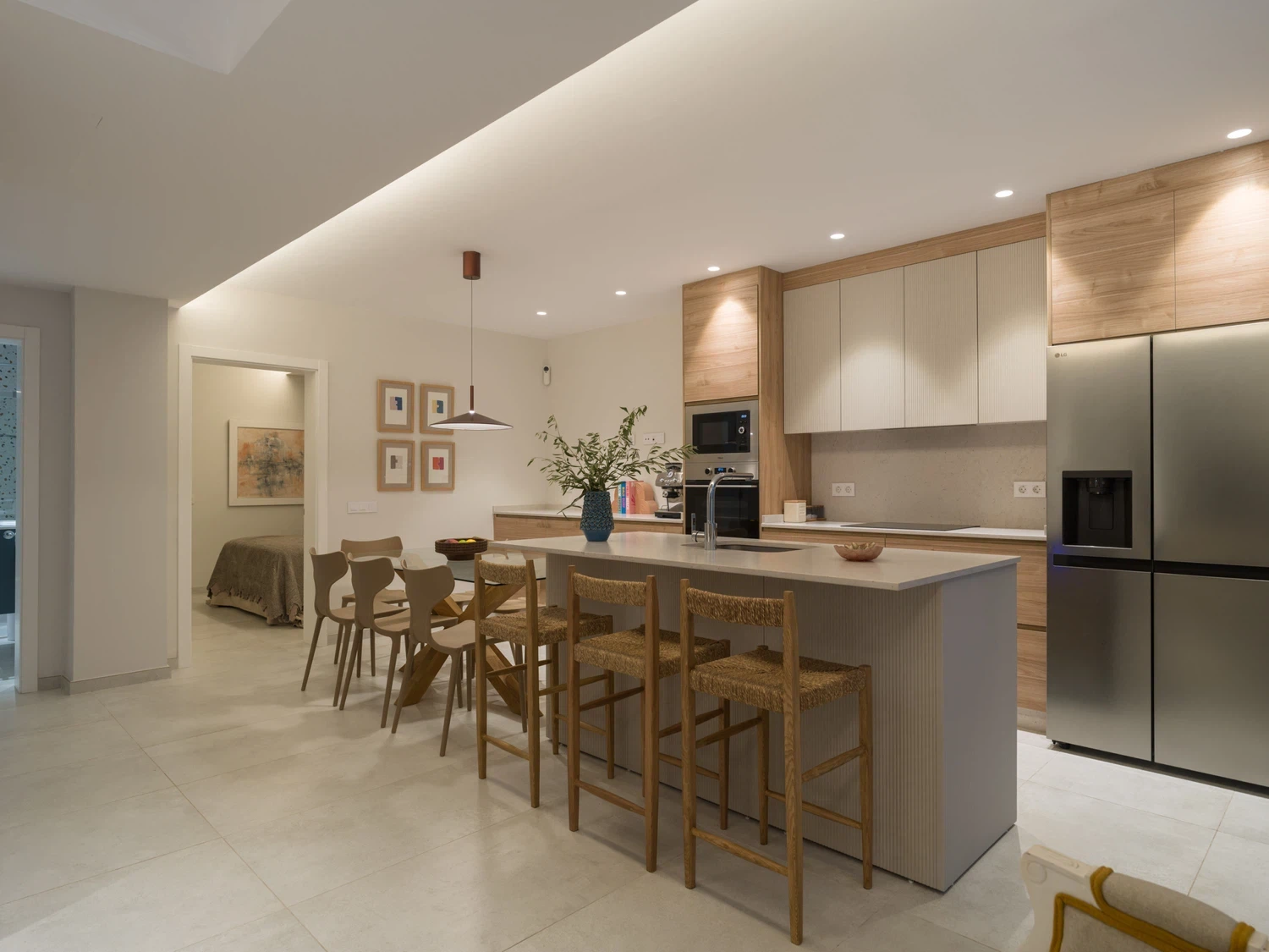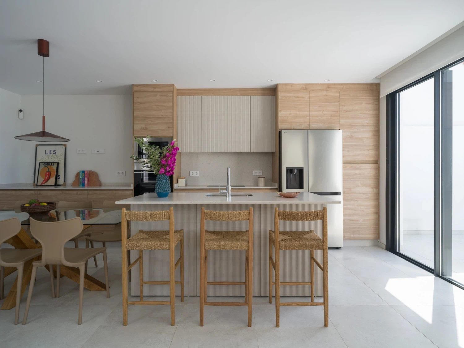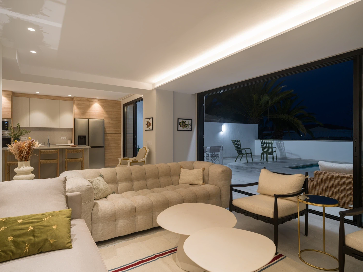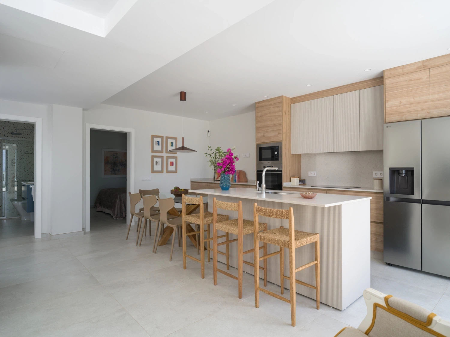 Salón-cocina integrado, con acceso directo a la terraza mediante grandes puertas correderas que permiten disfrutar de las vistas al mar 🌊. El salón incluye Smart TV de 65" con canales internacionales.