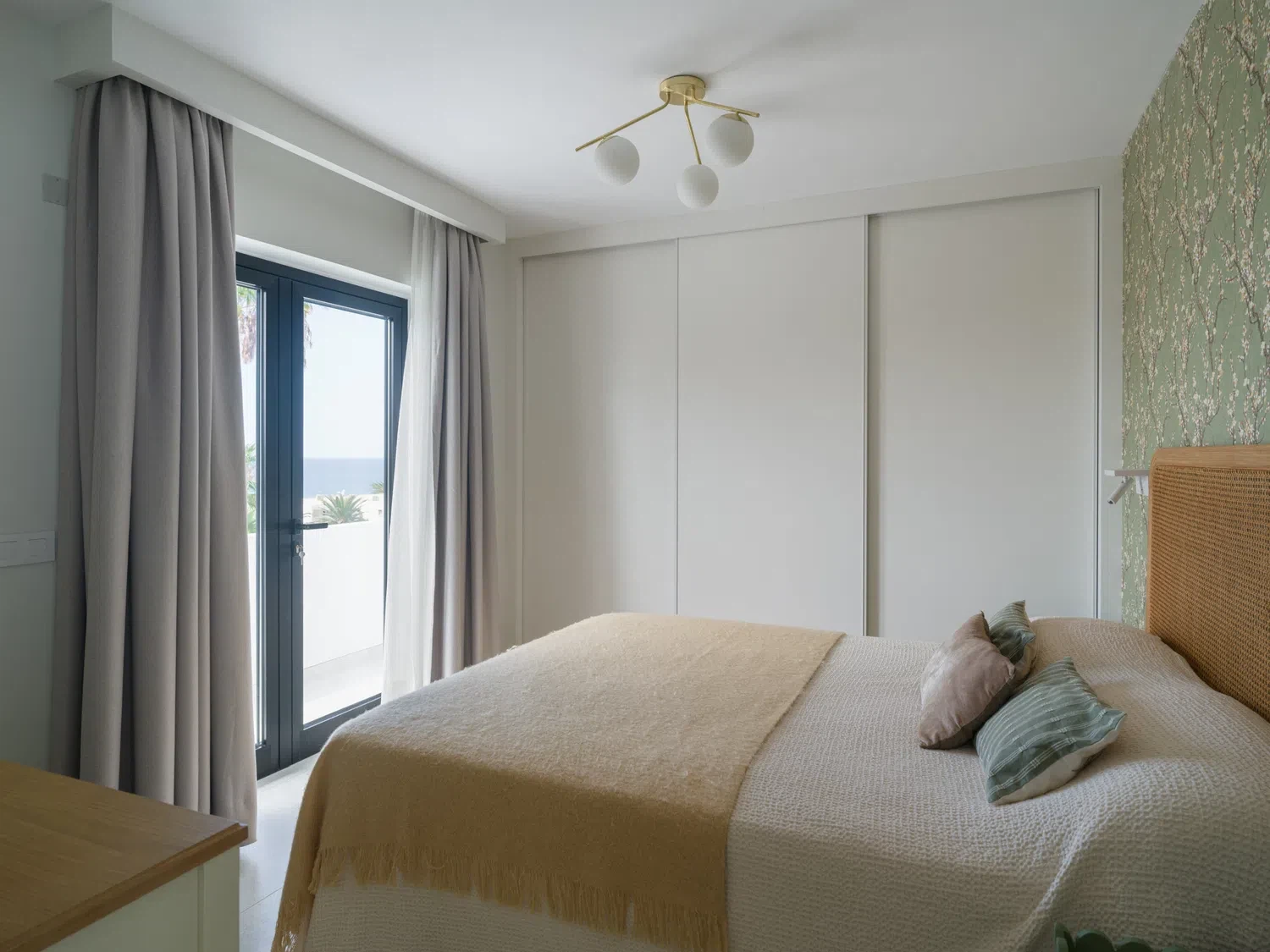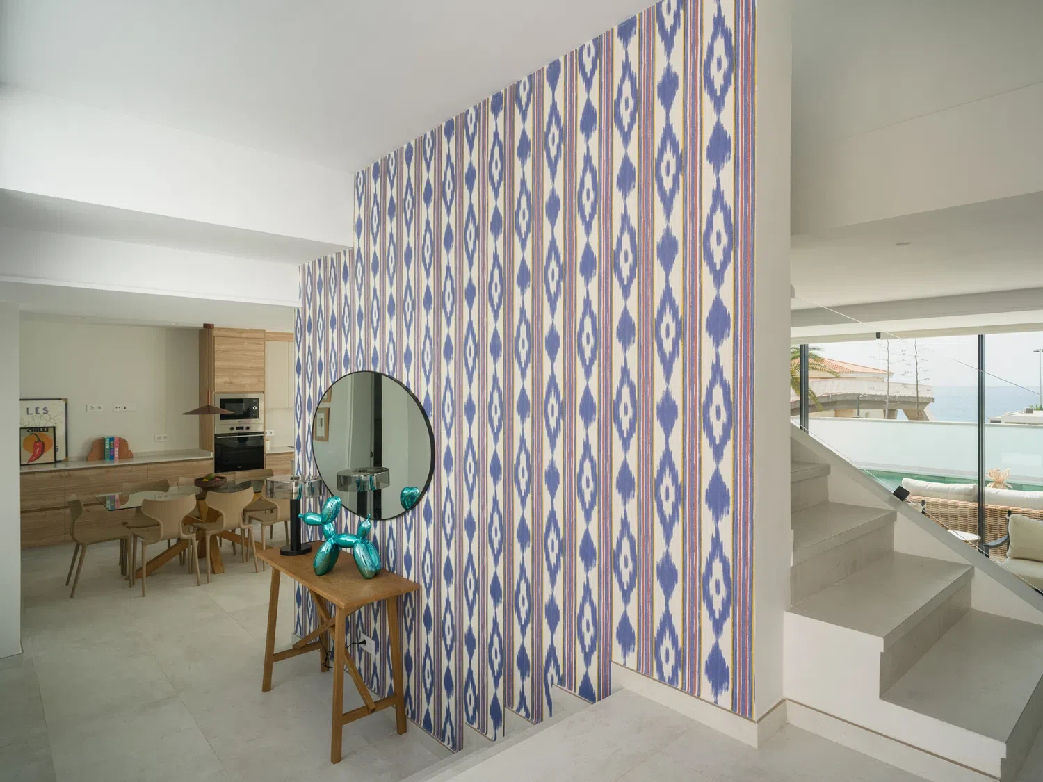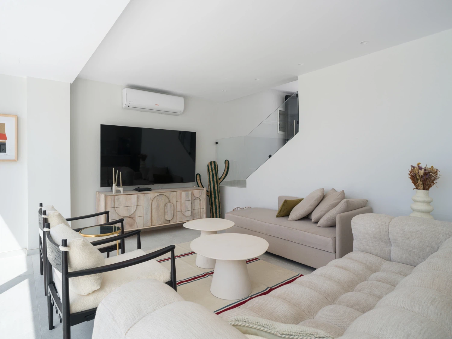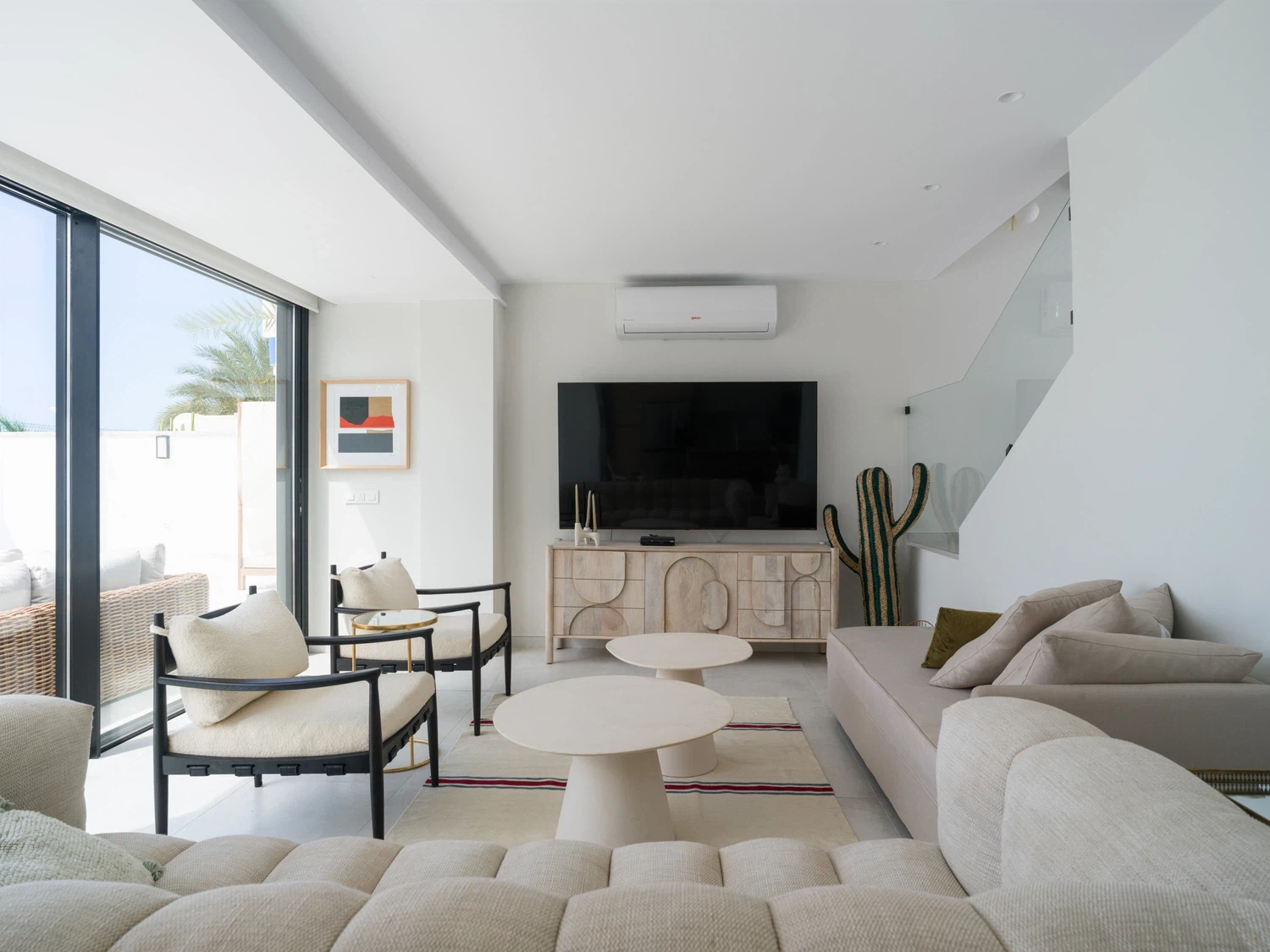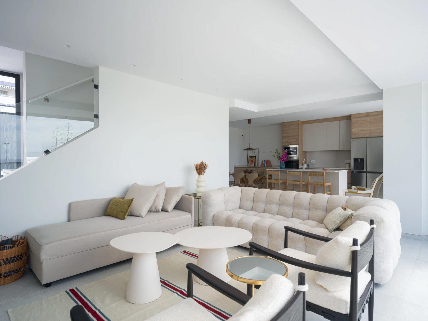 Salón-cocina integrado, con acceso directo a la terraza mediante grandes puertas correderas que permiten disfrutar de las vistas al mar 🌊. El salón incluye Smart TV de 65" con canales internacionales.