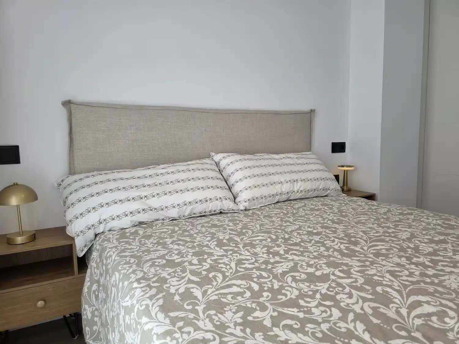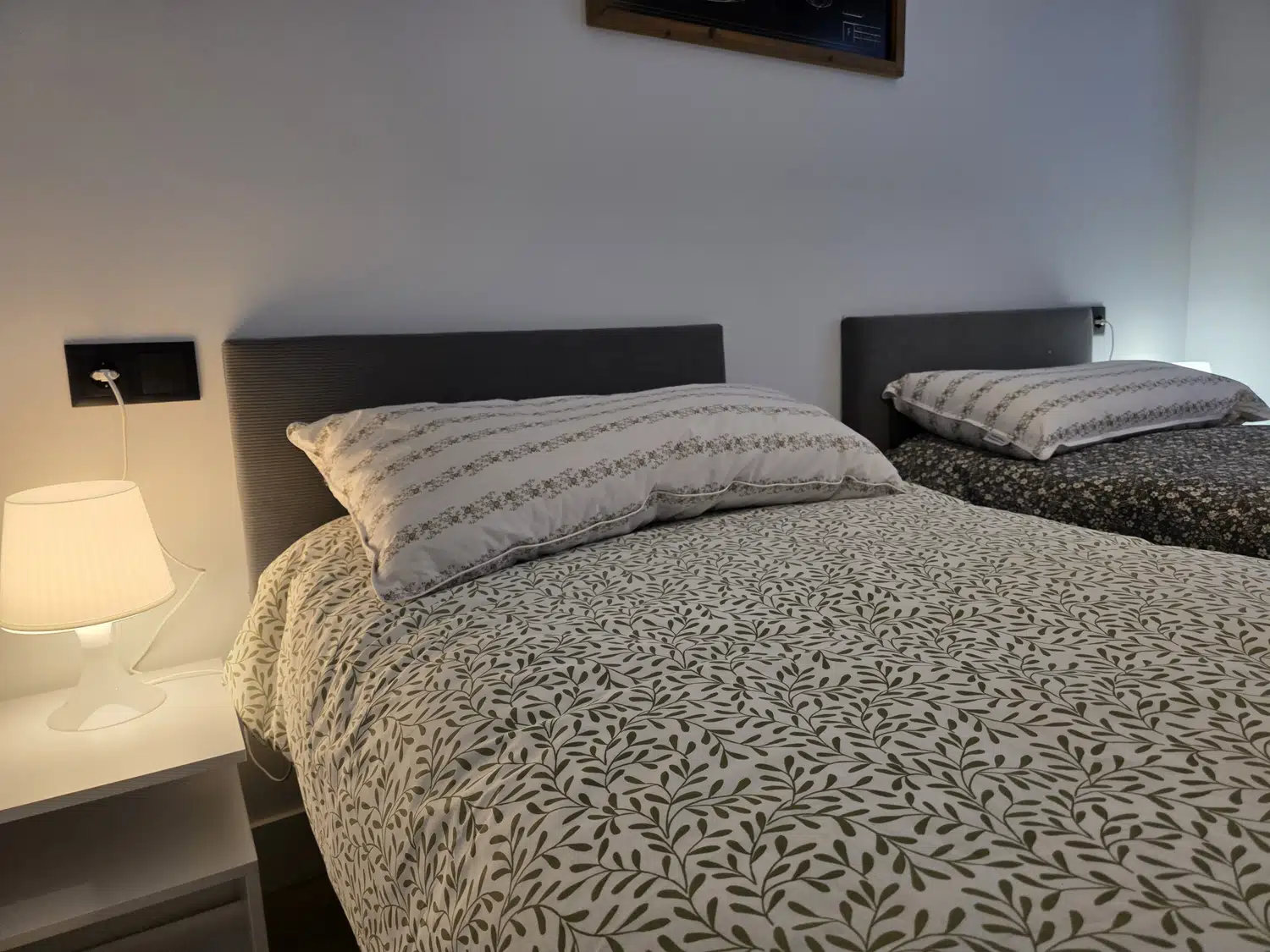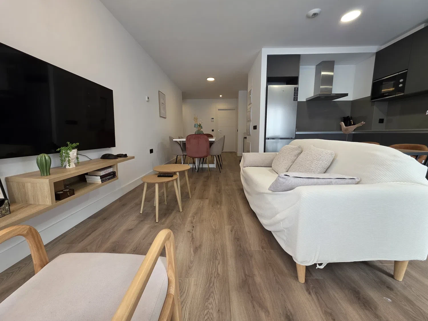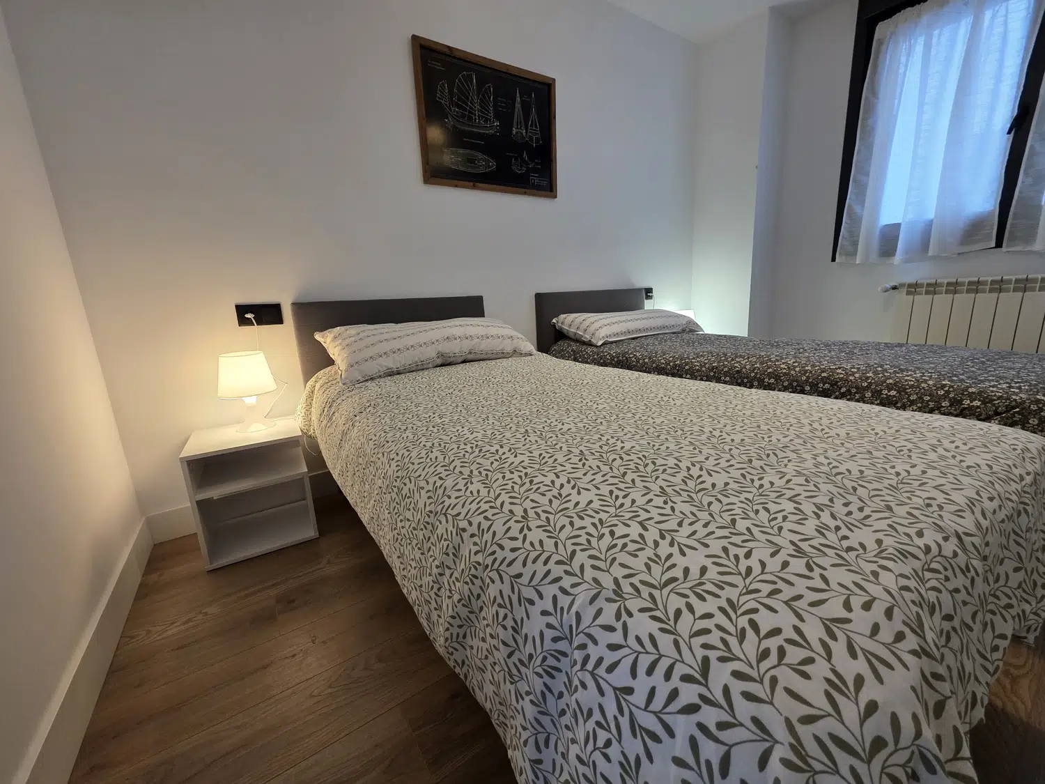 Cuenta con 3 dormitorios: uno con cama de 150cm y baño en suite, otro con dos camas individuales y otro con cama nido convertible a 160cm. Salón-cocina abiertos y un baño adicional completo.