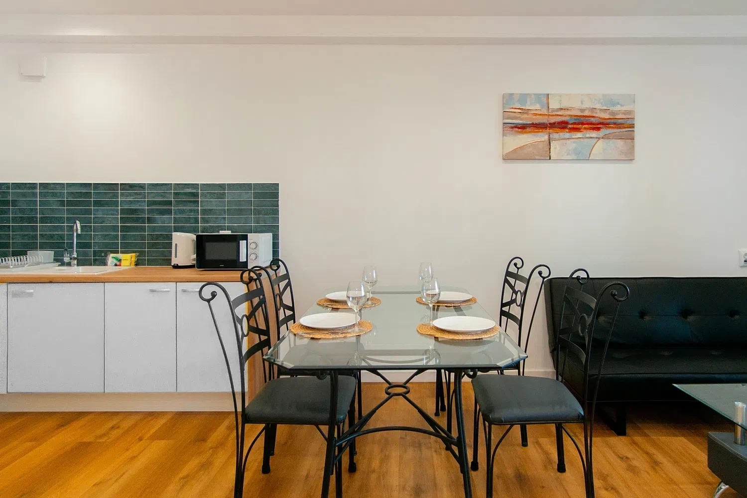Salón espacioso, lleno de calor y luz, equipado con un sofá cama, televisor y zona de comedor, donde se puede reunir toda la compañía para una deliciosa cena. La cocina completamente equipada permite preparar cualquier plato, creando una atmósfera de confort hogareño. Desde la sala de estar hay una salida a la terraza, donde se puede disfrutar del café de la mañana o del té de la tarde, deleitándose con el aire fresco.