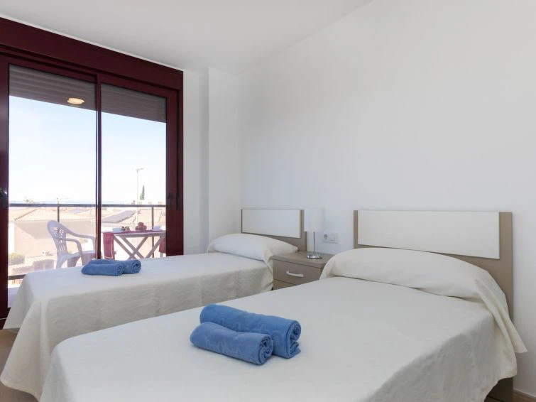"Barco 3", apartamento de 3 estancias 63 m2 en el 2° piso. Con mobiliario funcional: salón-comedor con mesa de comedor, TV digital, aire acondicionado y bomba de calor, caliente. Salida a la terraza. 1 dorm. con 1 cama de matrimonio (1 x 135 cm, 190 cm de longitud), aire acondicionado y bomba de calor, caliente. 1 dorm. con 2 camas (90 cm, 190 cm de longitud), aire acondicionado y bomba de calor, caliente. Cocina abierta (horno, lavavajillas, 4 placas de vitrocerámica, tostadora, microondas, congelador, cafetera eléctrica) con barra americana, calentador (80 litros). Ducha/WC. Aire caliente. Terraza. Muebles de terraza. Vista lateral al mar y a la piscina. El alojamiento dispone de: lavadora, plancha, secador de pelo. Internet (Wifi, gratis). Plaza de aparcamiento n. 3. A tener en cuenta: TV solamente ES. VT-43972CS