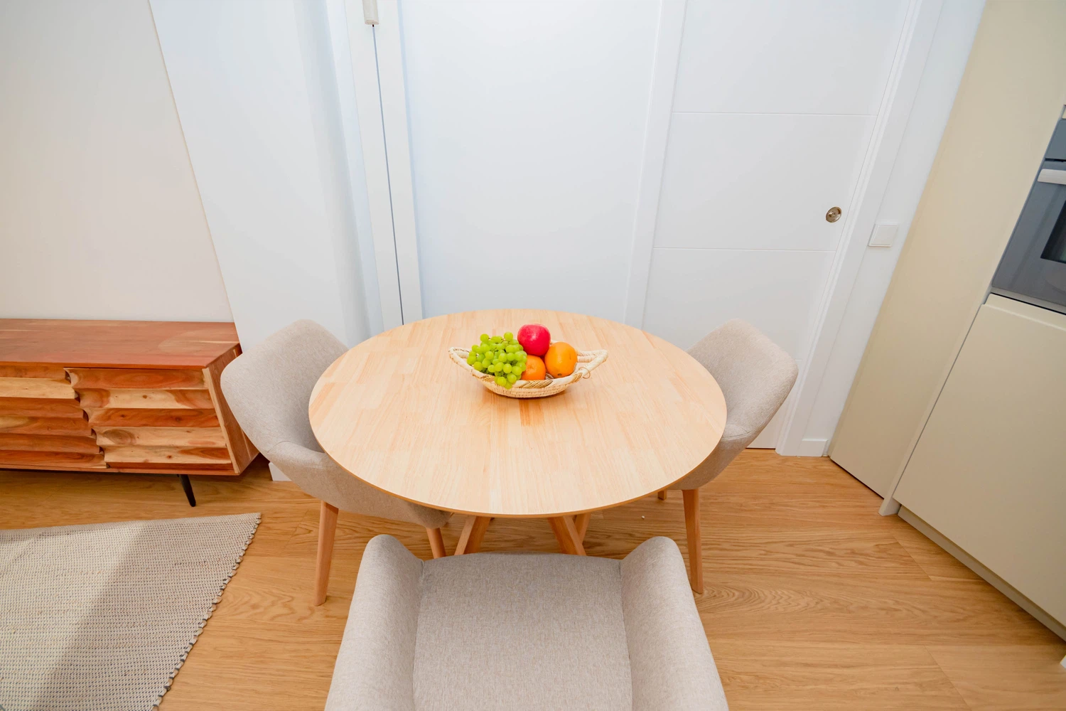 El salón es amplio y luminoso, con un sofá cama individual, una mesa de centro y una televisión de pantalla plana. Además, cuenta con una mesa de comedor con capacidad para cuatro personas, perfecta para disfrutar de tus comidas favoritas.