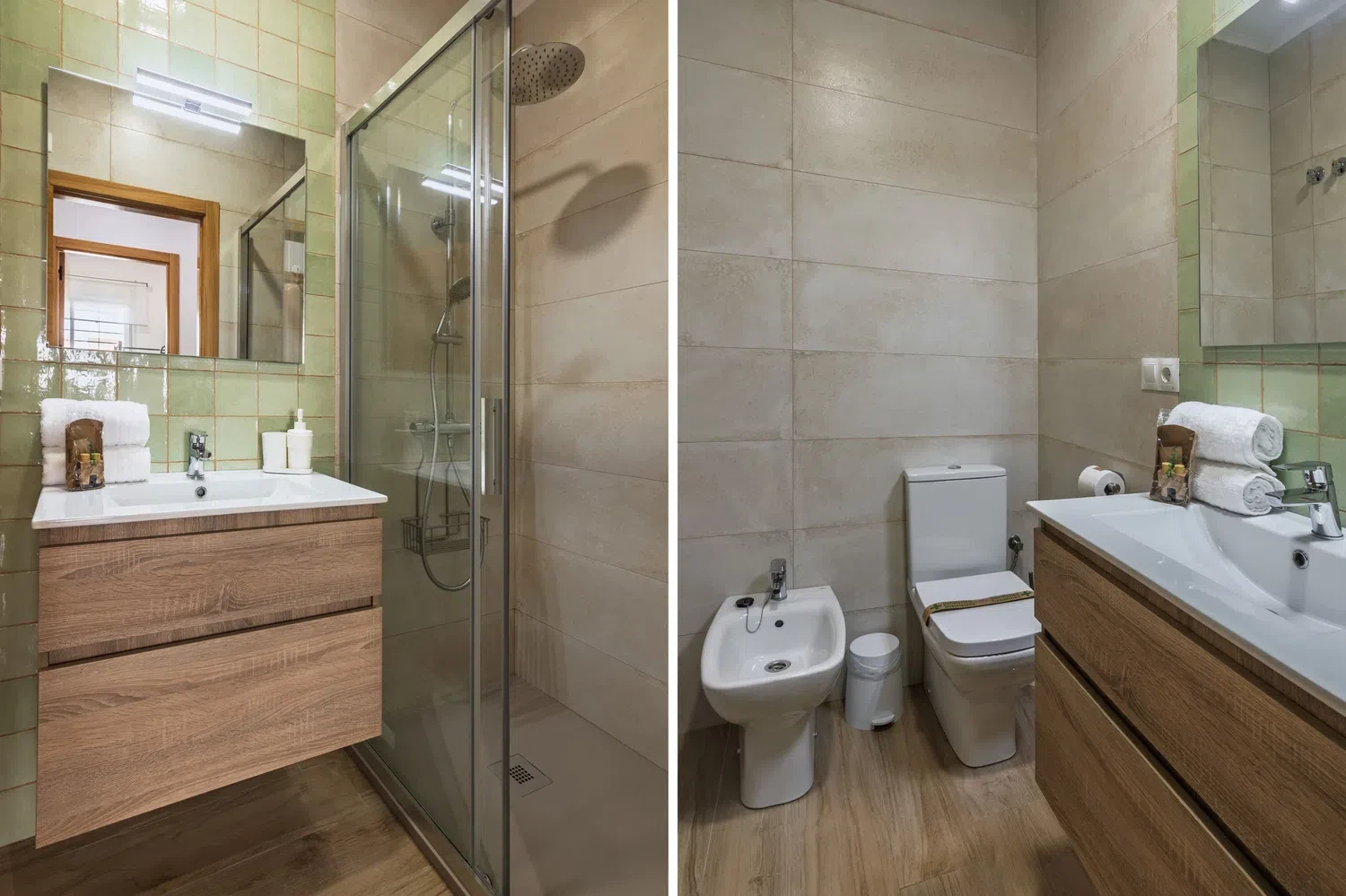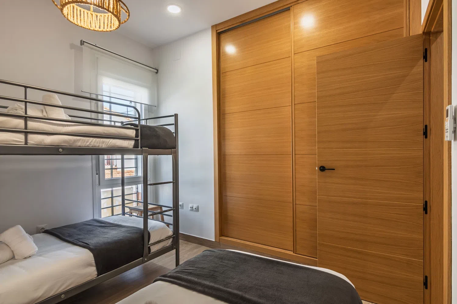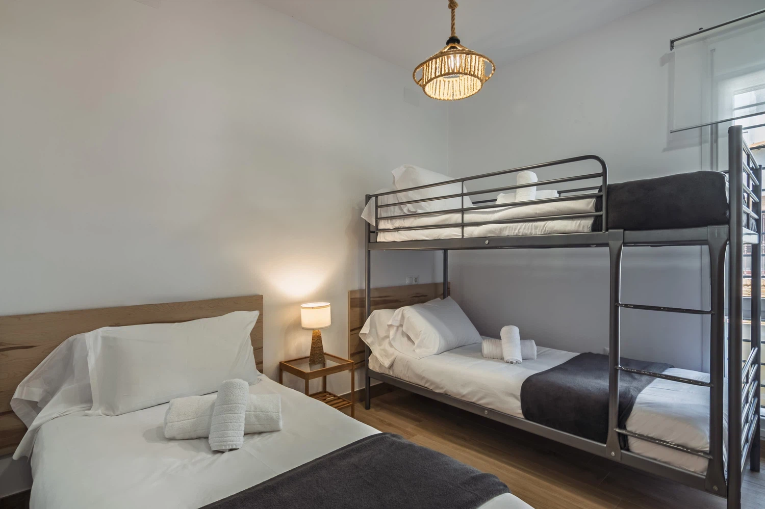 El apartamento cuenta con dos dormitorios bien distribuidos: una cama doble, una cama individual y una litera, ideal para grupos pequeños o familias con niños. Dispone de dos baños completos con ducha, lo que facilita la convivencia y la privacidad de los huéspedes.