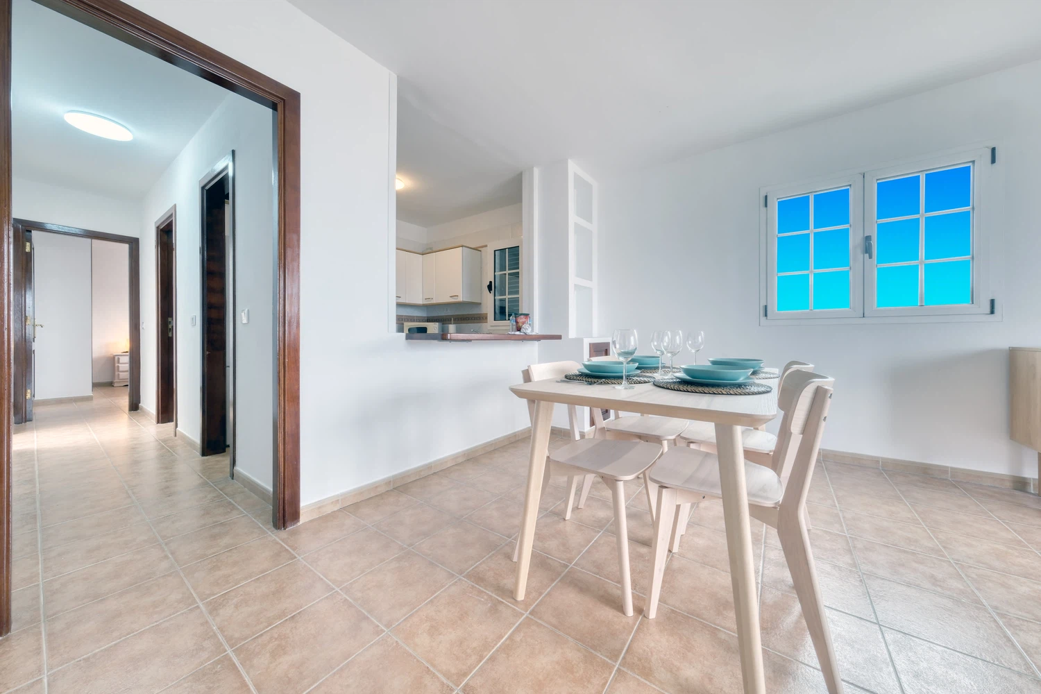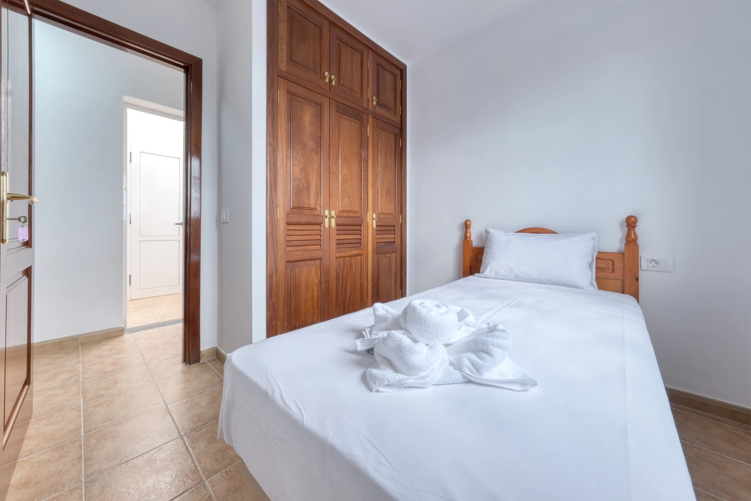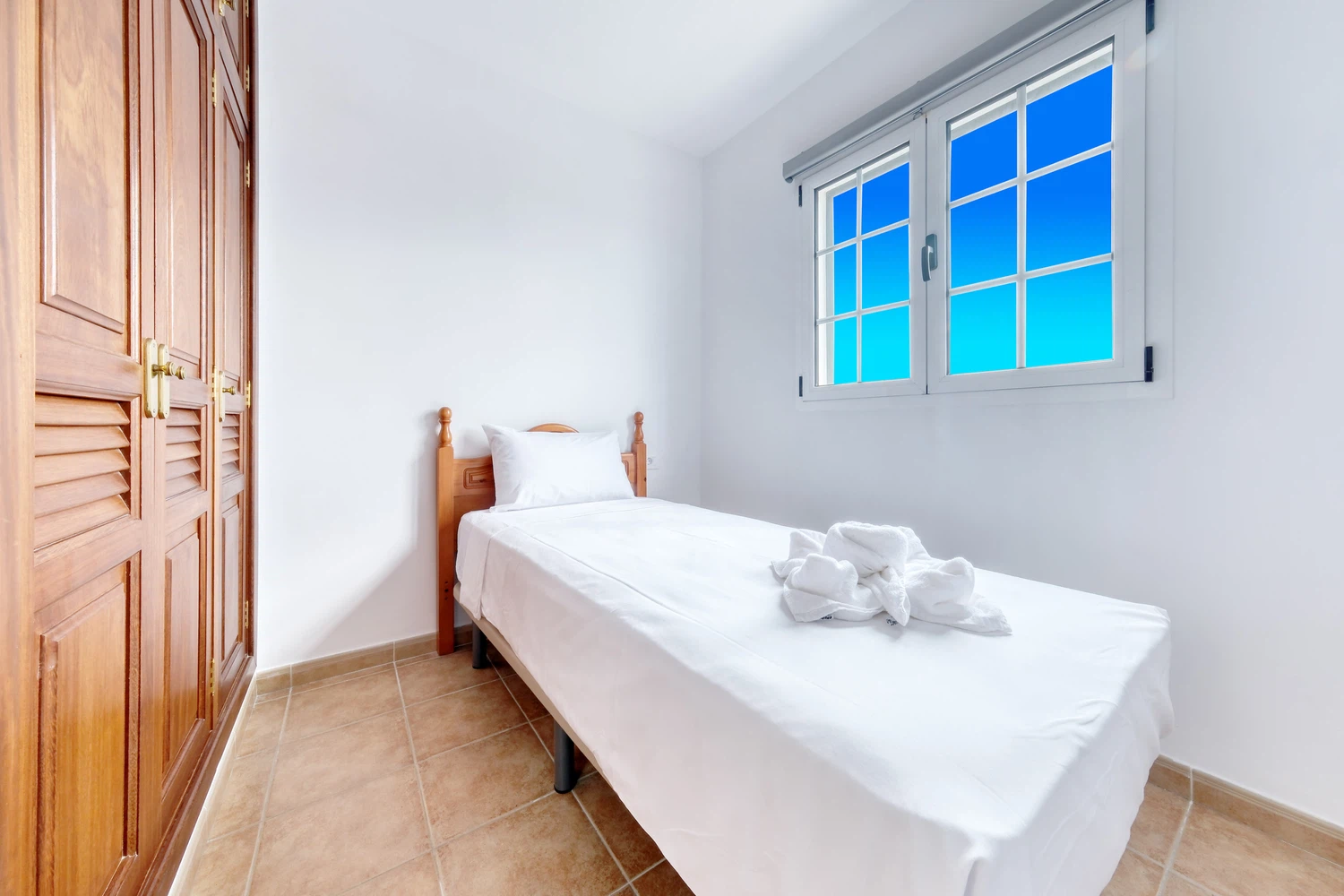 La distribución incluye 2 dormitorios luminosos: uno con una cama individual y otro con dos camas individuales que, bajo petición, pueden convertirse en una cama de matrimonio. Ambos cuentan con armarios empotrados. Además, la vivienda dispone de un baño con ducha y lavadora para mayor comodidad.