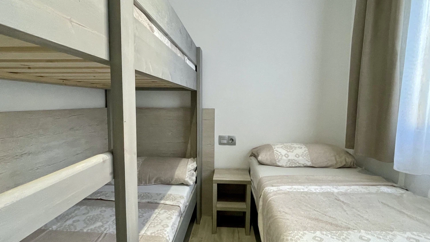 Este luminoso apartamento de 65 metros cuadrados ofrece alojamiento cómodo para hasta 7 personas, ideal para familias que buscan una escapada relajante. Cuenta con 2 dormitorios equipados con 6 camas: 3 individuales, 2 literas y 1 sofá-cama doble, garantizando un descanso reparador para todos.