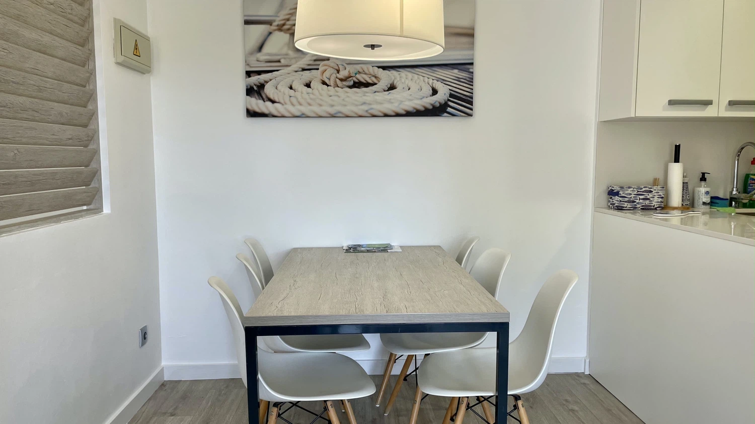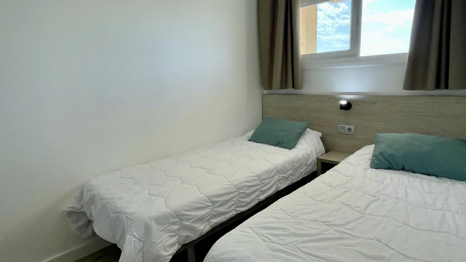 El apartamento cuenta con dos dormitorios bien distribuidos, que incluyen una cama doble y cuatro camas individuales, garantizando un descanso cómodo para todos los huéspedes. La zona de estar integrada con la cocina americana permite una convivencia fluida y agradable.