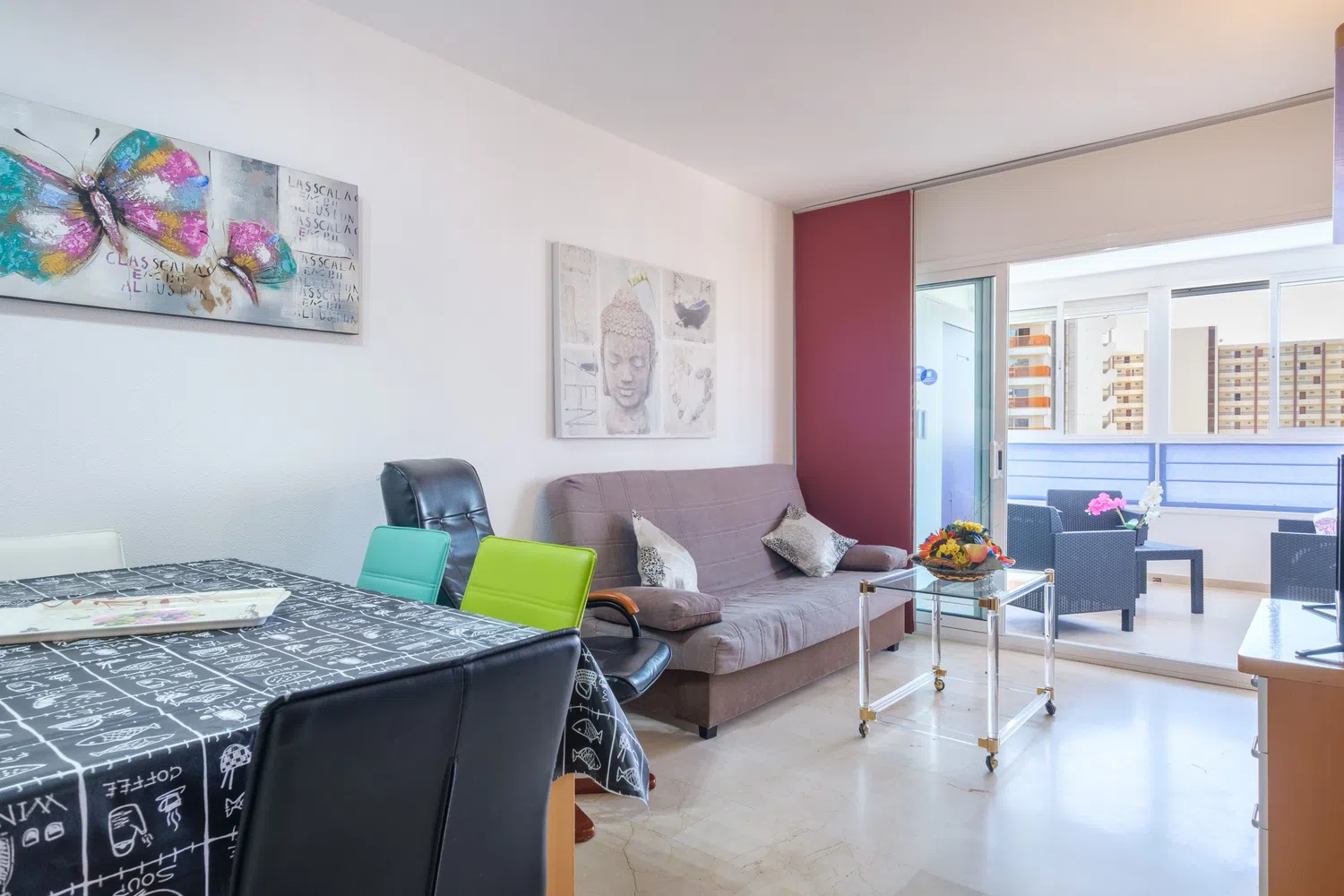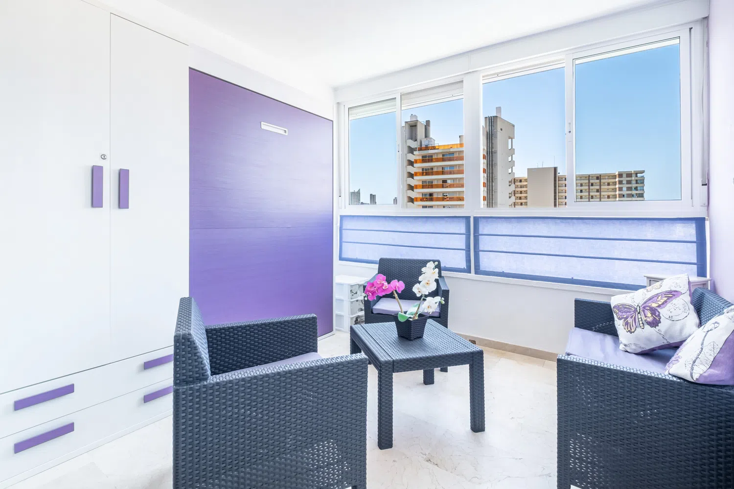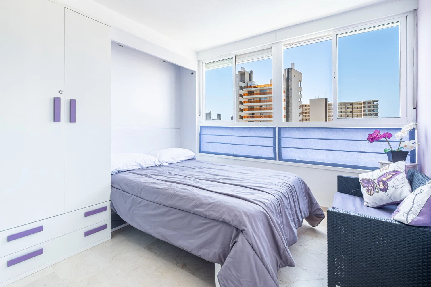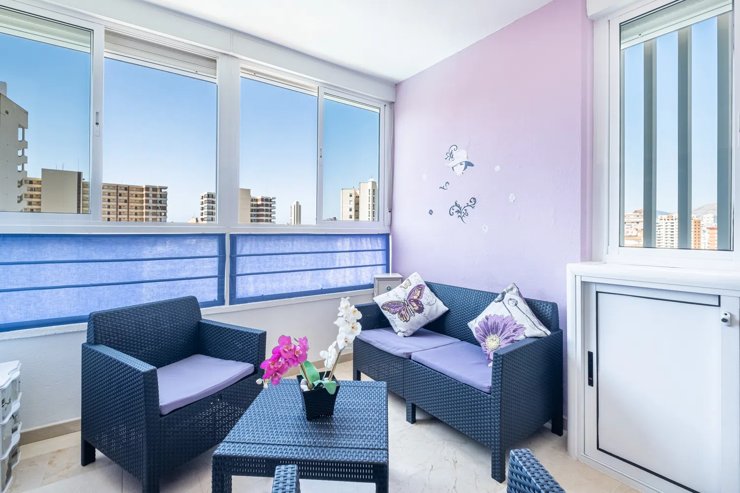 Apartamento en Levante, Benidorm, totalmente equipado de menaje, electrodomésticos y mobiliario para unas fantásticas vacaciones. Ubicado en la planta 15, cuenta con 1 dormitorio doble con cama de matrimonio y armario empotrado, cuarto de baño completo con bañera y secador de pelo, cocina independiente totalmente equipada y con galería, salón comedor con sofá cama doble, T.V Smart TV, wifi de alta velocidad por fibra, terraza acristalada con cama abatible doble para convertirla por las noches en el segundo dormitorio y comedor exterior.