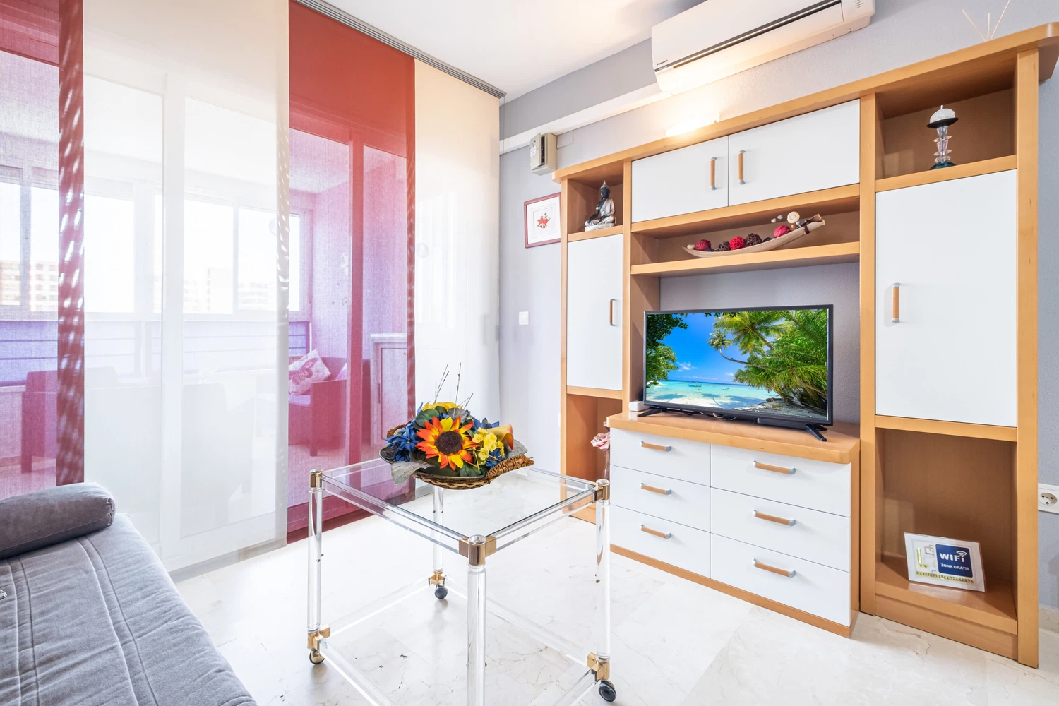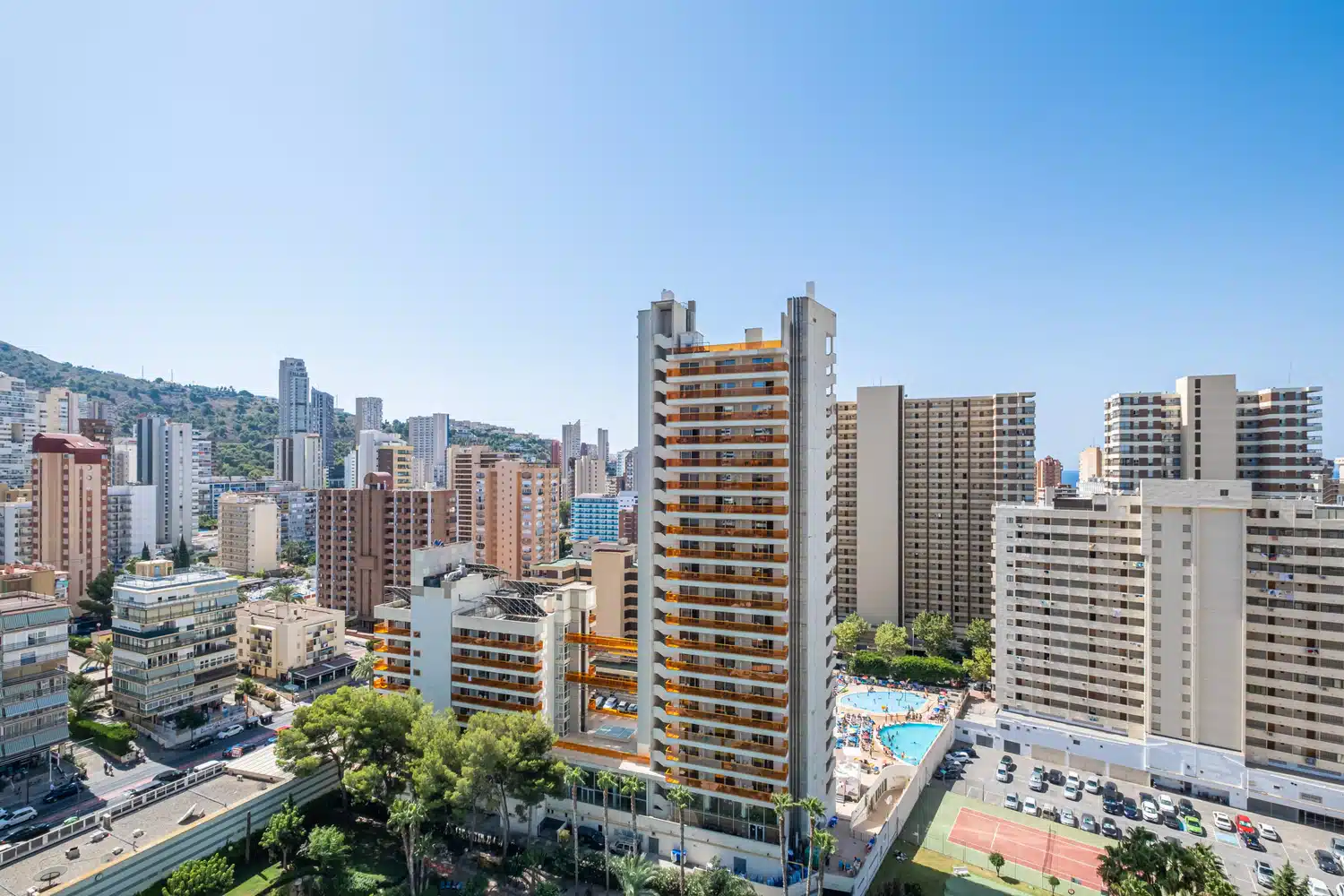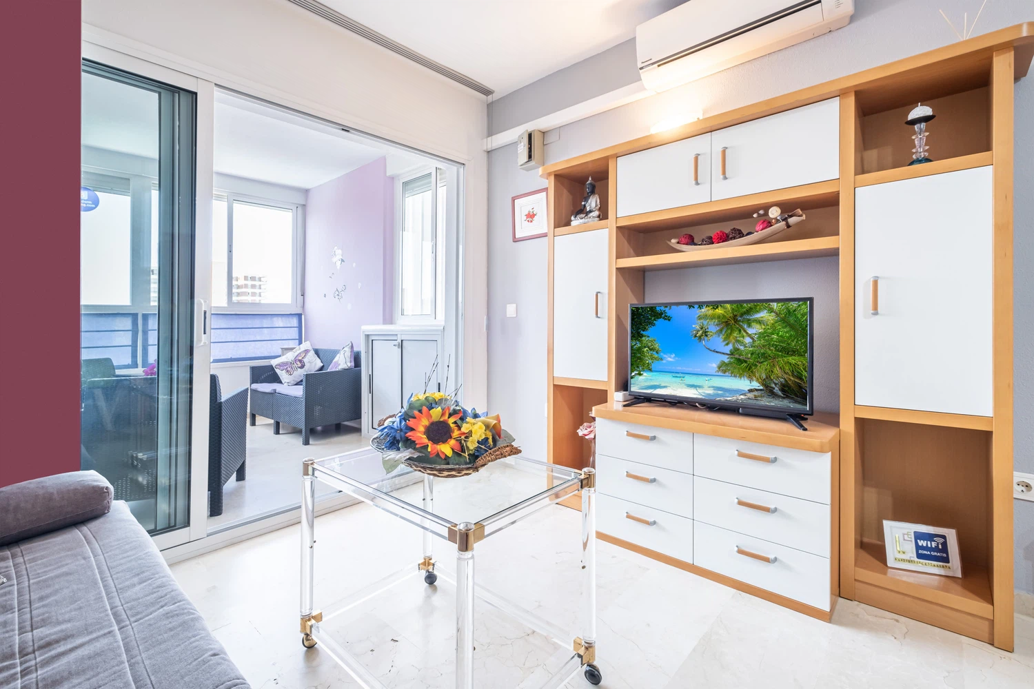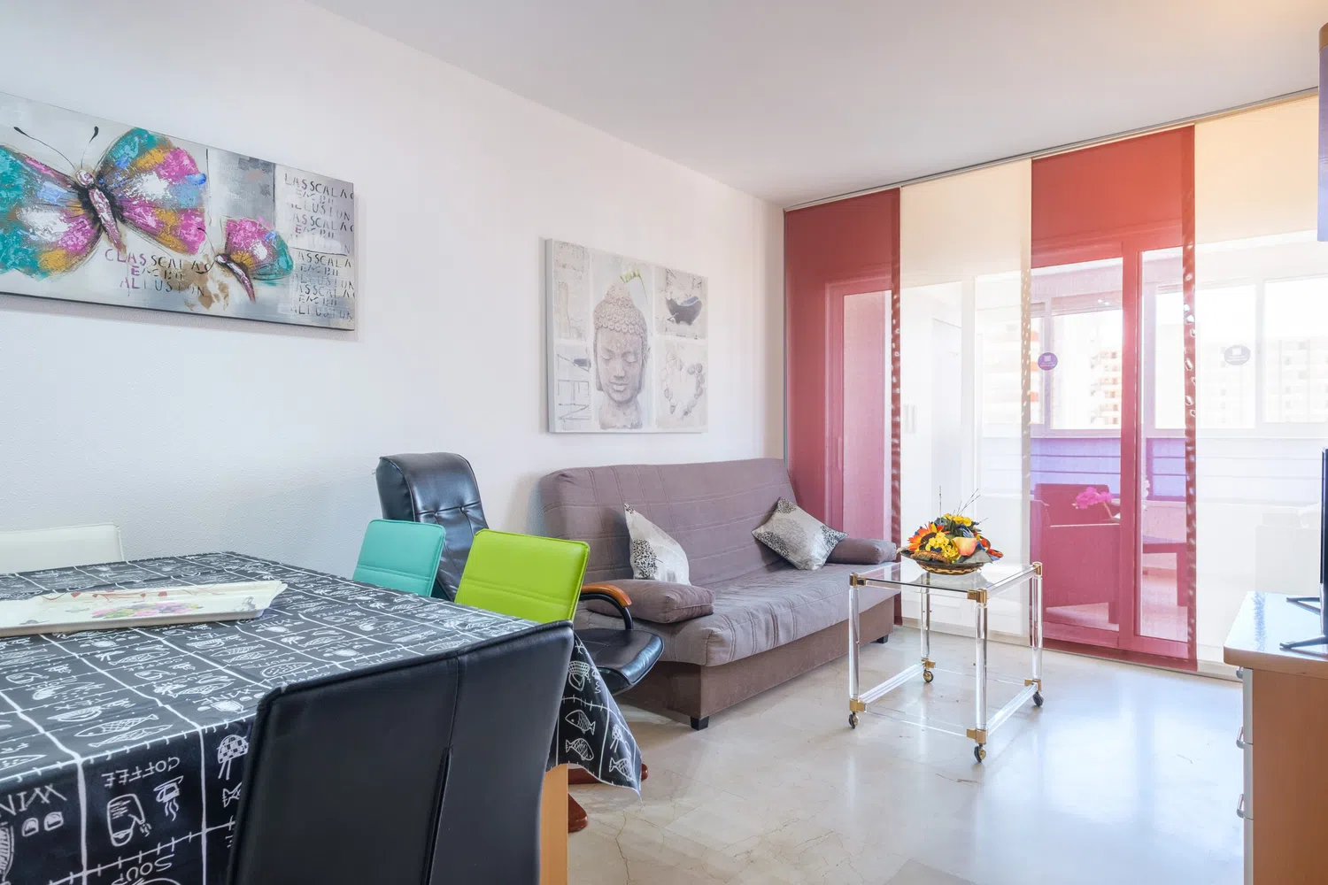 Apartamento en Levante, Benidorm, totalmente equipado de menaje, electrodomésticos y mobiliario para unas fantásticas vacaciones. Ubicado en la planta 15, cuenta con 1 dormitorio doble con cama de matrimonio y armario empotrado, cuarto de baño completo con bañera y secador de pelo, cocina independiente totalmente equipada y con galería, salón comedor con sofá cama doble, T.V Smart TV, wifi de alta velocidad por fibra, terraza acristalada con cama abatible doble para convertirla por las noches en el segundo dormitorio y comedor exterior.