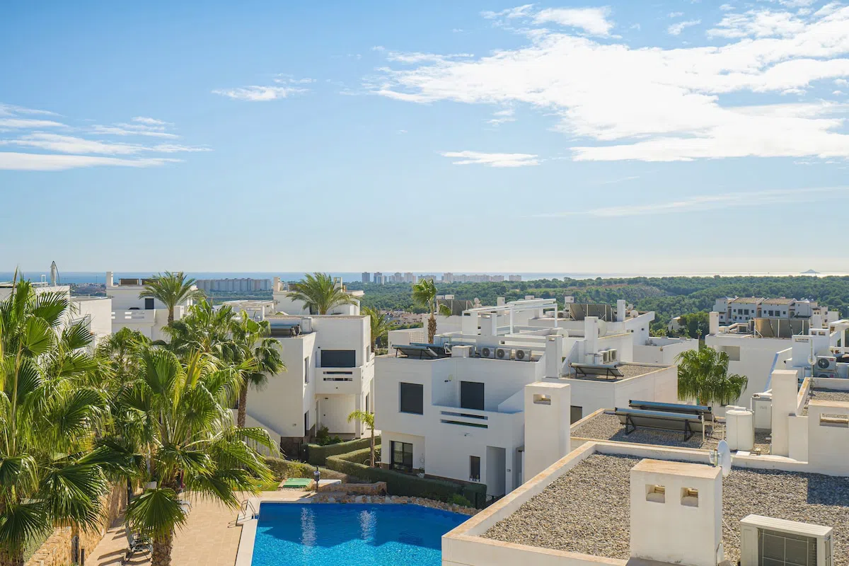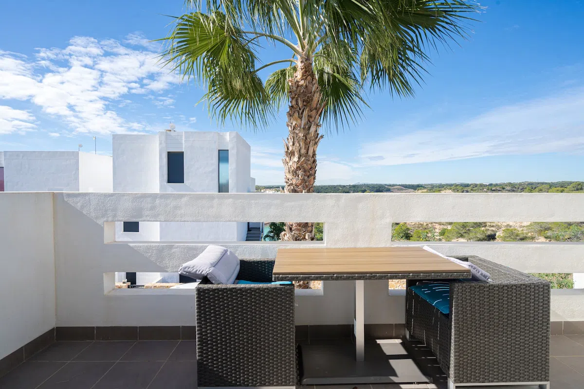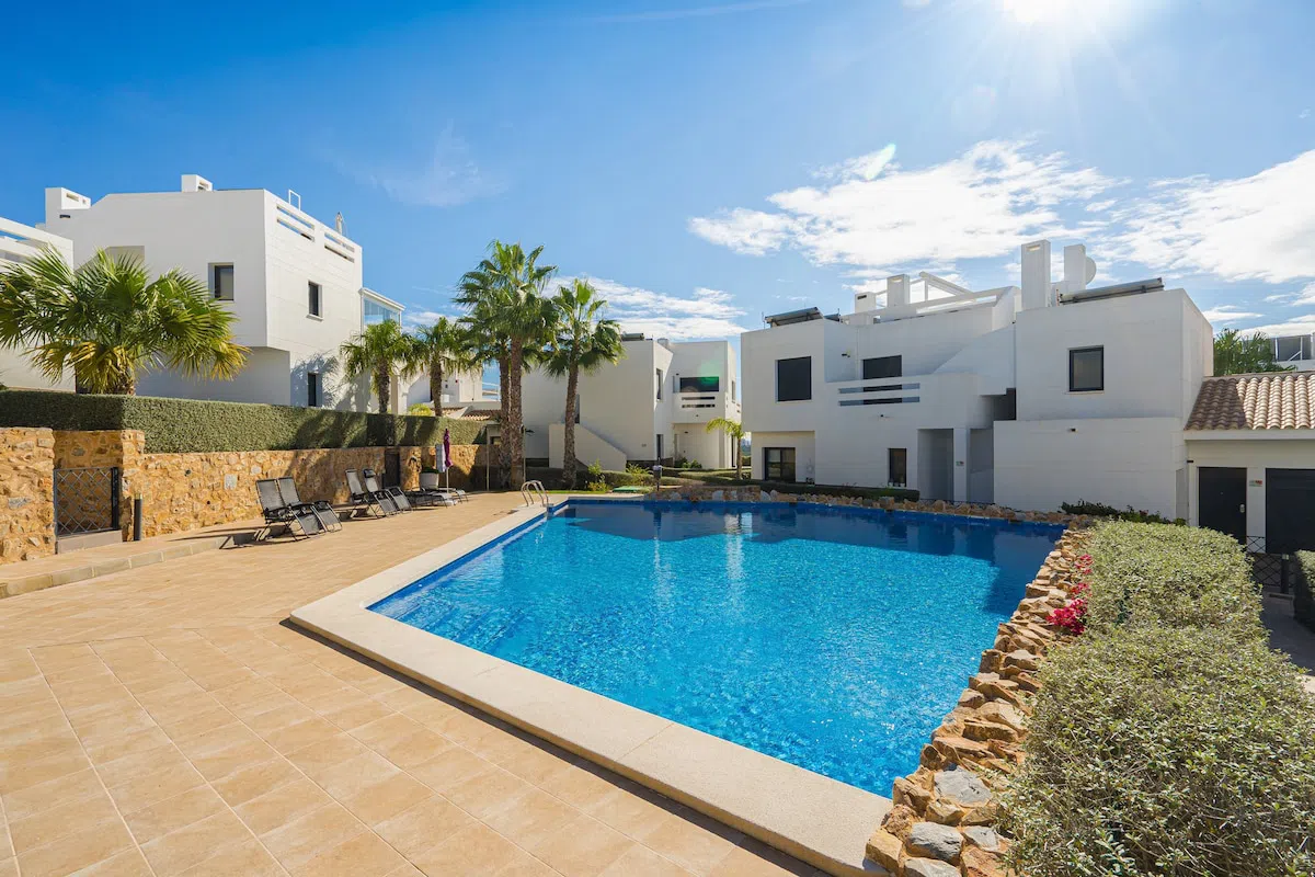 Apartamento moderno con piscina comunitaria en Orihuela Costa, en la Costa Blanca, España para 4 personas. El apartamento de vacaciones está situado en un complejo de golf y en una zona costera.