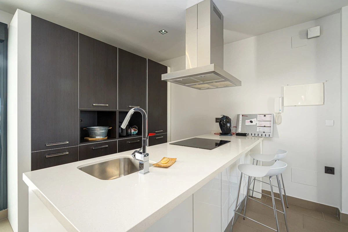 - cocina americana con cocina eléctrica, horno eléctrico, microondas, lavavajillas, frigorífico, congelador, cafetera, calentador de agua, batidor y tostador