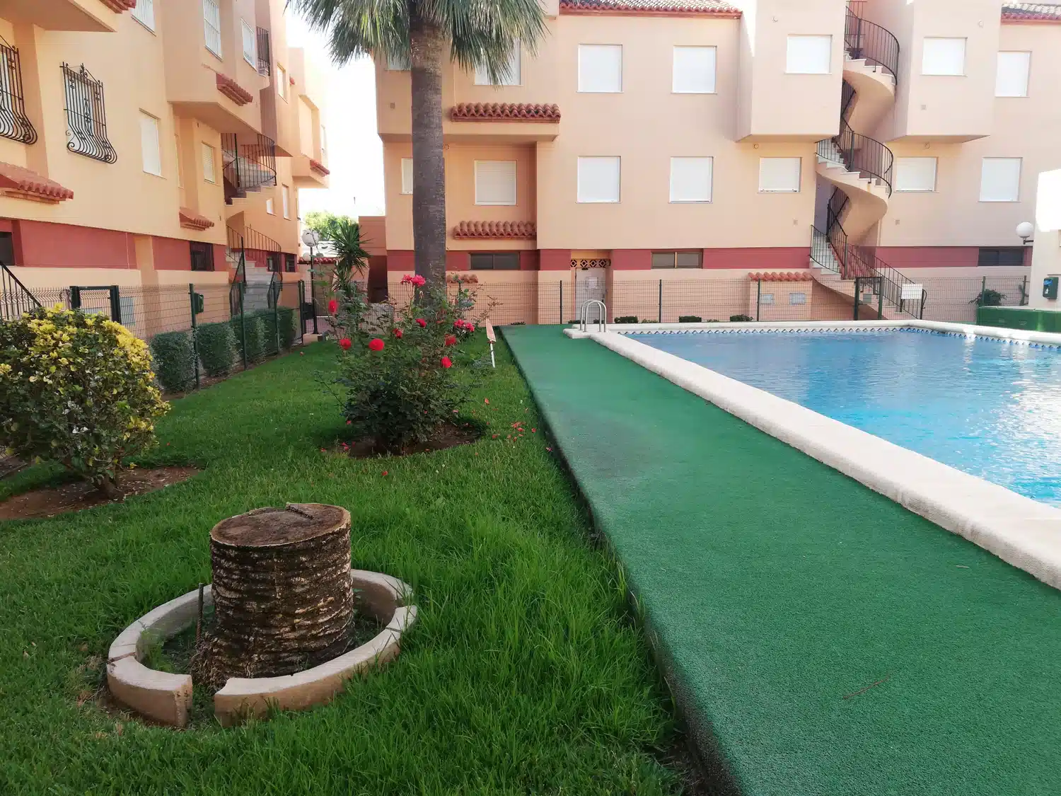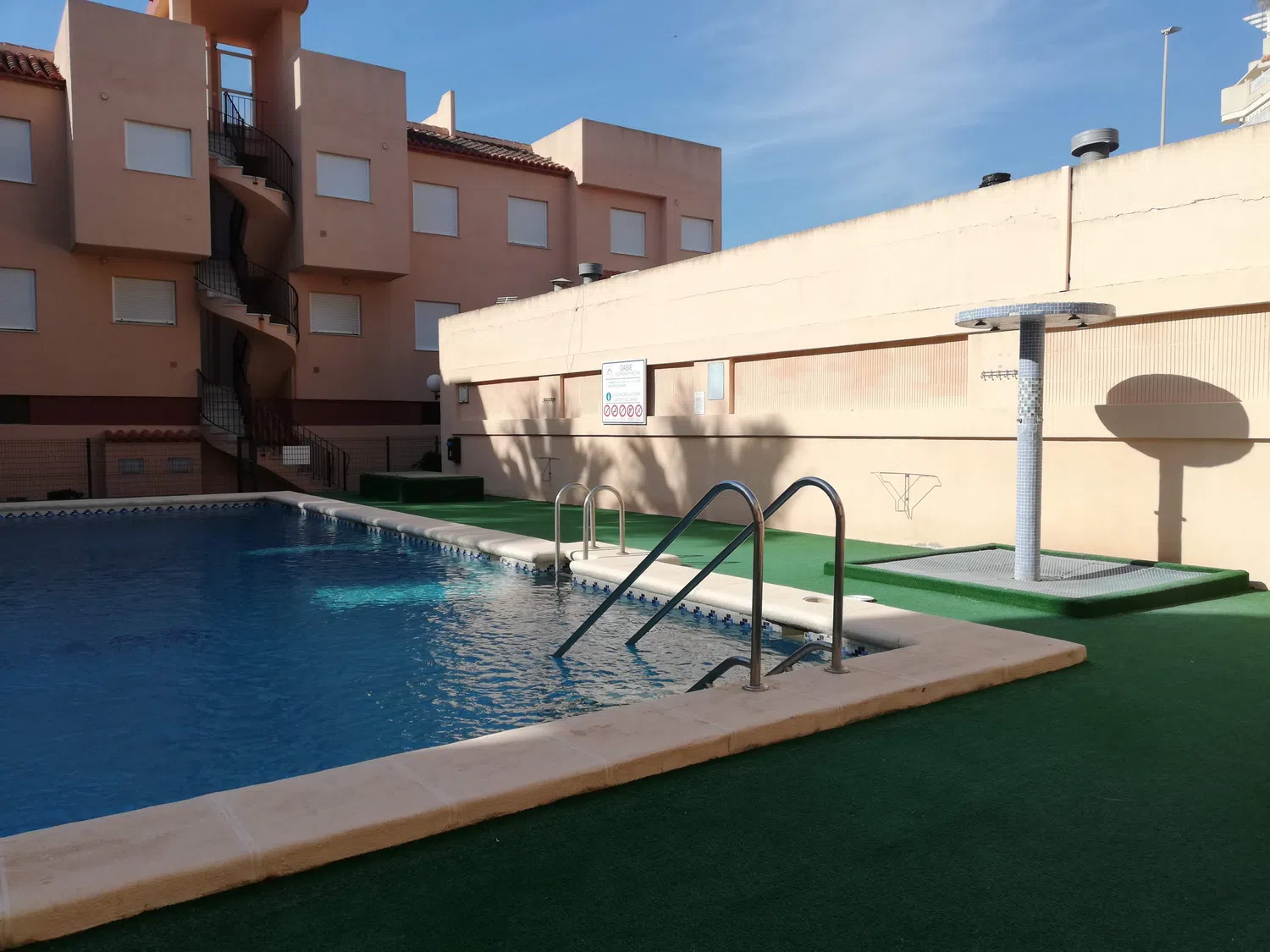 Ofrece una bonita piscina con zona poco profunda y con escalera veneciana, rodeada zonas comunes pisables y ajardinadas.