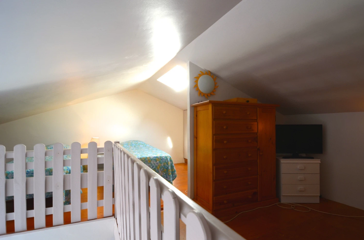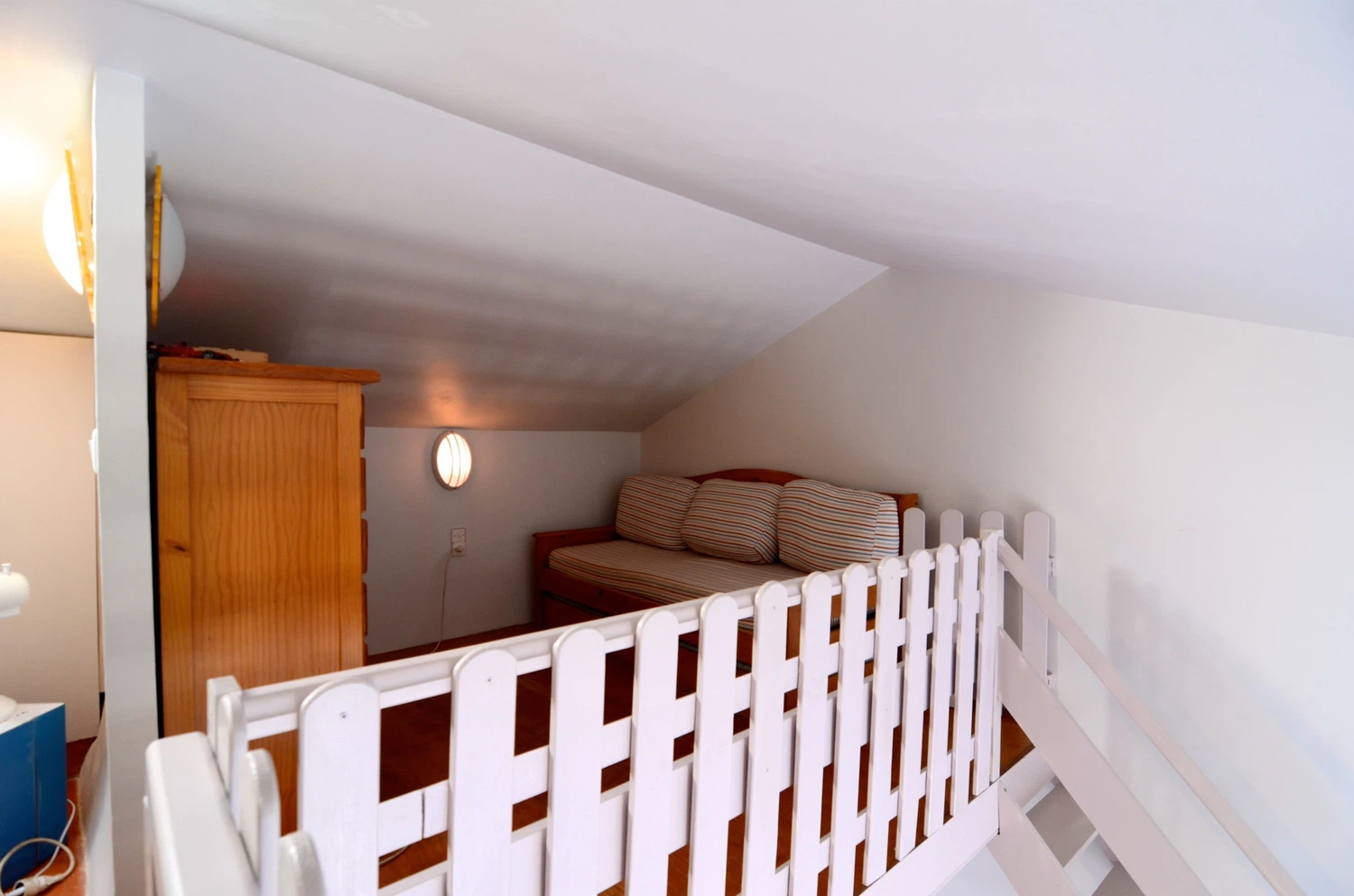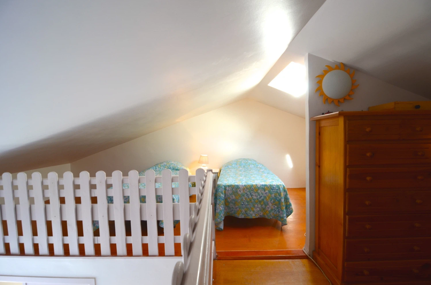 Subiendo al nivel superior, te sorprenderás con dos cómodas camas individuales y un pequeño salón equipado con un práctico sofá cama y TV, perfecto para relajarte después de un día de diversión en la playa.