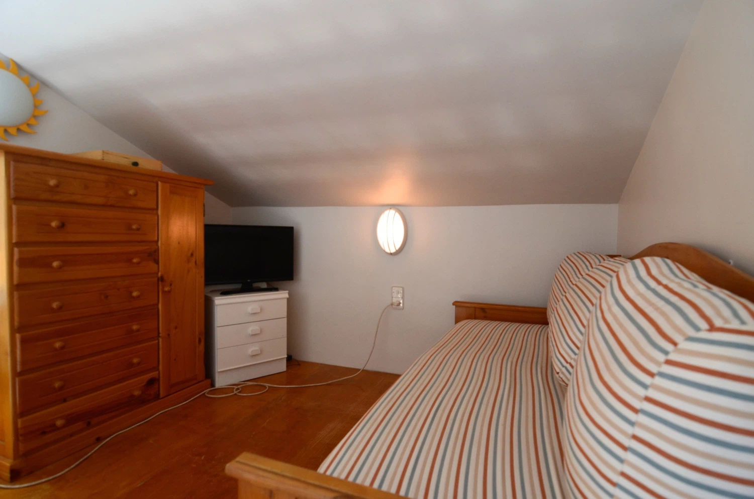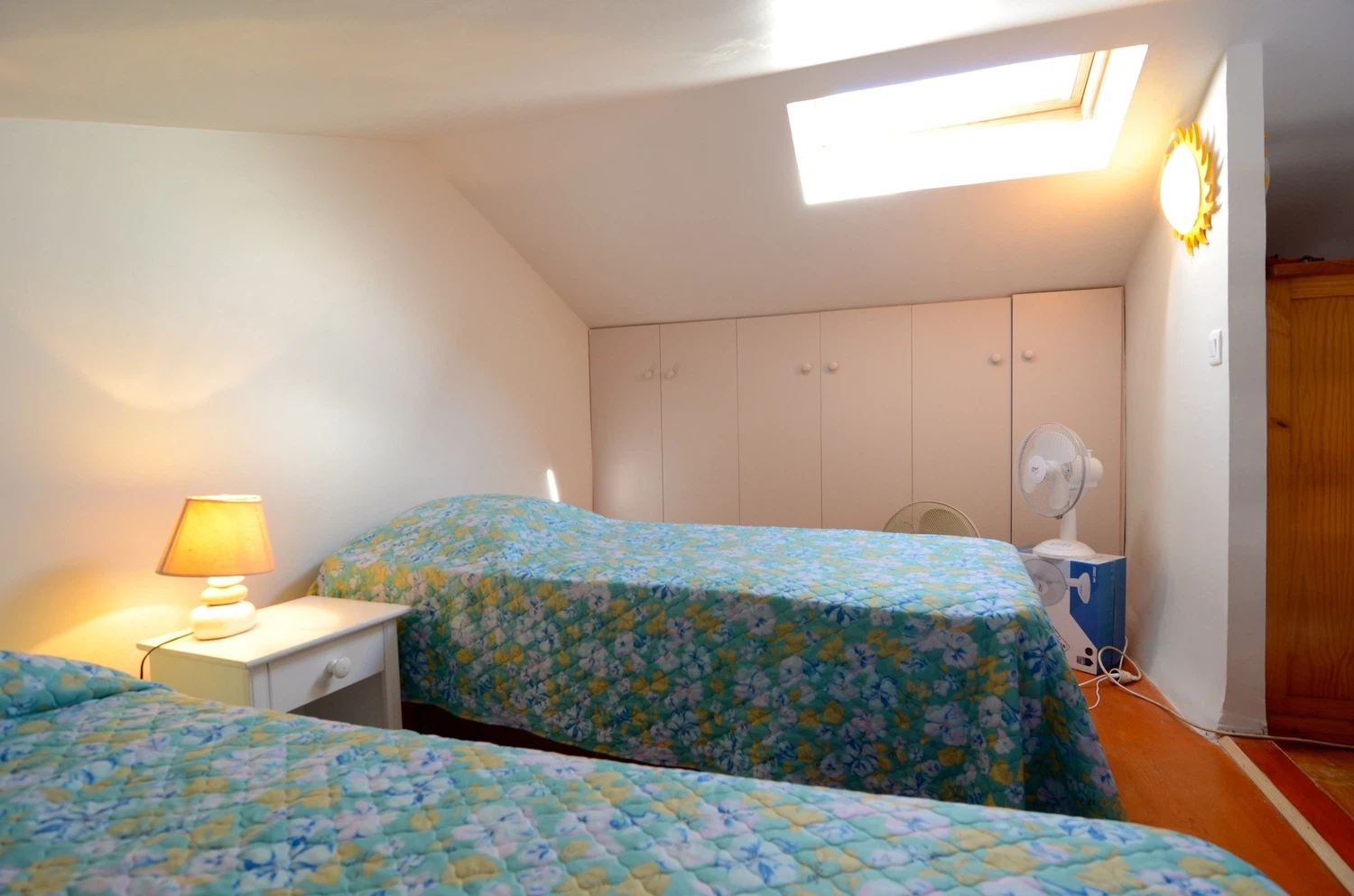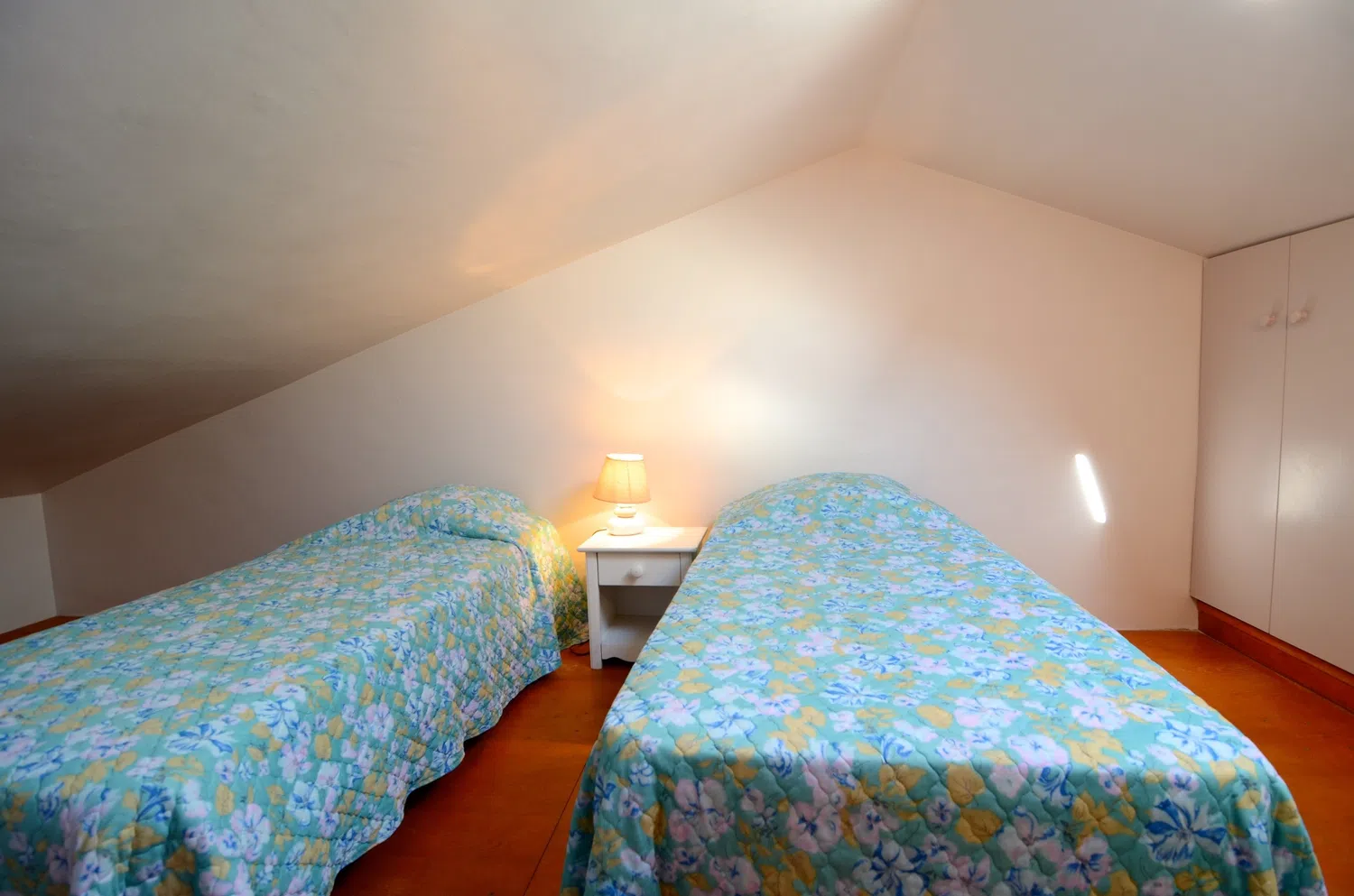 Subiendo al nivel superior, te sorprenderás con dos cómodas camas individuales y un pequeño salón equipado con un práctico sofá cama y TV, perfecto para relajarte después de un día de diversión en la playa.