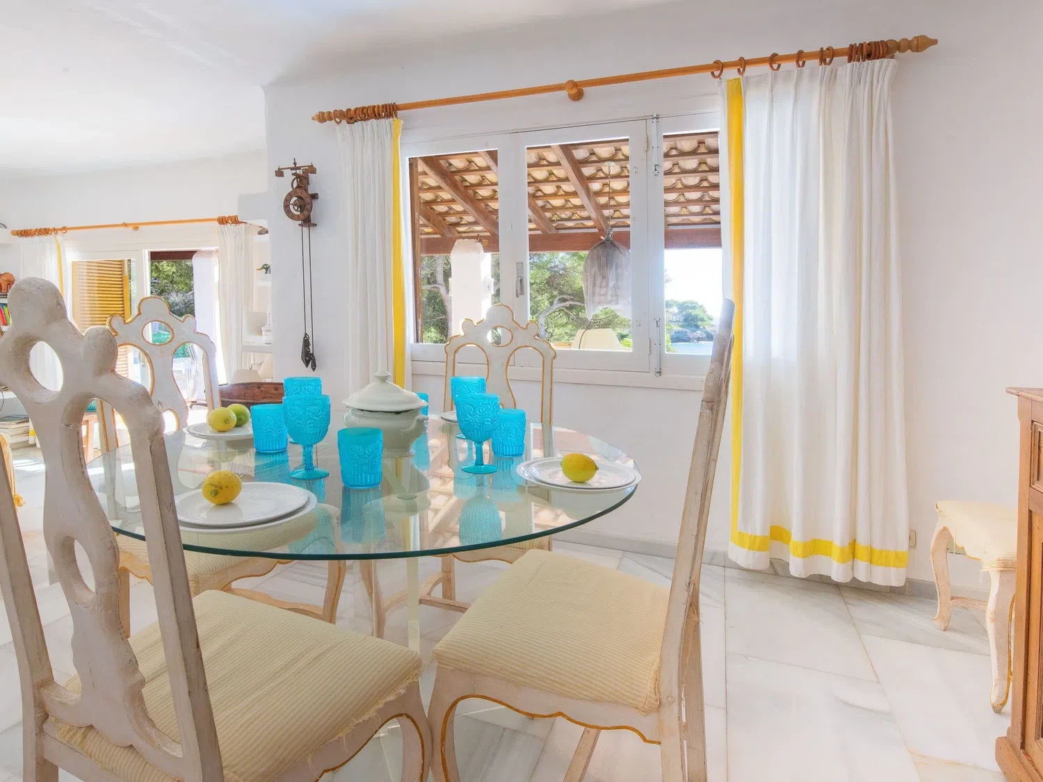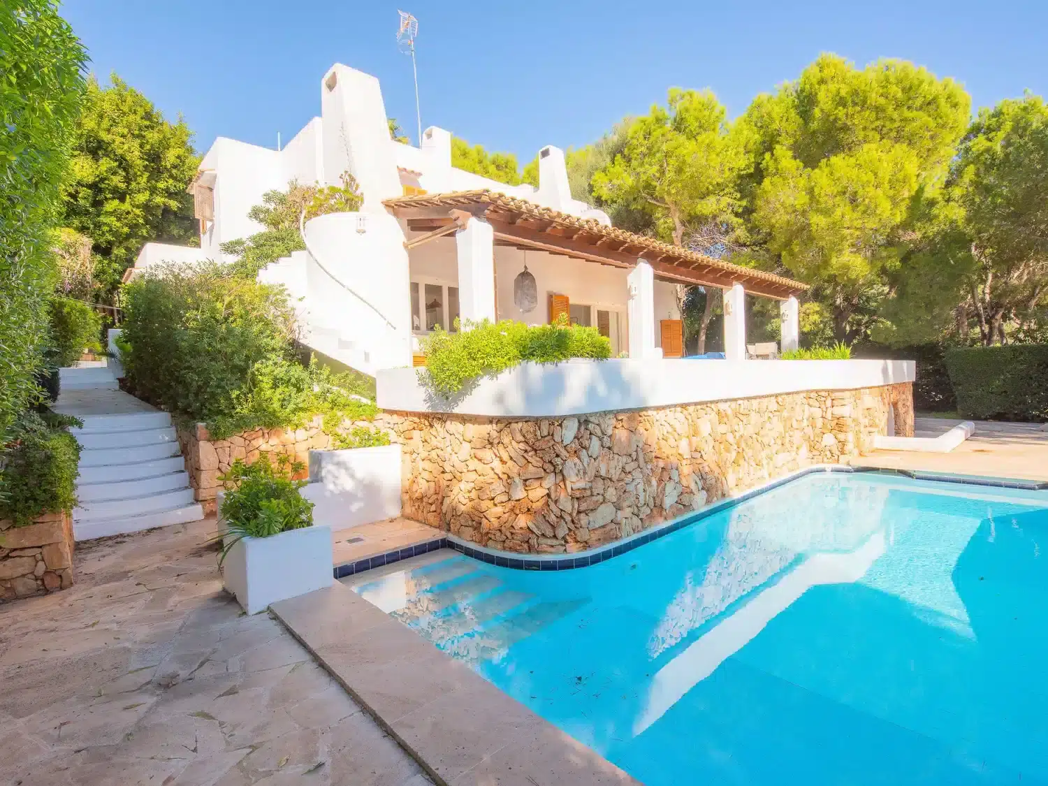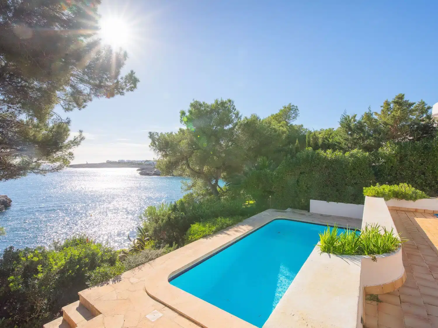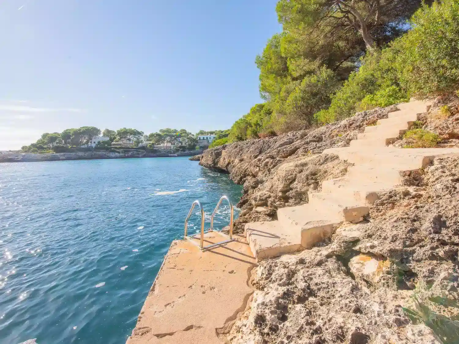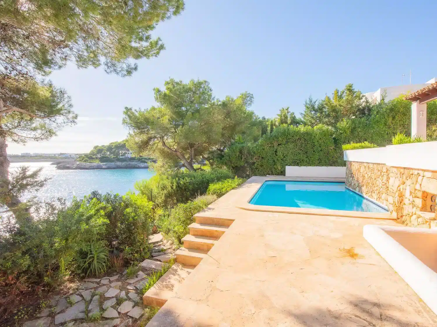 1st sea line villa with private pool for rent in Mallorca. This villa in a great location with direct sea access is situated in a quiet cul-de-sac, just 100 metres from the sandy beach of Cala Gran and 500 metres from Cala D Or centre. Sea access from the rocks via a metal staircase.Two-storey villa. From the hallway you enter an open-plan living/dining area with access to a covered terrace with beautiful sea views. The kitchen can be accessed via the dining area as well as from the entrance, adjoining a guest WC with shower and the utility room. There are also two double bedrooms on the ground floor, each with an en suite shower room. The two further bedrooms are located on the first floor. One has a double bed (2 single mattresses) and a full bathroom en suite. The 4th bedroom has two single beds and an en suite shower room. Both bedrooms have access to a terrace with stunning sea views. This first floor is also accessible via an external staircase* From the hallway on the ground floor, 4 steps lead to the living/dining area, the kitchen and the 2 lower bedrooms.The 4 bedrooms are equipped with air conditioning with the following limited and fixed hours of use: 13h-15h and 20h-8h.From the living area you enter the beautiful covered terrace with outdoor furniture and open sea views. Below the terrace is the 8 x 4 swimming pool, where you can also follow the stone steps to the rocks and have direct access to the sea via a metal ladder. ESFCTU0000070080007834900000000000000000000ETV/13