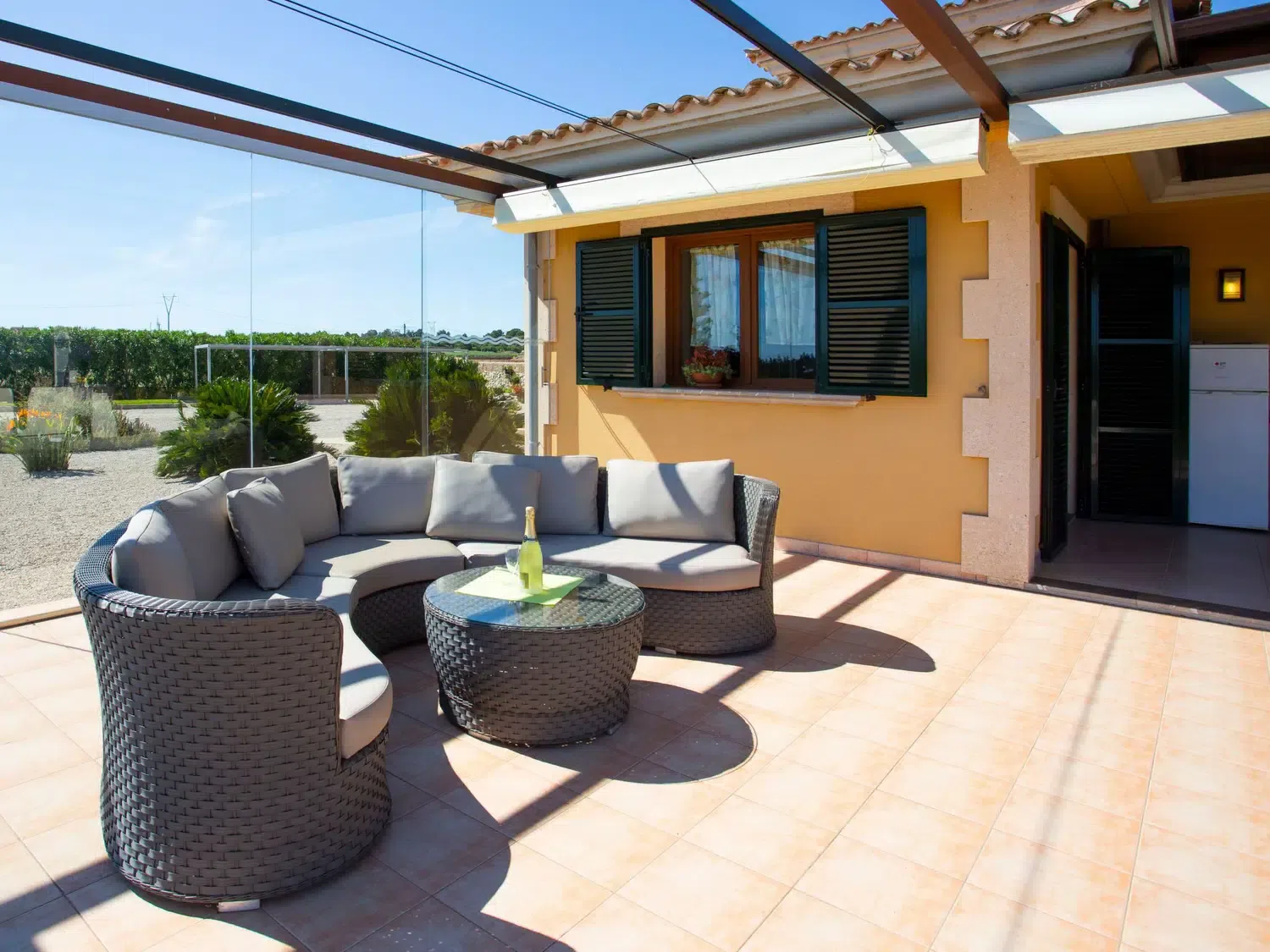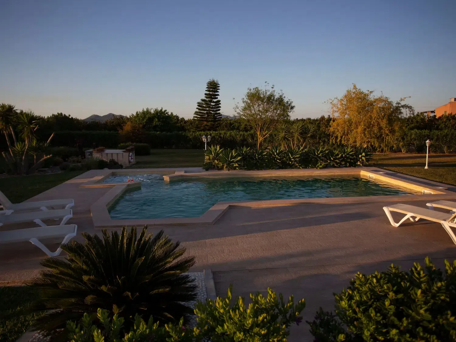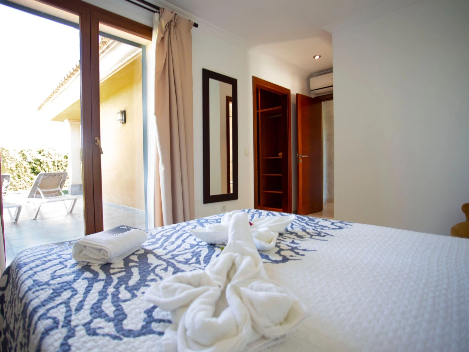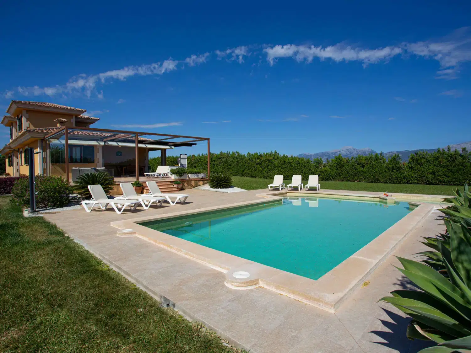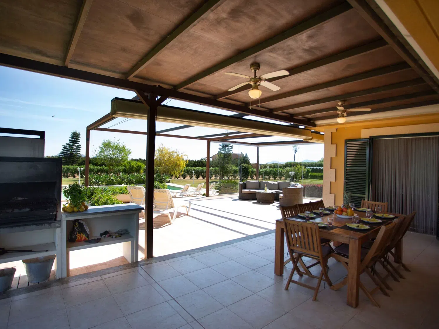 Descubra el encanto y el confort combinados en nuestra acogedora casa de vacaciones en Muro, Mallorca, diseñada especialmente para acoger hasta 9 personas. Esta residencia es el refugio ideal para familias o grupos de amigos que buscan una estancia inolvidable en una de las zonas más bellas de Mallorca. Con todas las comodidades necesarias para garantizar su confort, nuestra casa promete ser el punto de partida perfecto para explorar los alrededores o simplemente disfrutar de momentos de pura relajación. El interior de la casa está equipado pensando en su máxima comodidad, contando con un total de 5 dormitorios y 3 baños, asegurando así un espacio privado y confortable para cada uno de los huéspedes. La presencia de aire acondicionado en todas las estancias garantiza un ambiente fresco y agradable, incluso en los días más calurosos del verano mallorquín. Los baños están equipados con duchas, una tiene incluida una moderna ducha de lluvia, ideal para relajarse después de un día de aventura. El exterior de la casa no deja nada que desear. Una amplia terraza cubierta invita a los huéspedes a disfrutar de comidas al aire libre o sencillamente relajarse y disfrutar del entorno. El jardín, de uso exclusivo para los huéspedes, ofrece un espacio privado para tomar el sol, leer un libro o jugar con los niños, creando recuerdos imborrables en un entorno sereno y encantador. Situada en el entorno de Muro, nuestra casa de vacaciones ofrece el equilibrio perfecto entre la tranquilidad del campo mallorquín y la proximidad a algunas de las mejores playas y atracciones de la isla. La zona es ideal para quienes deseen explorar los pintorescos pueblos, la rica cultura y las impresionantes costas de Mallorca, ofreciendo una experiencia vacacional única y completa. Datos básicos - Mascotas permitidas: ninguno - Tipo de alojamiento: Casa de vacaciones - se encuentra en: nada aplicable - tipo de edificio: casa individual - Número de plantas en el edificio por encima de la planta baja: 1 - superficie del terreno: 14800 m² - año de construcción: 2011 - casa independiente - Número de dormitorios: 5 - Número de baños: 3 Características principales - Wi-Fi - aire acondicionado: en todas las estancias - calefacción: en todas las estancias - terraza - jardín: de uso exclusivo - totalmente cercado (con muro, valla o seto) - Nº total de estacionamientos privados para turismos: 4 - ㄴ éstos se dividen en plazas con porche: 4 Dormir dormitorio 12 - 2x cama individual dormitorio 15 - 2x cama individual dormitorio 3 - cama doble (de 1,51 m a 1,79 m de ancho) dormitorio 6 - cama doble (de 1,51 m a 1,79 m de ancho) dormitorio 9 - cama doble (de 1,51 m a 1,79 m de ancho) Baño cuarto de baño 3 - ducha - lavabo - servicio (WC) cuarto de baño 6 - ducha - lavabo - servicio (WC) cuarto de baño 9 - ducha de lluvia - 2x lavabo - servicio (WC) - bidé tipo de edificio: casa individual. superficie del terreno: 14800m². año de construcción: 2011.