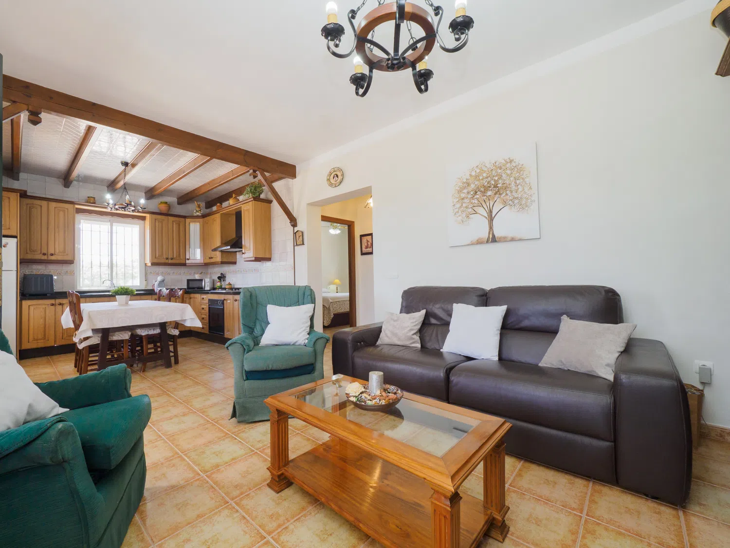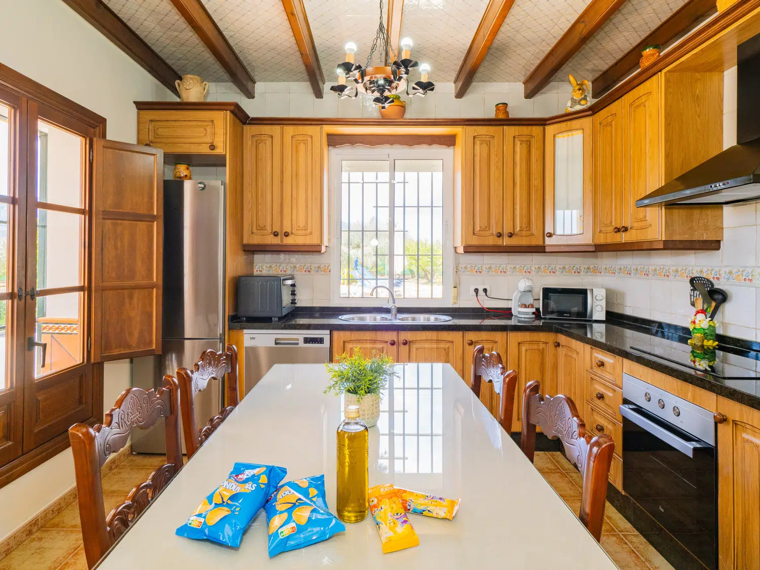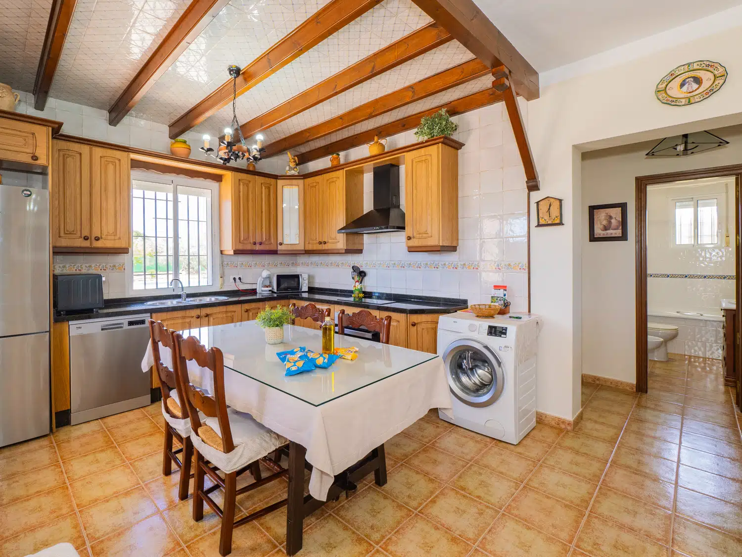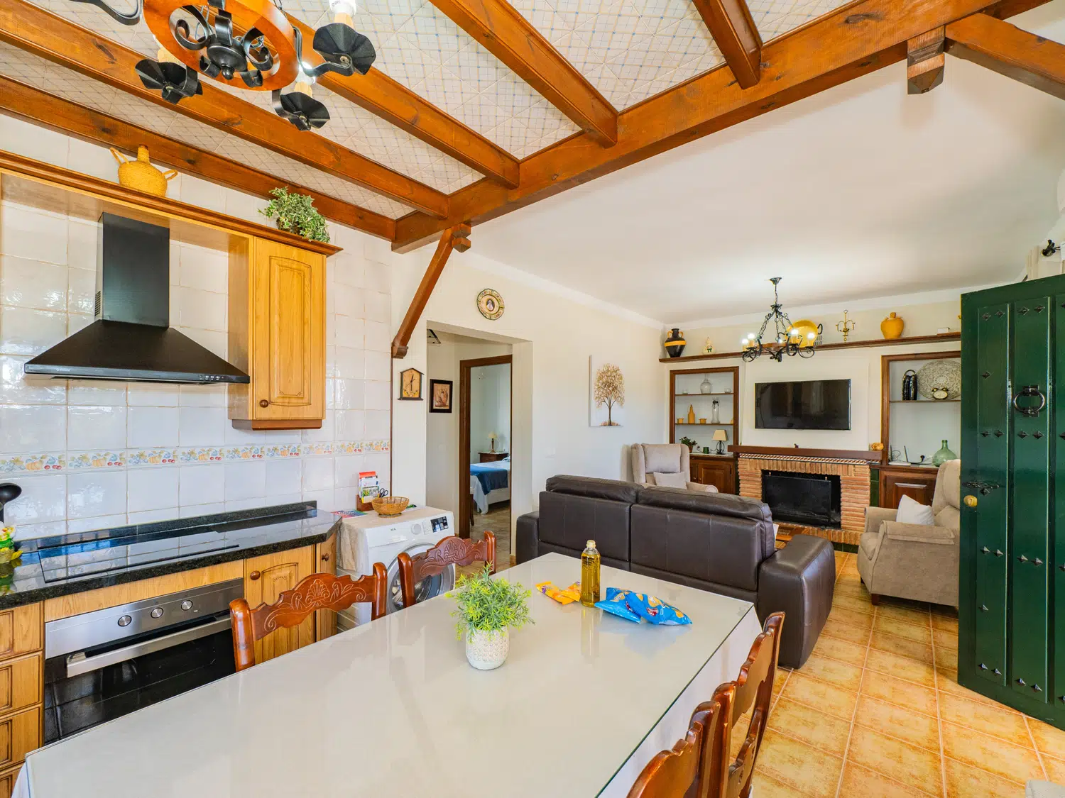 En el interior, encontrará un salón comedor con cocina americana bien diferenciados, creando un espacio acogedor y funcional. Relájese en cómodos sofás viendo la televisión o conectándose al wifi para seguir sus series favoritas 📺. La cocina está equipada con placa vitrocerámica y lavavajillas, facilitando la preparación de comidas. Además, la ubicación cercana a Alhaurín el Grande le permite hacer compras fácilmente para complementar sus ingredientes frescos y apoyar a los negocios locales 🛒.