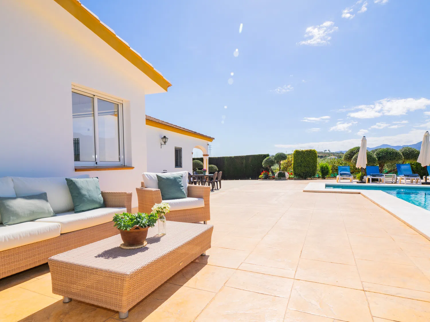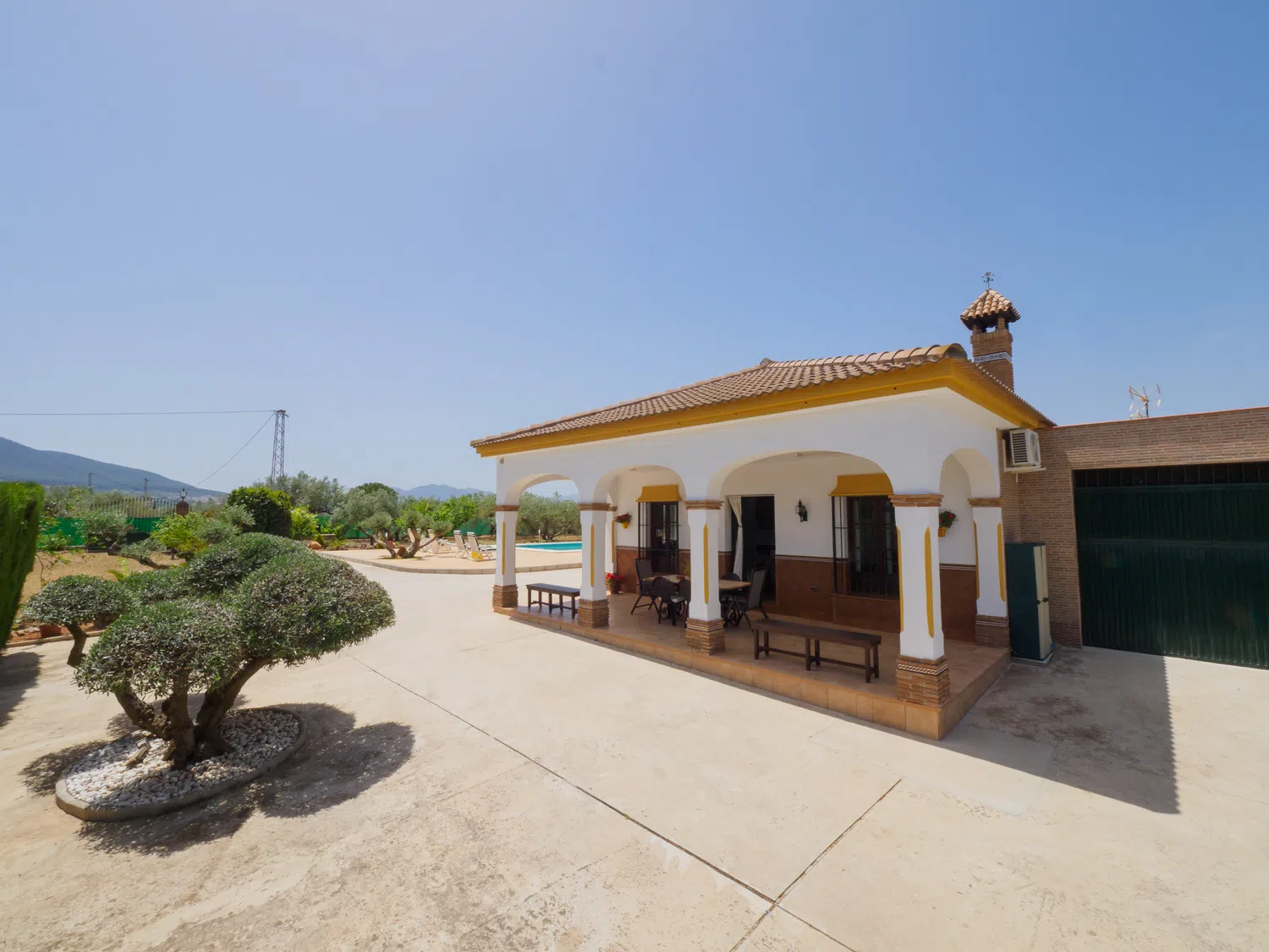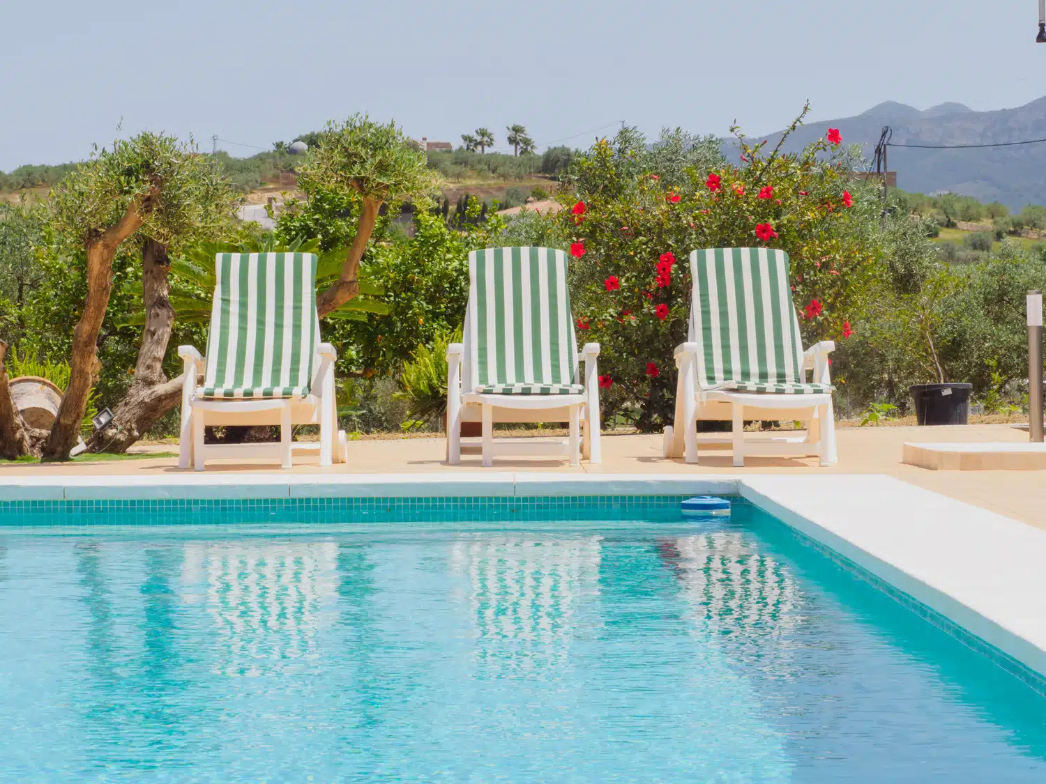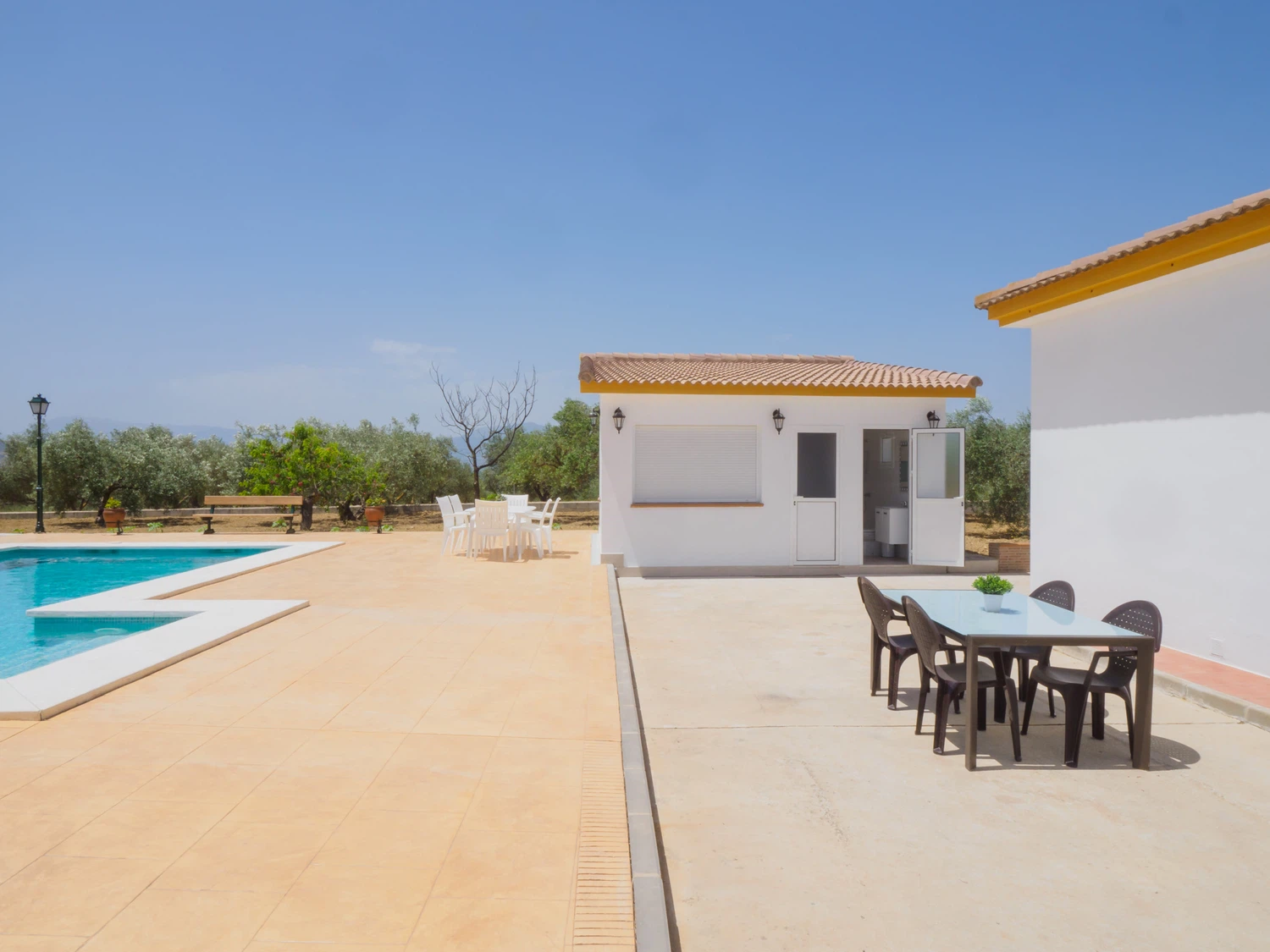 Este encantador alojamiento ofrece un ambiente íntimo y privado con amplios exteriores que incluyen una piscina perfecta para aprovechar el sol de la Costa del Sol durante todo el día y contemplar atardeceres inolvidables 🌅. El porche techado en la entrada es ideal para almorzar o relajarse disfrutando del paisaje natural que rodea la finca. Además, cuenta con un baño exterior completo con ducha, ubicado junto a una pequeña construcción que no está habilitada para uso adicional.