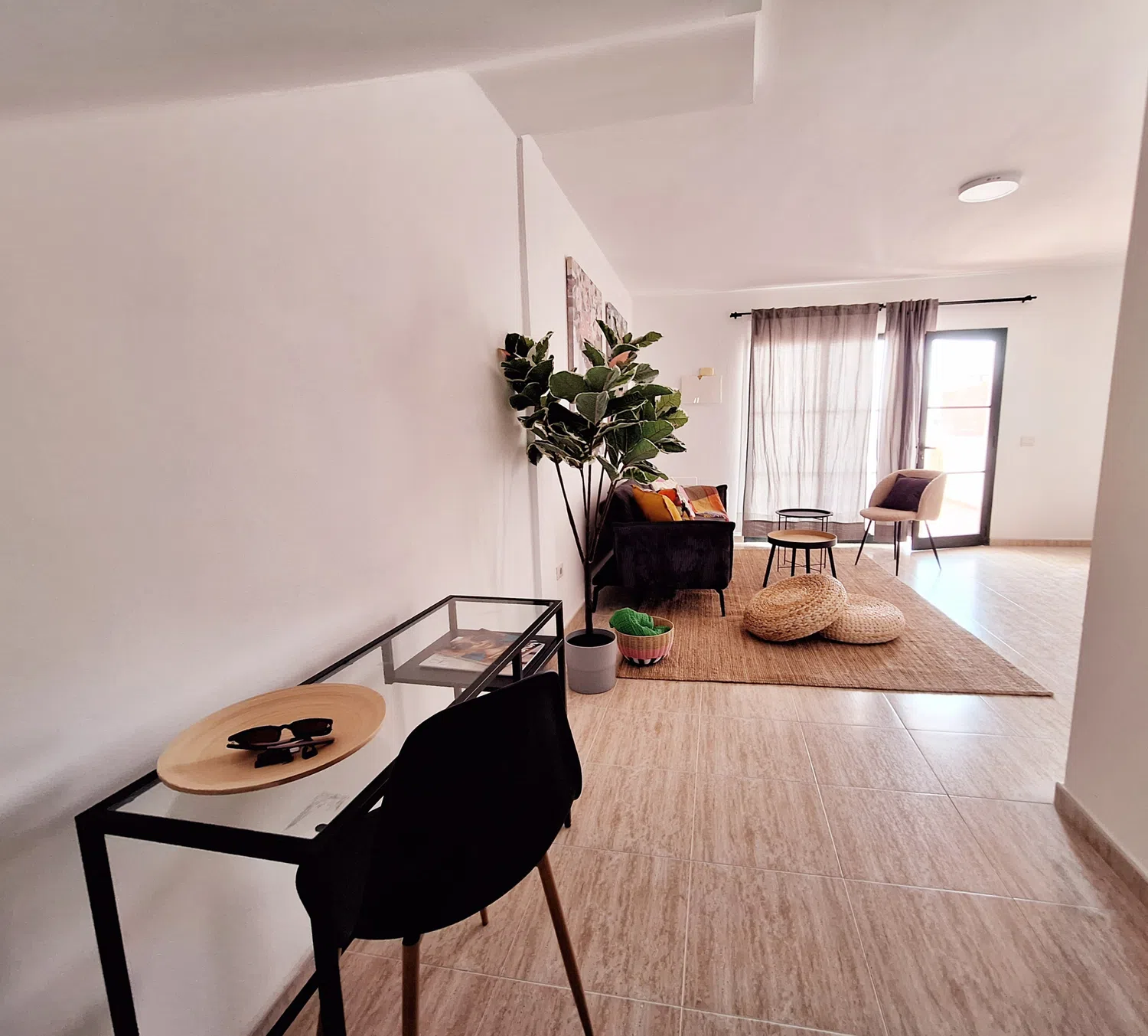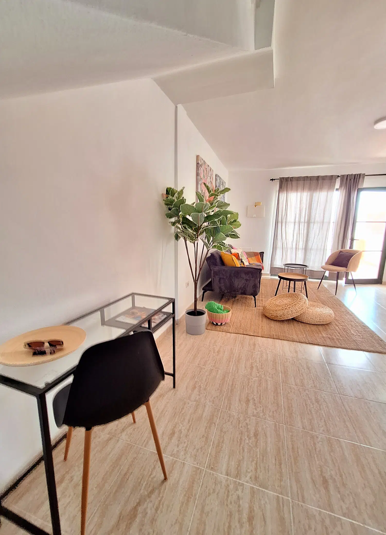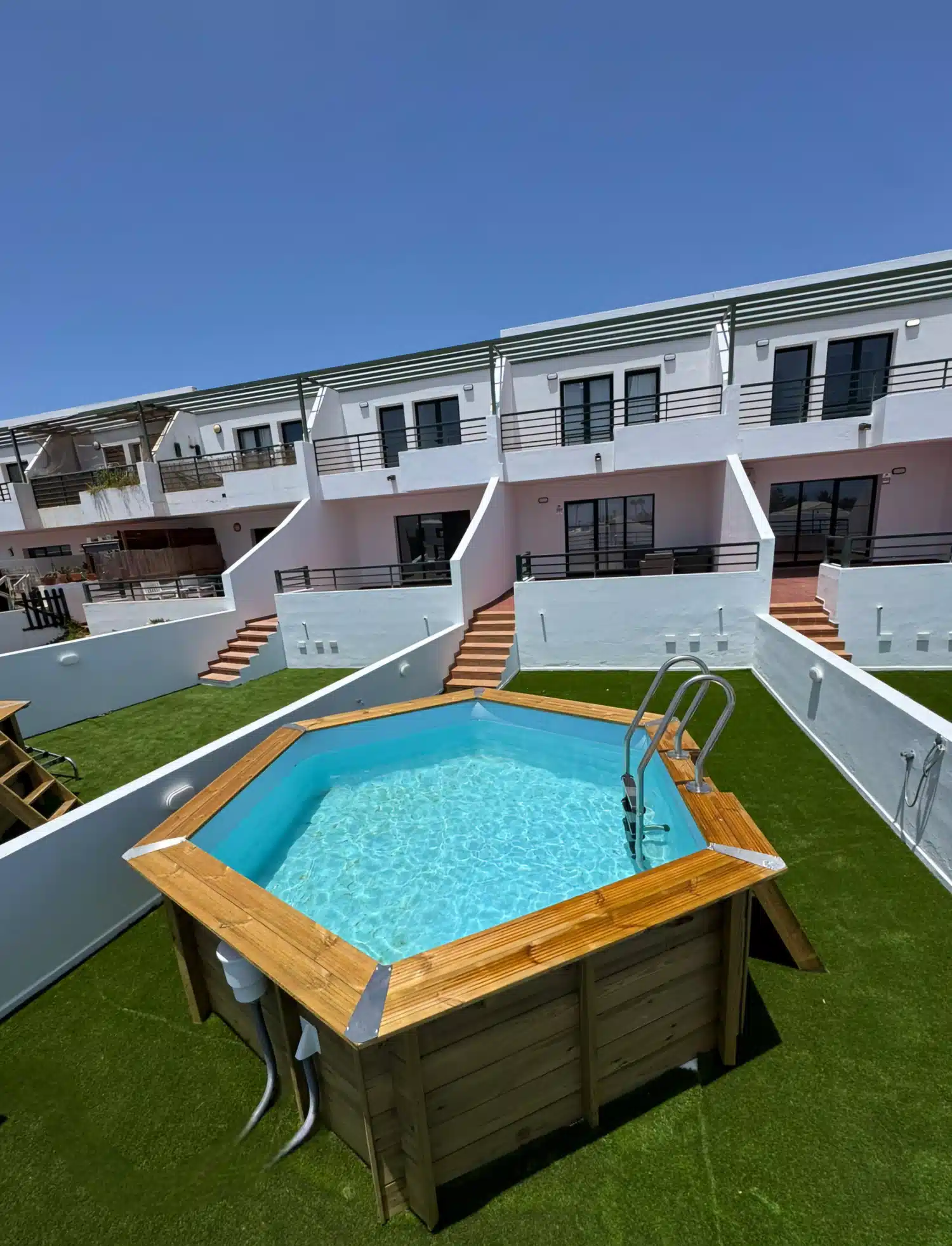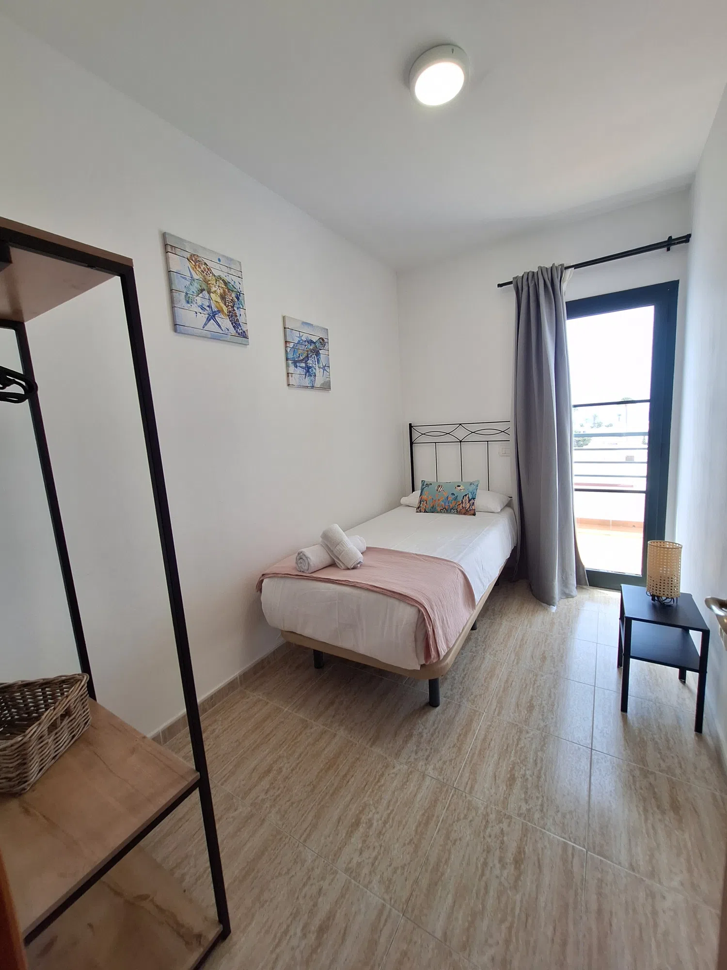 Nuestros modernos dúplex ofrecen un amplio espacio para disfrutar de tus vacaciones con total comodidad. En la planta baja, encontrará una cocina totalmente reformada, equipada con menaje y electrodomésticos propios de un hogar. El amplio salón-comedor, con acceso a una terraza amueblada, es el lugar perfecto para disfrutar de momentos de tranquilidad y compañía. Además, en este espacio exterior, podrás relajarte en una piscina privada de 3 x 3. La planta baja cuenta con un baño completo con ducha. En la planta alta, a la que se accede por escaleras internas, se encuentran tres dormitorios. Disponen de una cama de matrimonio con ropero empotrado. El segundo dormitorio cuenta con dos camas individuales de 90 cm y ropero empotrado, y el tercero tiene una cama individual de 90 cm. Además, en esta planta se encuentra un baño completo con ducha y un balcón con vistas al mar. Este dúplex tiene capacidad para hasta 5 personas más un bebé (cuna disponible bajo previa petición). No dispone de camas supletorias ni sofá cama. Entre otros servicios, el alojamiento ofrece Wi-Fi gratuito en las instalaciones, y fácil aparcamiento (no privado). Los dúplex no dispone de aire acondicionado, ventiladores ni calefactores. Ideal para familias, grupos de amigos y trabajadores en remoto.