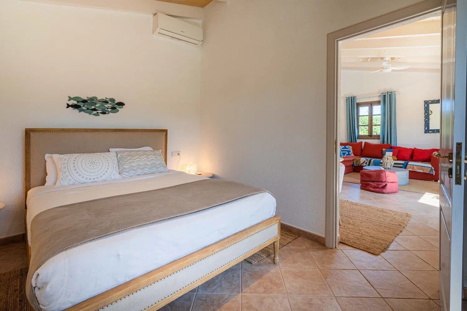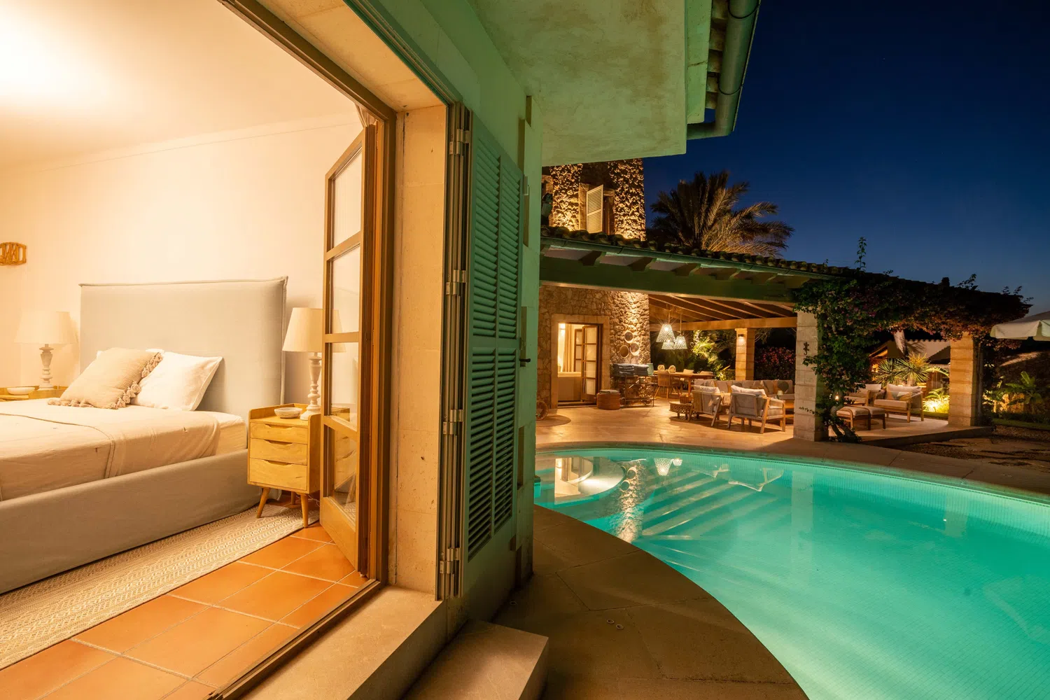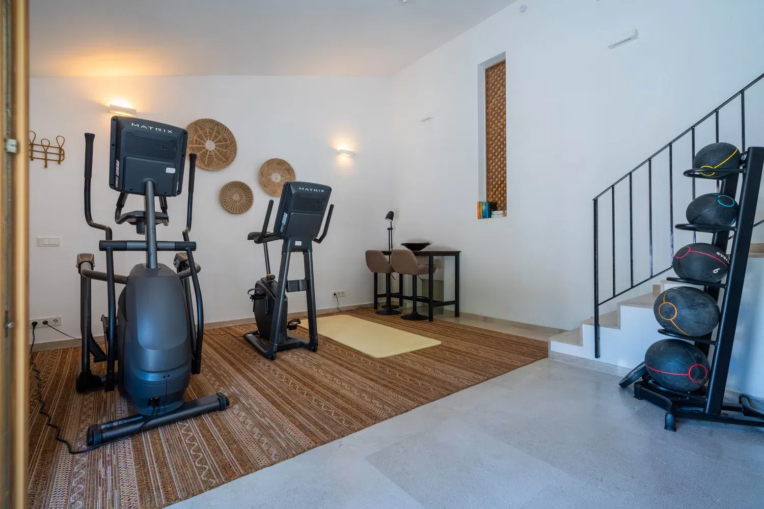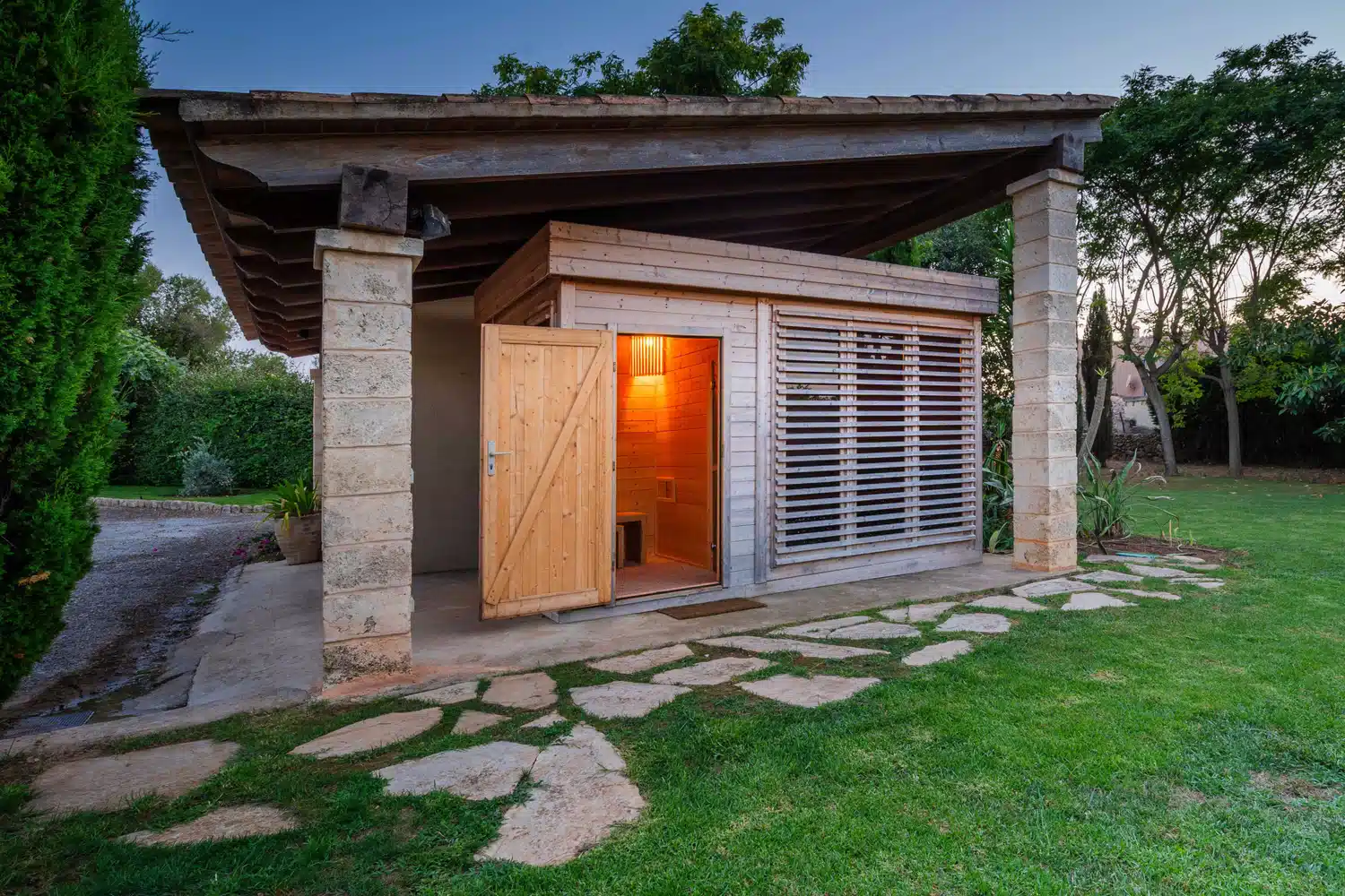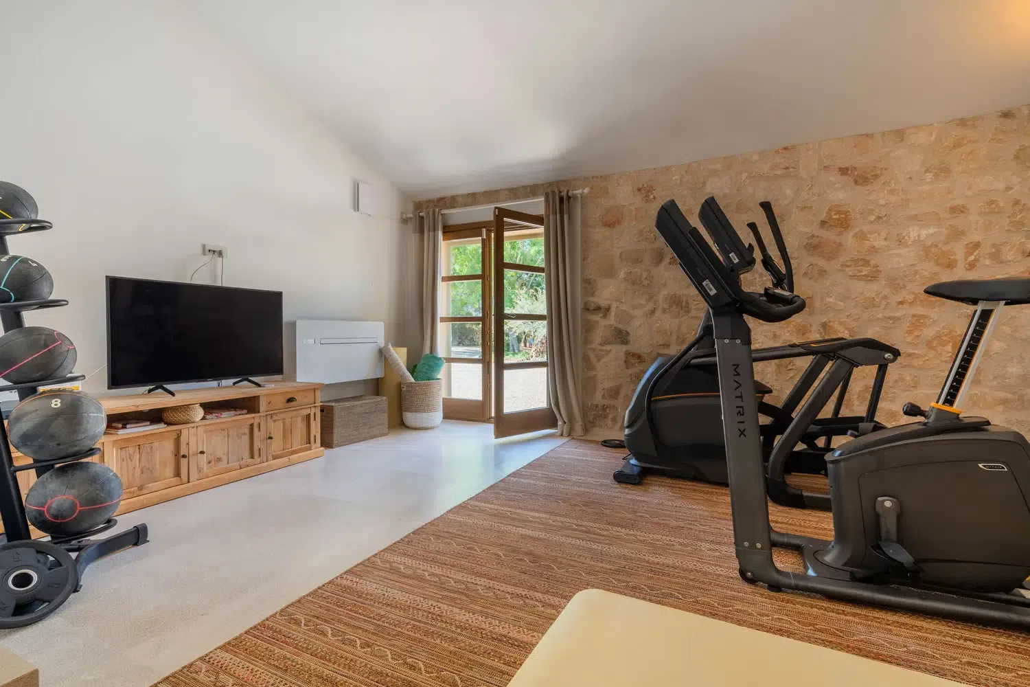 La casa principal dispone de 4 habitaciones (con 2 baños en suite) ademas de un baño completo y 1 aseo para mayor comodidad. La cocina americana está completamente equipada con electrodomésticos, lo que hace que preparar deliciosas comidas sea un placer. En el exterior, los huéspedes pueden disfrutar de una bonita piscina privada de agua salada rodeada de un jardín, con muebles de jardín para relajarse al sol. Además, el jacuzzi, la sauna y el gimnasio privado añaden un toque extra de lujo para aquellos que buscan una estancia relajante. La finca también cuenta con una acogedora terraza, ideal para cenas al aire libre, y una zona de barbacoa para disfrutar de comidas bajo el cielo estrellado de Mallorca.