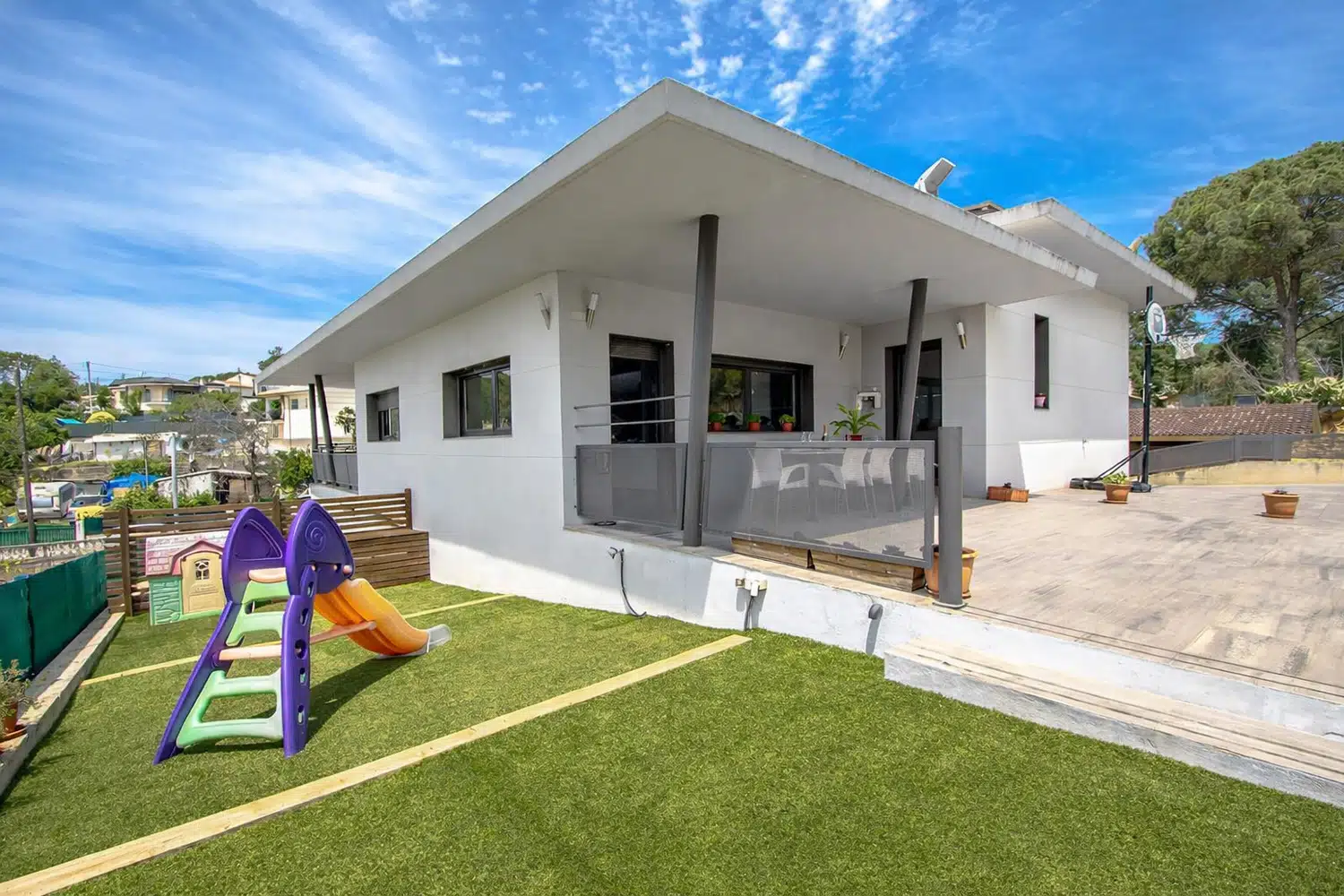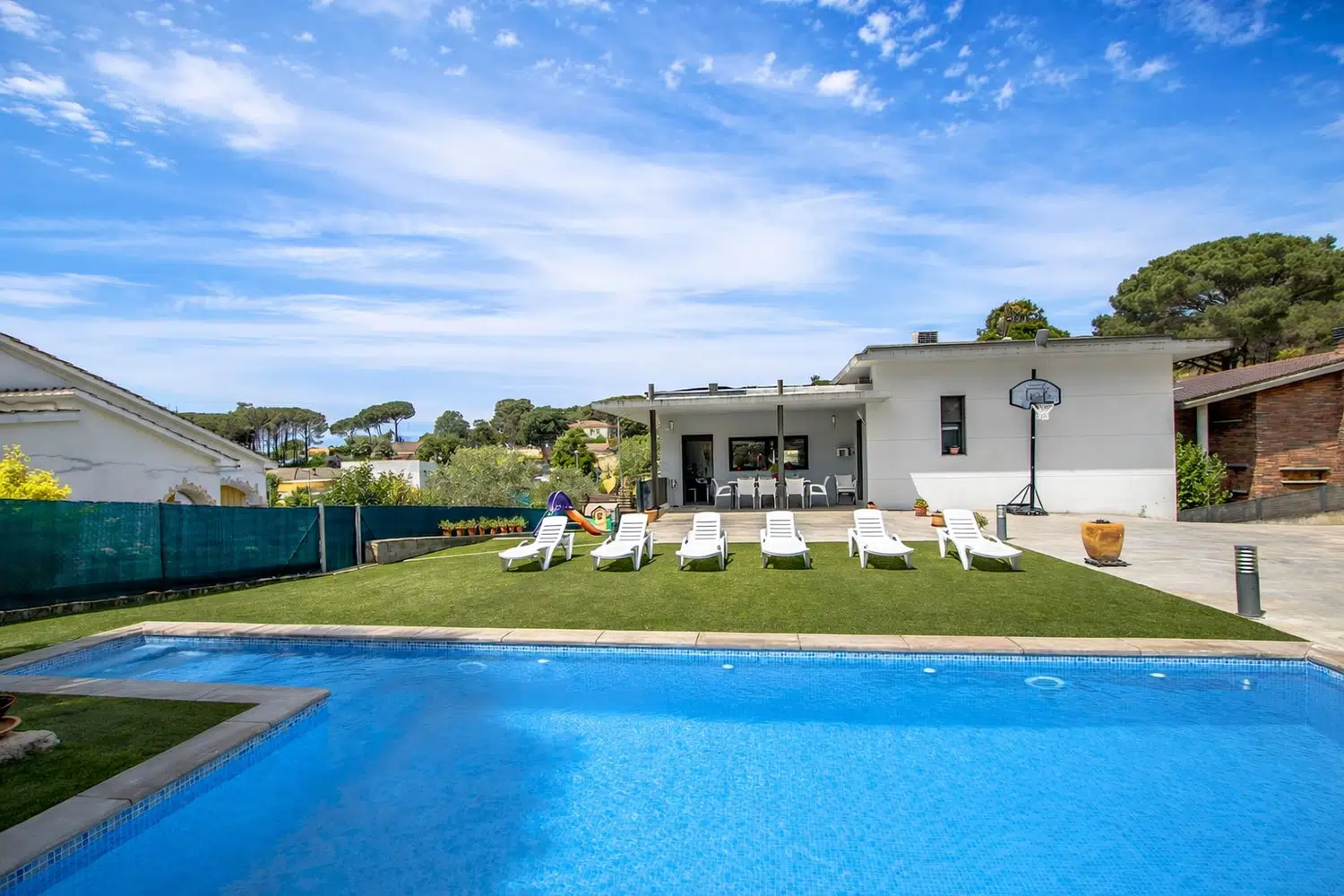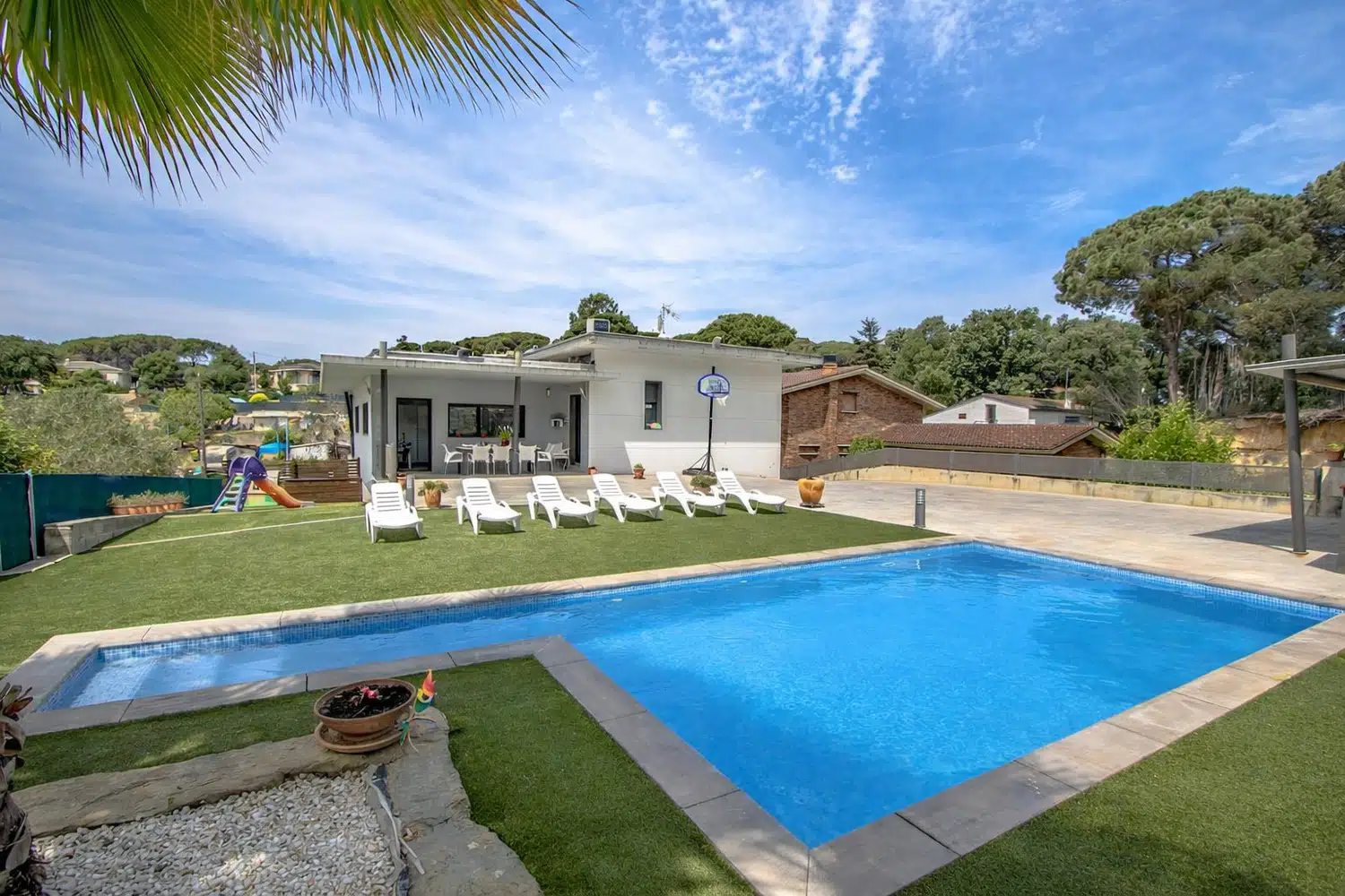 En el exterior encontramos un amplio jardín privado con una casita infantil de juguete, una zona cubierta de almuerzo, barbacoa de carbón, tumbonas, sombrilla... y una maravillosa piscina privada de 4 metros de ancho y 7 de largo, con una profundidad máxima de 1.50 metros!