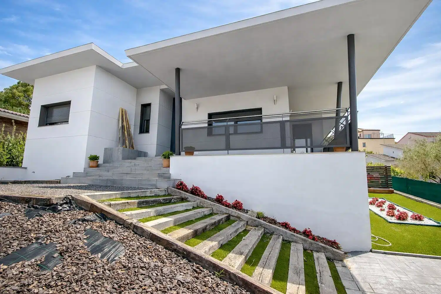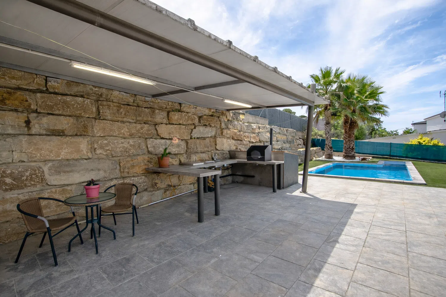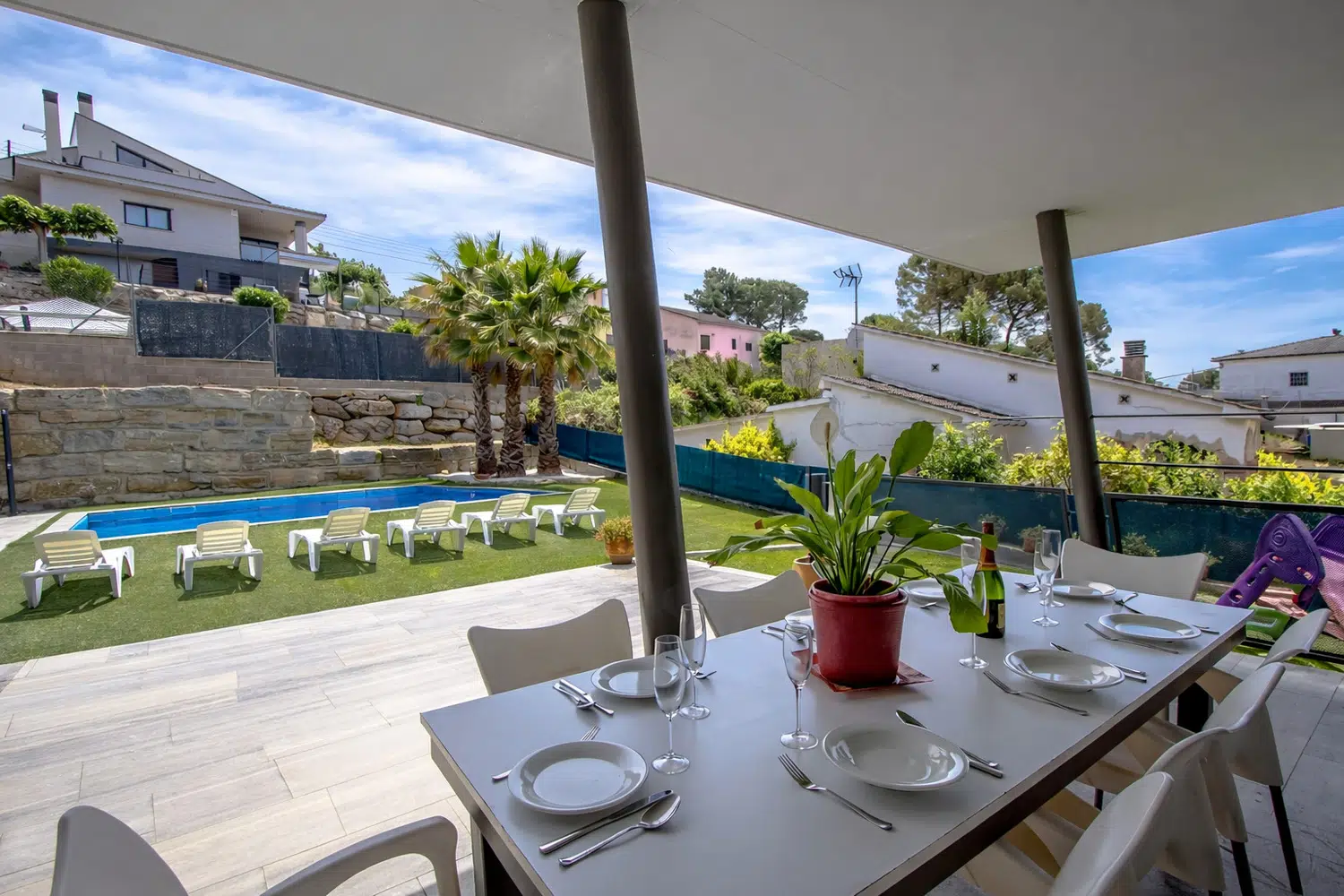 En el exterior encontramos un amplio jardín privado con una casita infantil de juguete, una zona cubierta de almuerzo, barbacoa de carbón, tumbonas, sombrilla... y una maravillosa piscina privada de 4 metros de ancho y 7 de largo, con una profundidad máxima de 1.50 metros!
