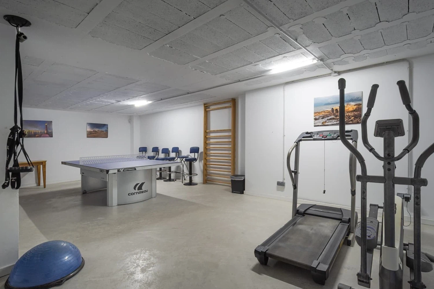 Mantente activo en el garaje subterráneo transformado en sala de fitness con varias unidades de entrenamiento, incluyendo tenis de mesa, TRX, cinta de correr y TV satelital. El sistema de iluminación y música integrado en la terraza y la azotea se controla convenientemente mediante iPad.