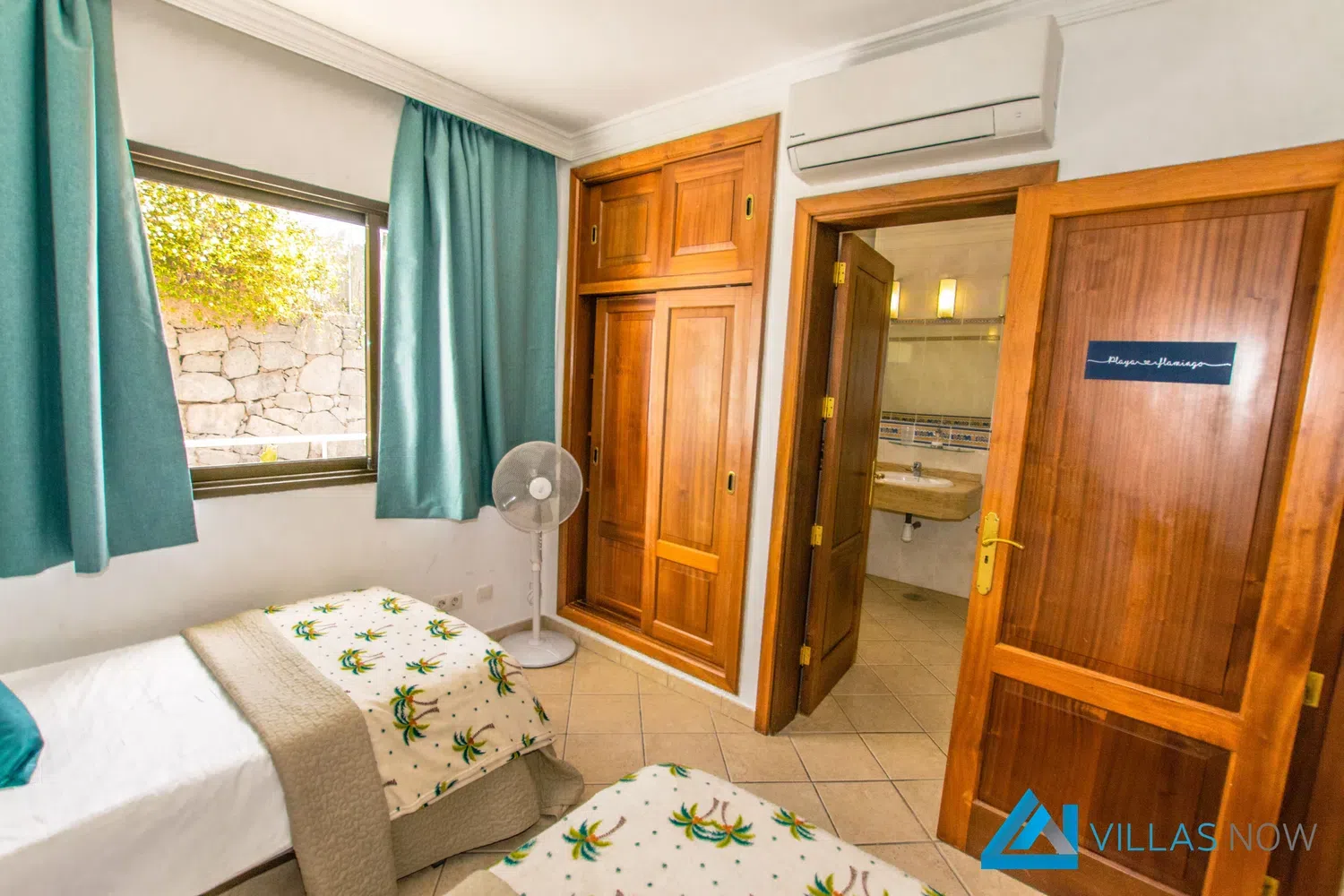 Una bonita pasarela, decorada con buganvillas, te lleva a la planta superior de Villa Timanfaya, donde se encuentran 4 dormitorios cuidadosamente decorados. 2 dormitorios tamaño king, ambos con baños en suite y ventanas francesas con vista al mar, conducen a una amplia terraza superior. Con vista a la piscina y con uno de los impresionantes comedores al aire libre de la villa, este es el lugar perfecto para ver el amanecer con un café o disfrutar juntos de una copa por la noche.