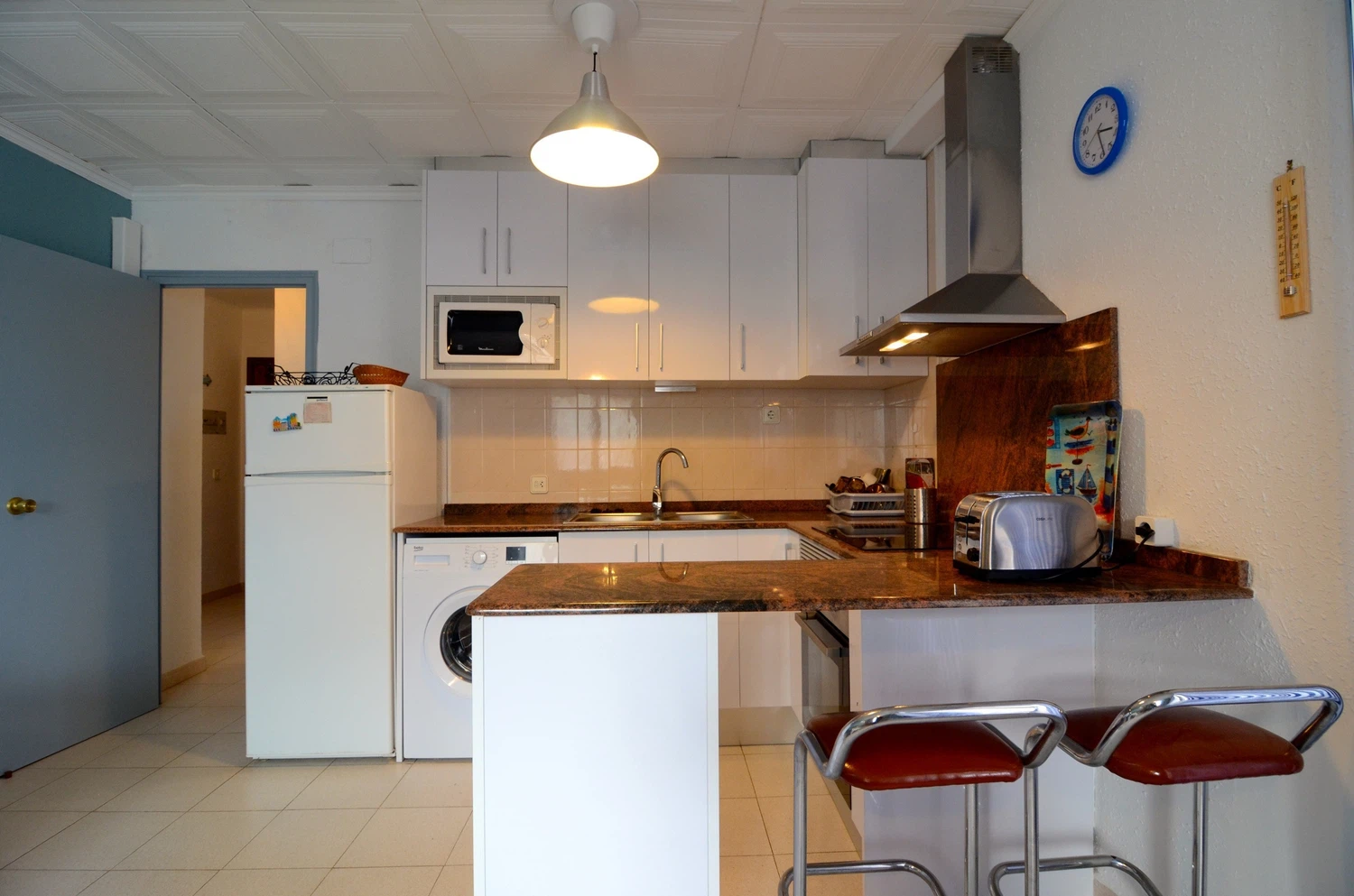 La cocina americana está totalmente equipada con electrodomésticos modernos como nevera, lavadora, horno, microondas, tostadora, máquina de café y menaje completo. Además, cuenta con aire acondicionado para garantizar tu confort durante los días más calurosos.