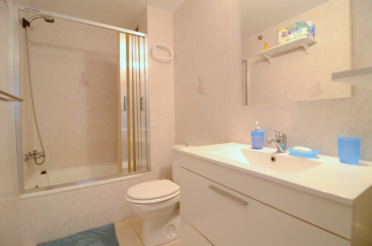 El apartamento cuenta con capacidad para 4 personas, distribuidas en 2 dormitorios con 3 camas: 1 cama doble y 2 camas individuales. Dispone de un único baño completo con bañera, ideal para relajarse después de un día de playa.