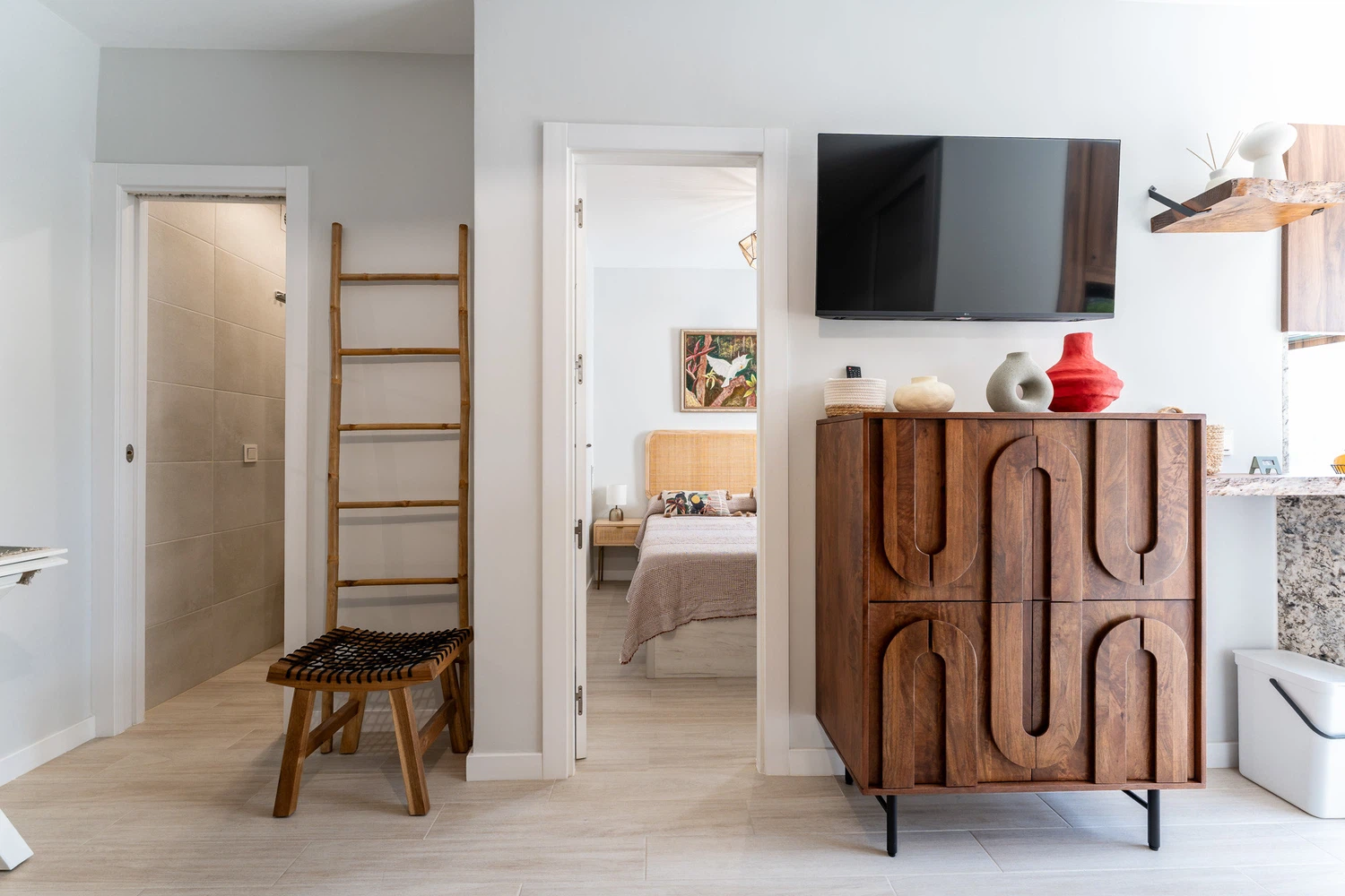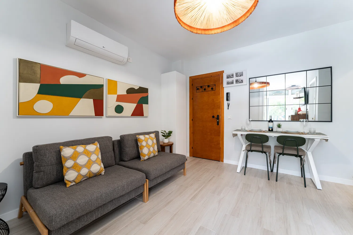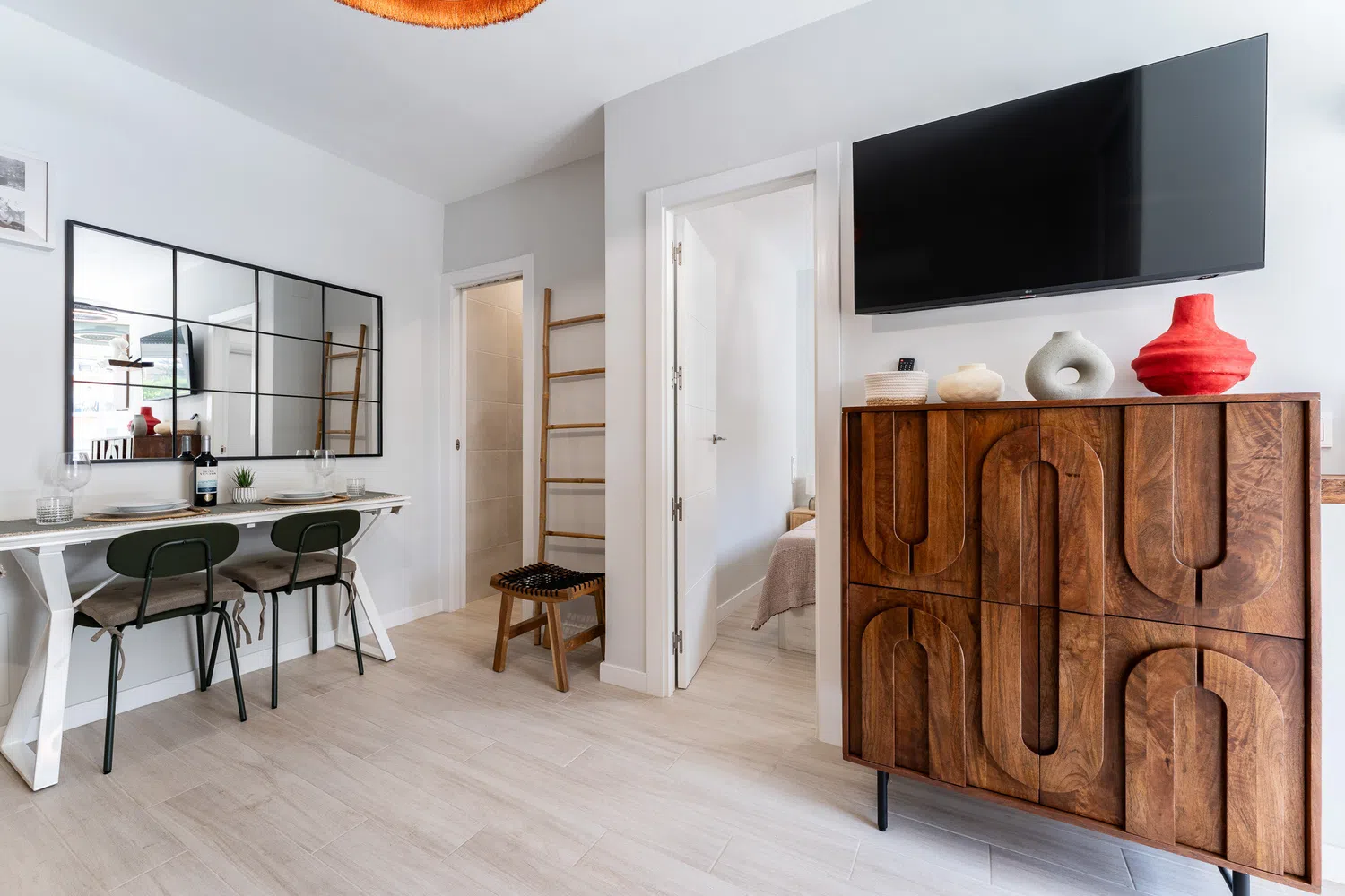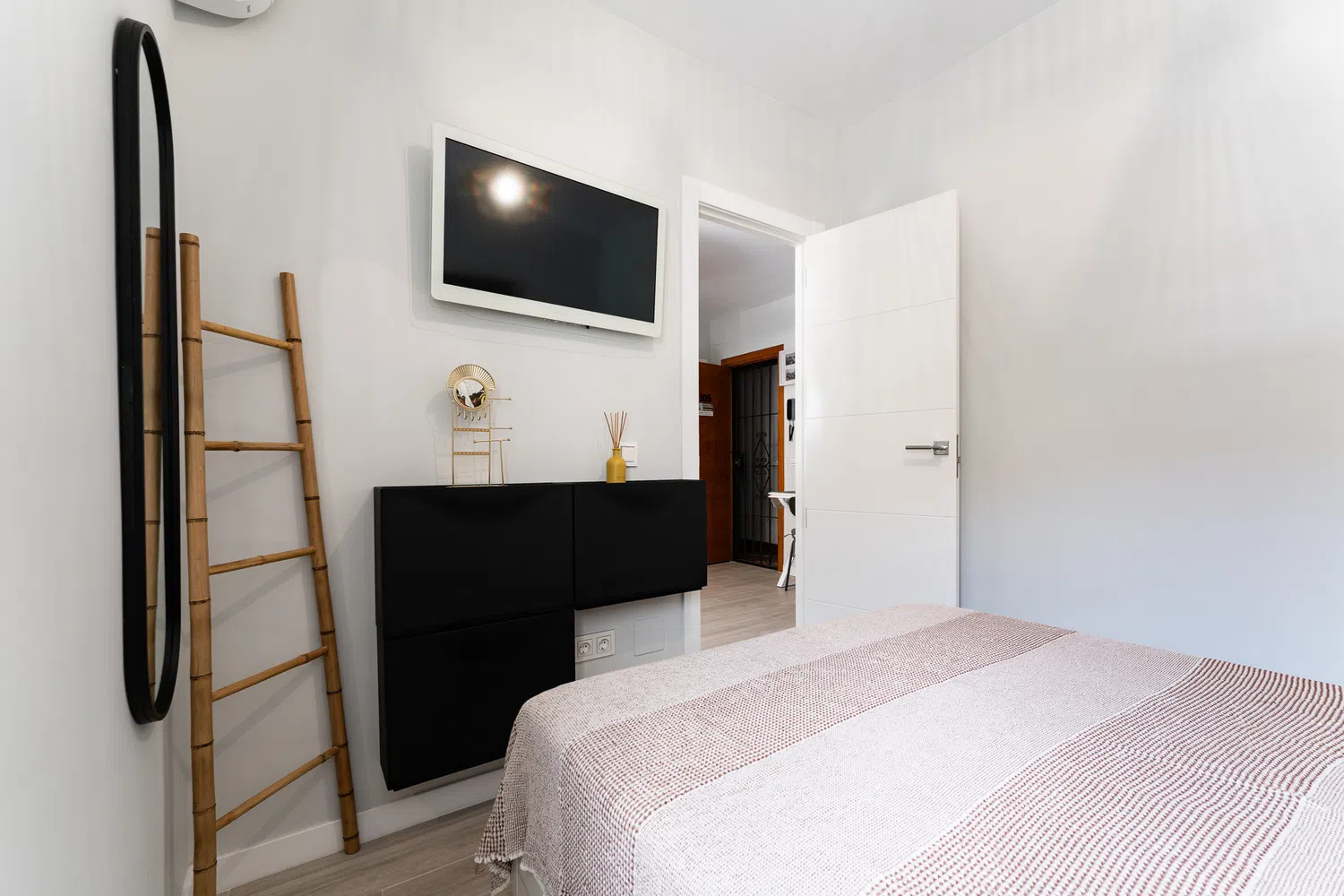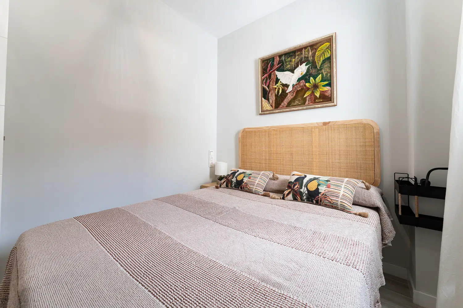 El apartamento cuenta con un dormitorio principal con una cama doble, perfecto para descansar después de un día de exploración. Dispone de un baño completo con ducha, aire acondicionado y calefacción por bomba de calor para garantizar tu confort en cualquier época del año.