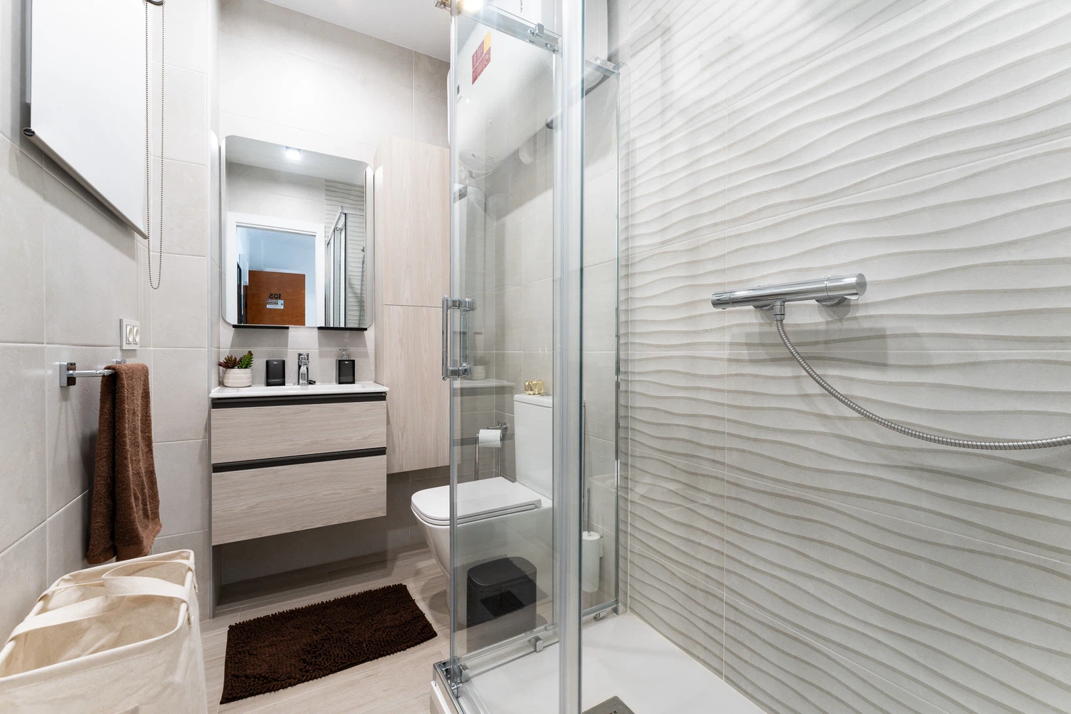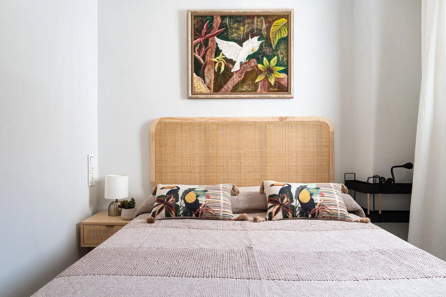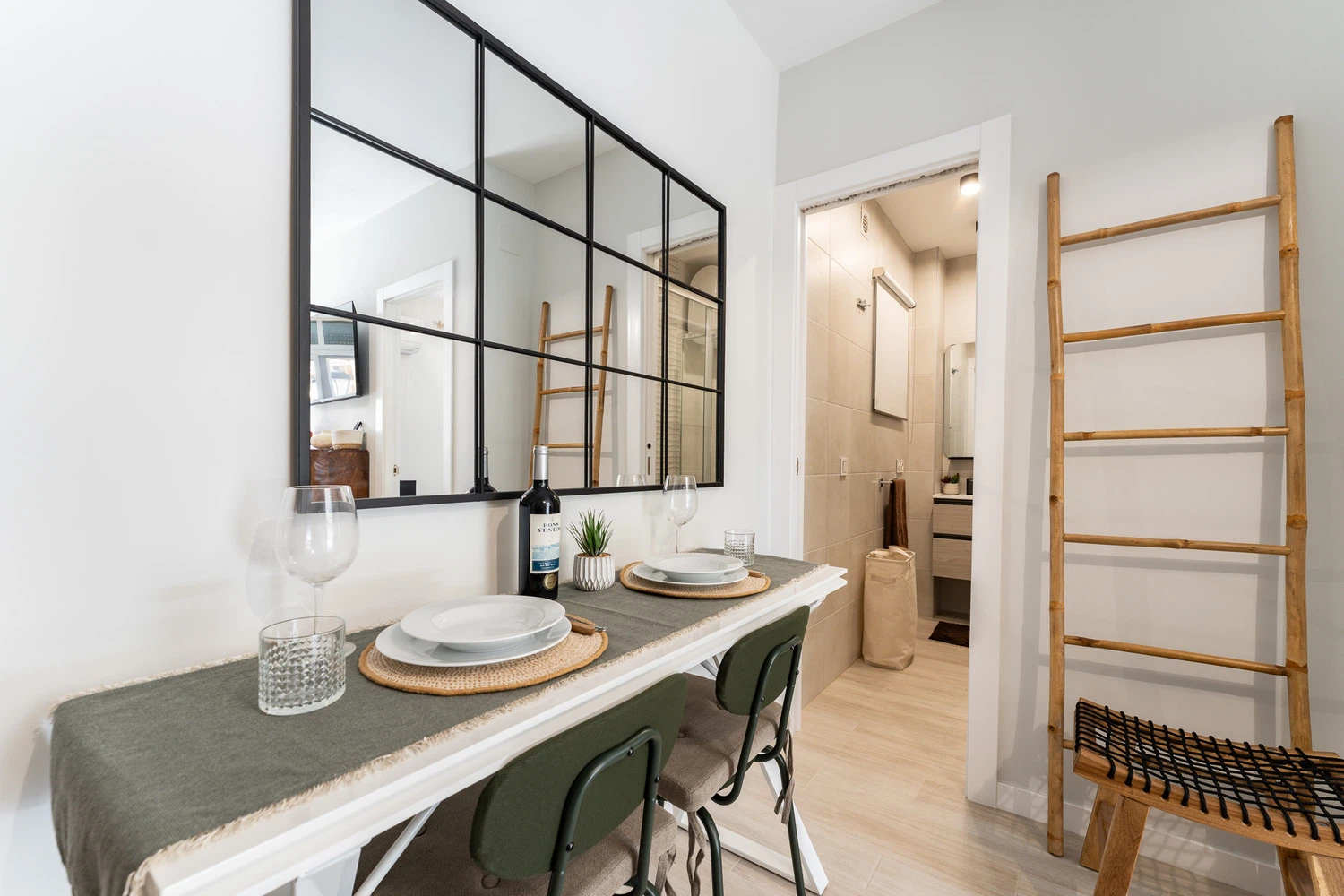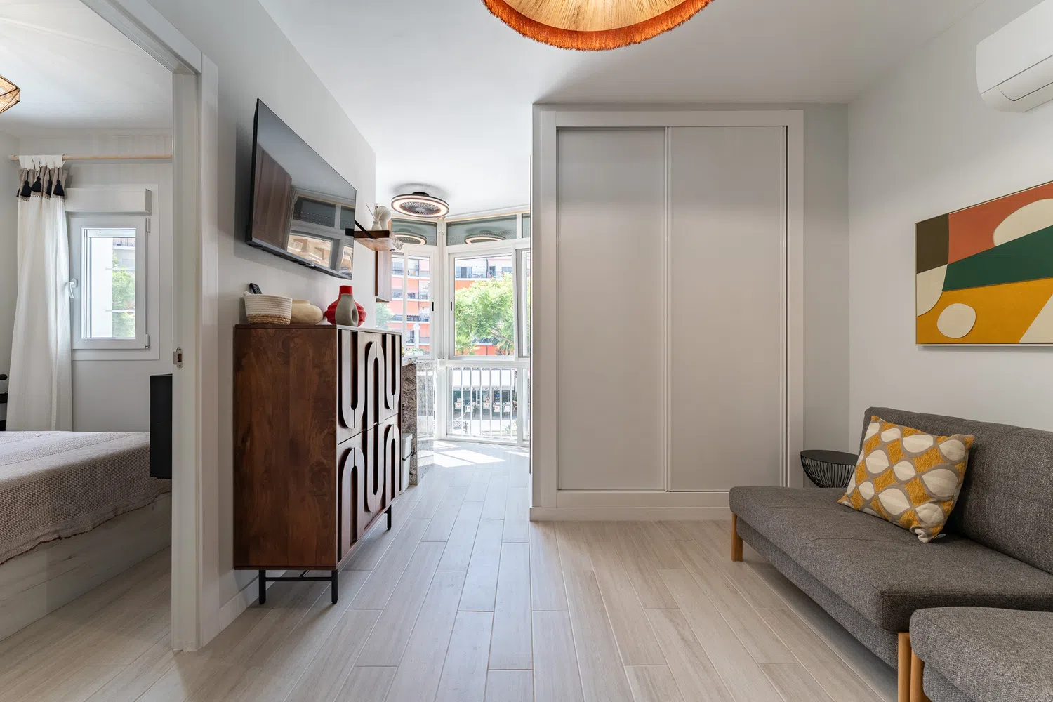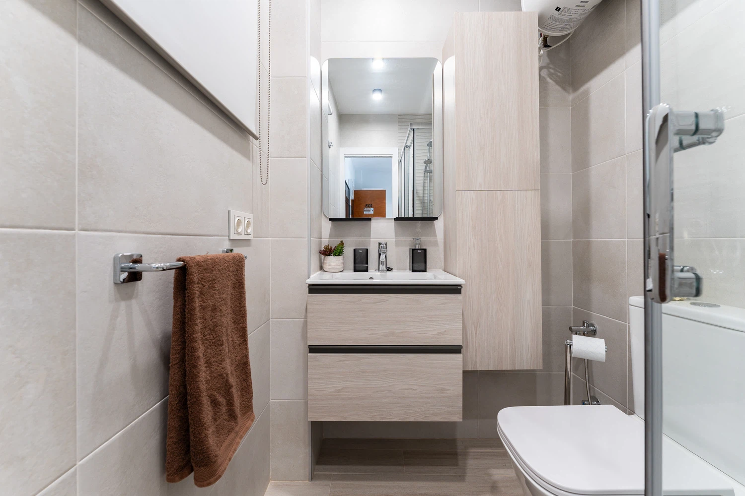 El apartamento cuenta con un dormitorio principal con una cama doble, perfecto para descansar después de un día de exploración. Dispone de un baño completo con ducha, aire acondicionado y calefacción por bomba de calor para garantizar tu confort en cualquier época del año.