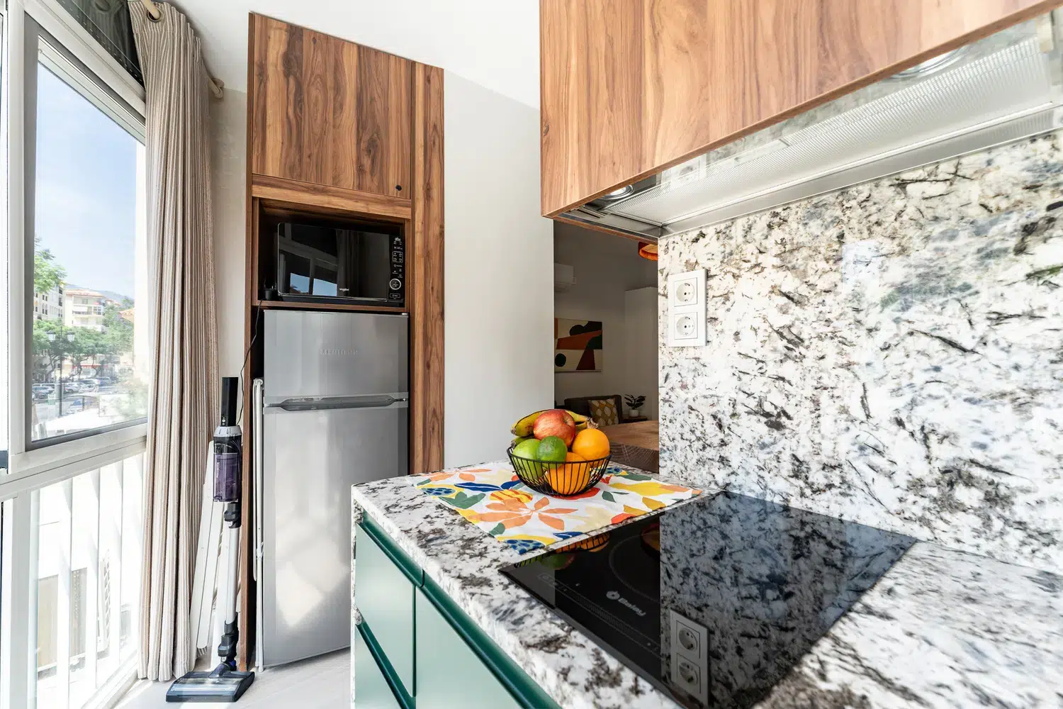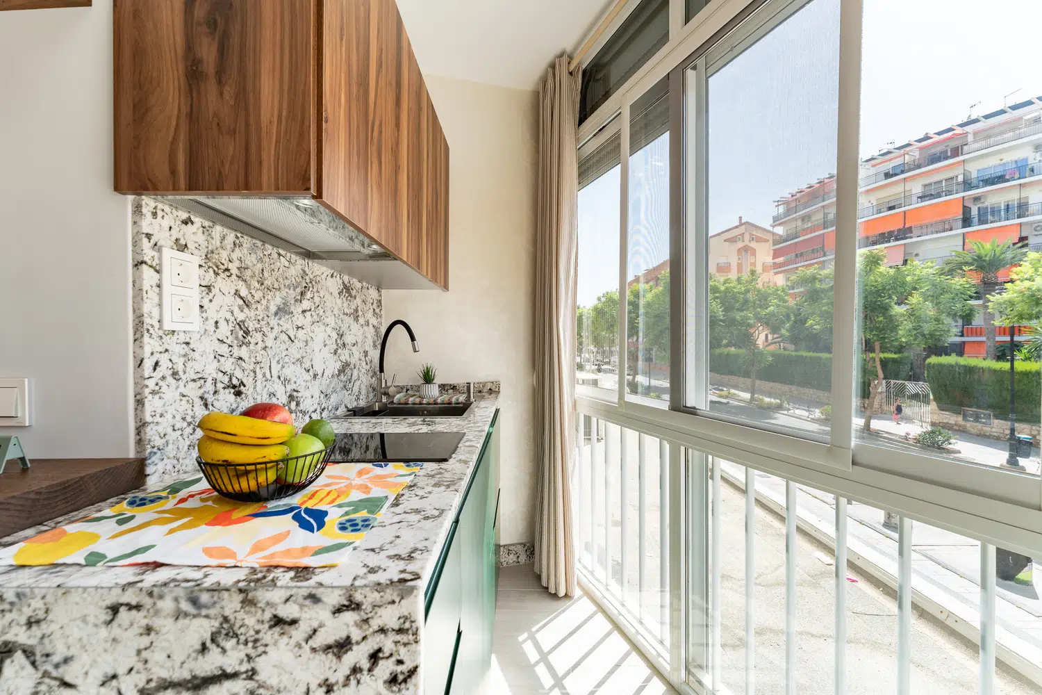 La cocina americana está totalmente equipada con electrodomésticos modernos, incluyendo placa vitrocerámica, frigorífico, congelador, microondas, cafetera, tostadora, hervidor, exprimidor y menaje completo. Además, encontrarás dos televisores y conexión WiFi para mantenerte comunicado.