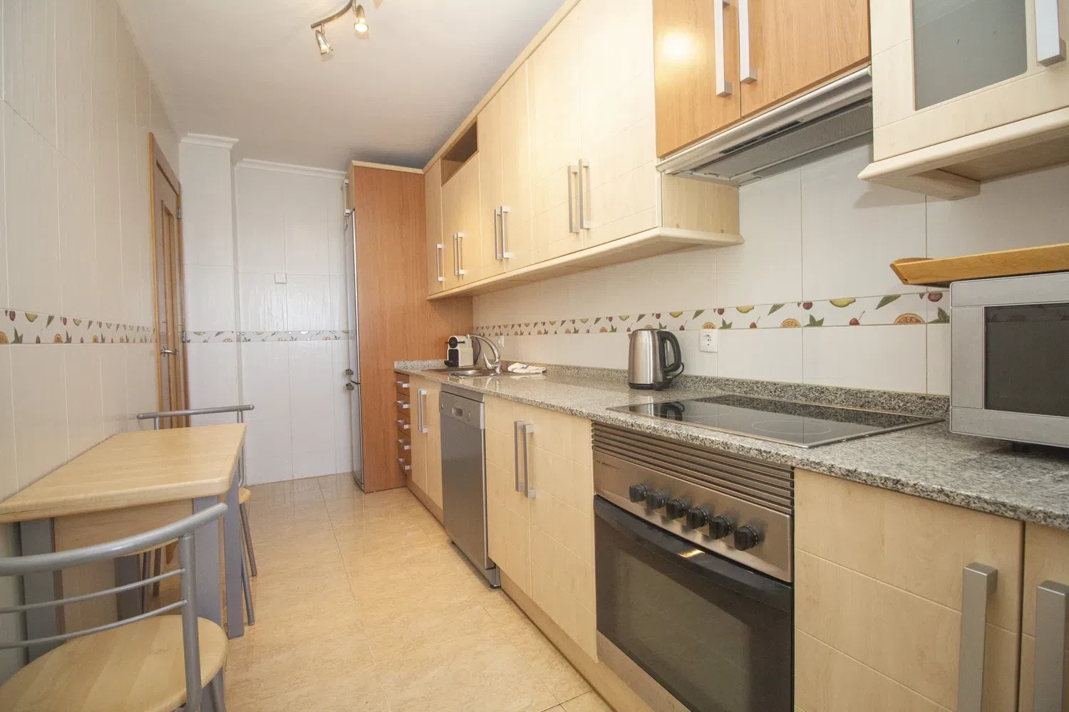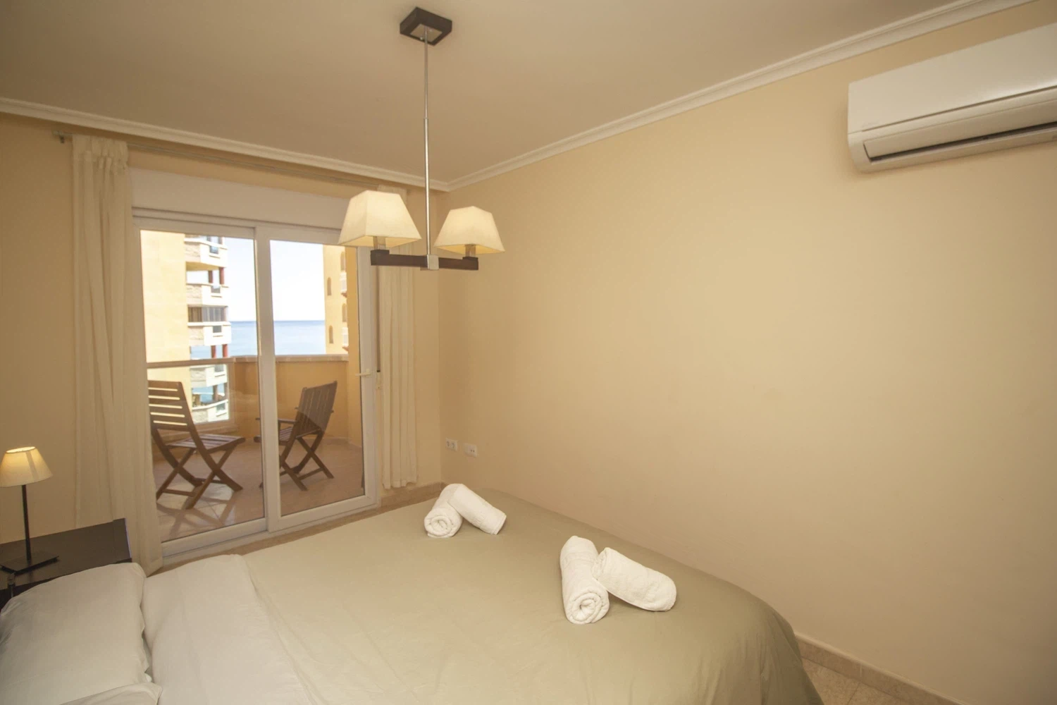 El dormitorio principal tiene una cama doble, terraza privada y su propio baño con ducha; el segundo dormitorio tiene dos camas individuales y un gran ventanal con vistas al Mar Menor. En el pasillo se encuentra un baño familiar con bañera y una cocina independiente completamente equipada con lavavajillas, vitrocerámica, cafetera de cápsulas Nespresso, horno, microondas y galería con lavadora.