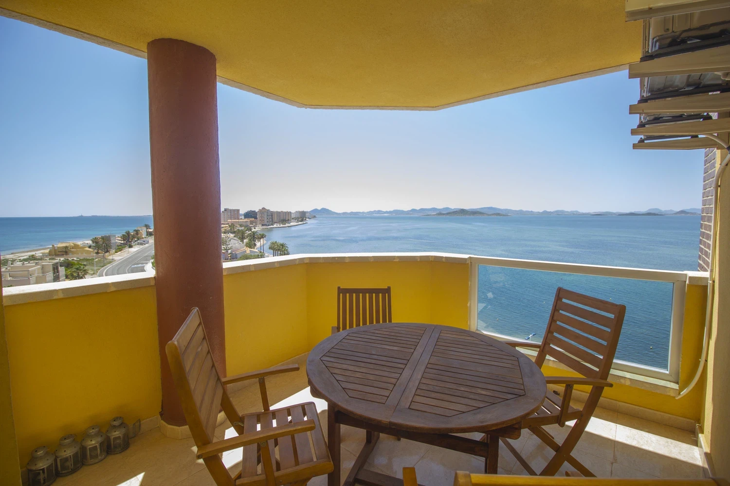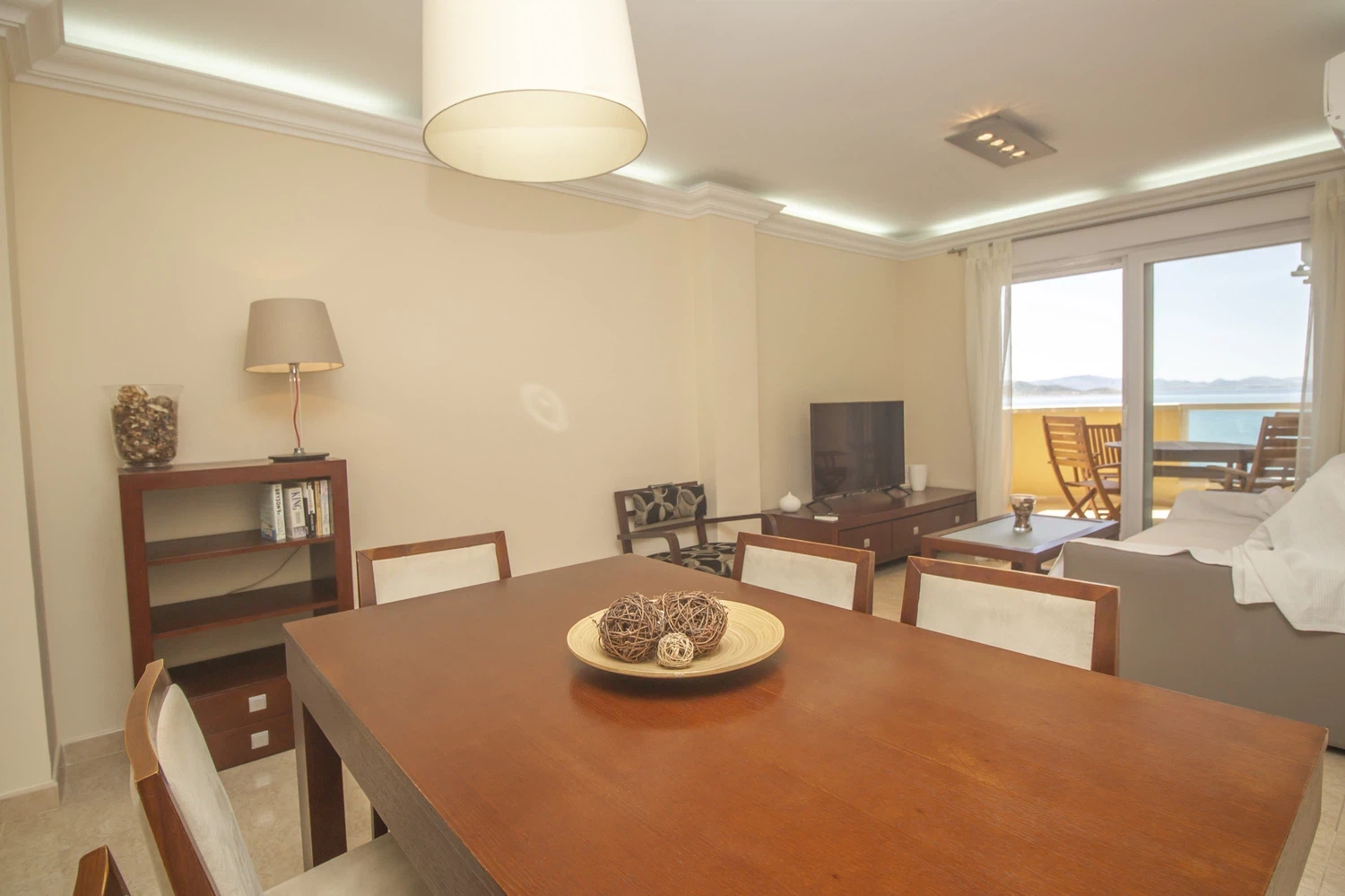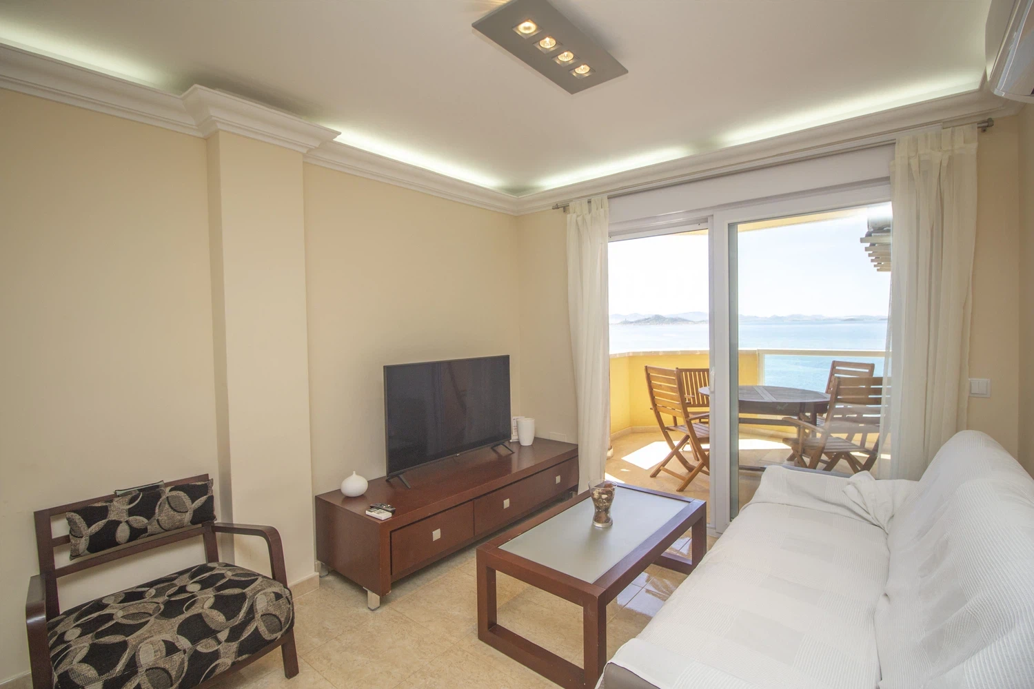 y Smart TV, zona desde la cual se accede a la terraza, dispuesta también para 6 personas y con vistas hacia La Manga y el Mar Menor, con la orientación perfecta para disfrutar de los atardeceres únicos del Mar Menor.