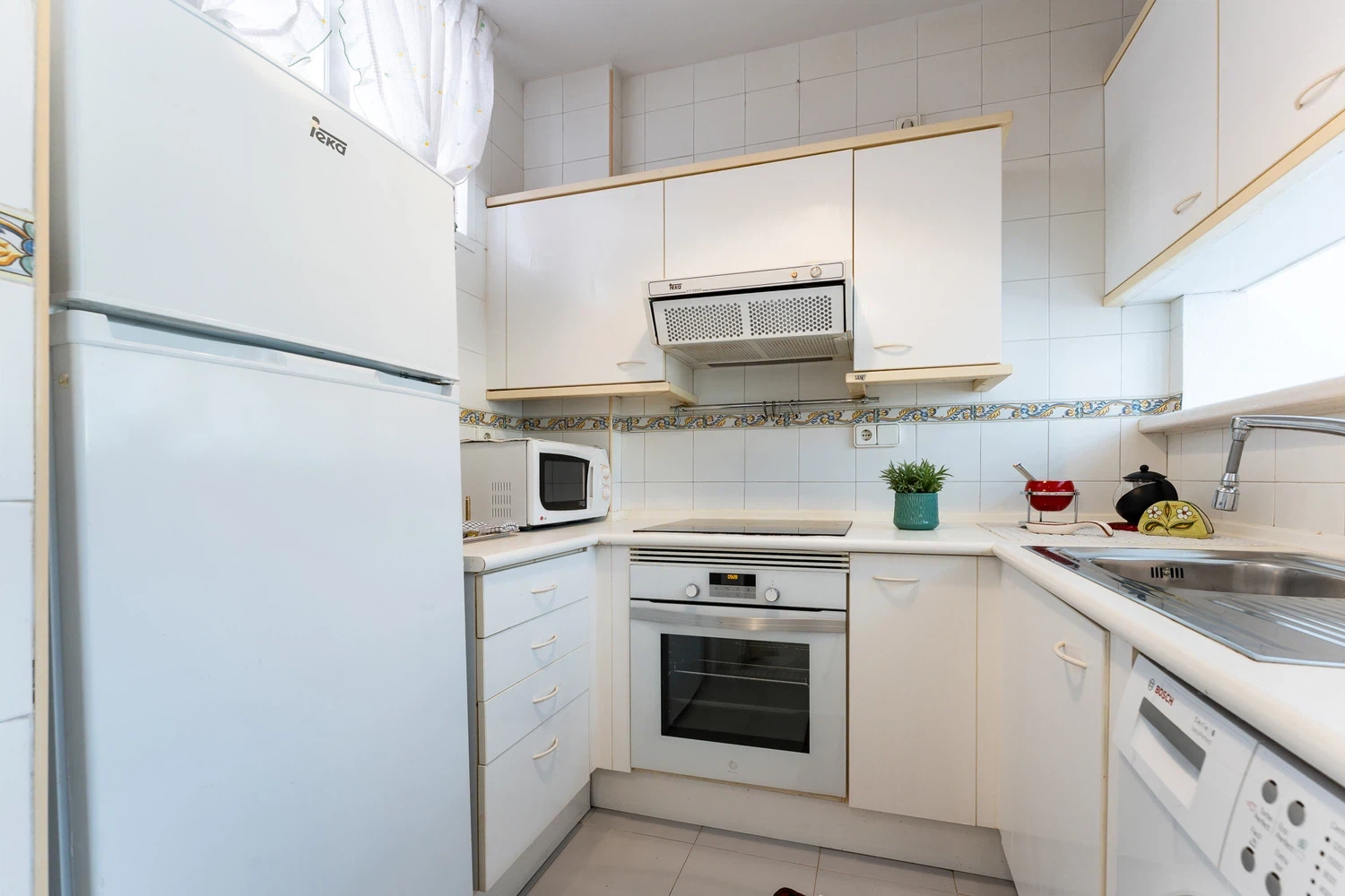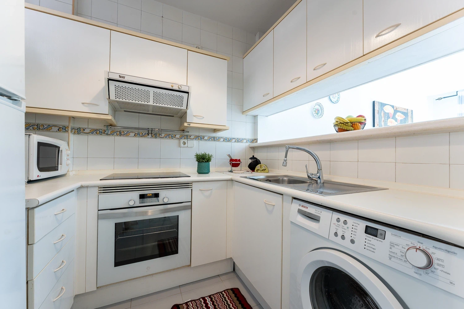 La cocina americana está totalmente equipada con electrodomésticos de última generación, incluyendo nevera, congelador, lavadora, horno, microondas, cafetera, tostadora y hervidor. Cuenta con todos los utensilios de cocina necesarios para preparar comidas deliciosas durante su estancia.