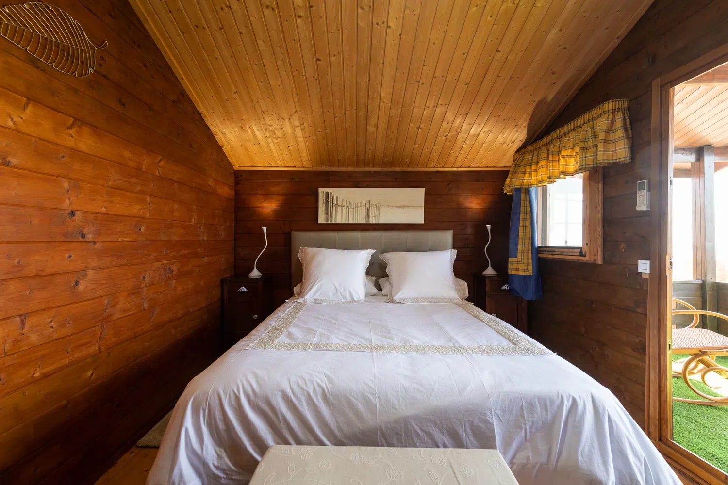 En la parte superior y con acceso independiente, se encuentran dos cabañas privadas con terraza independiente, tumbona, mesa comedor exterior, baño con ducha privado cada una, smart tv y aire acondicionado. Una de ellas tiene cama doble de 1.50x2.00m y la otra dos camas individuales de 0.90x2.00m.