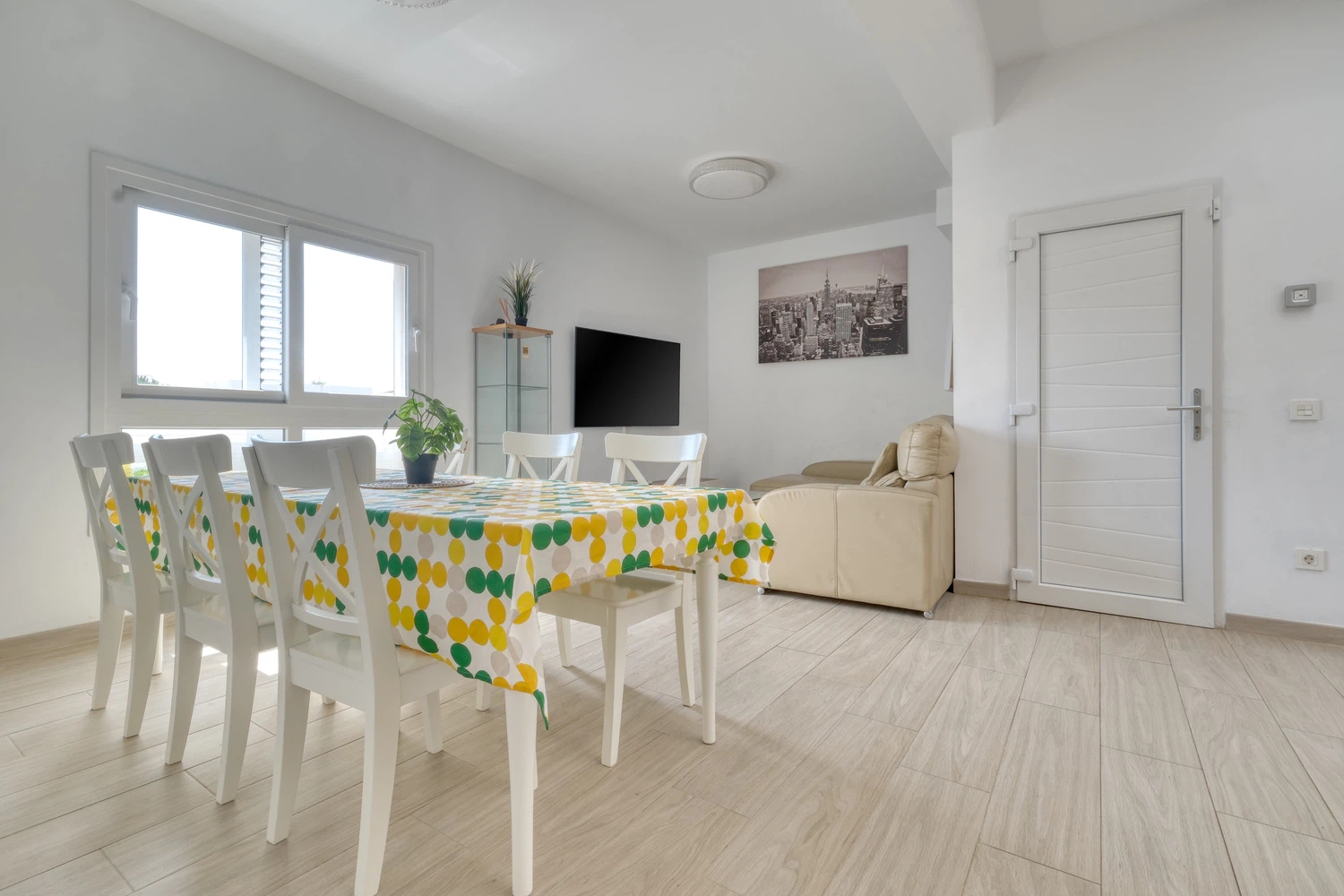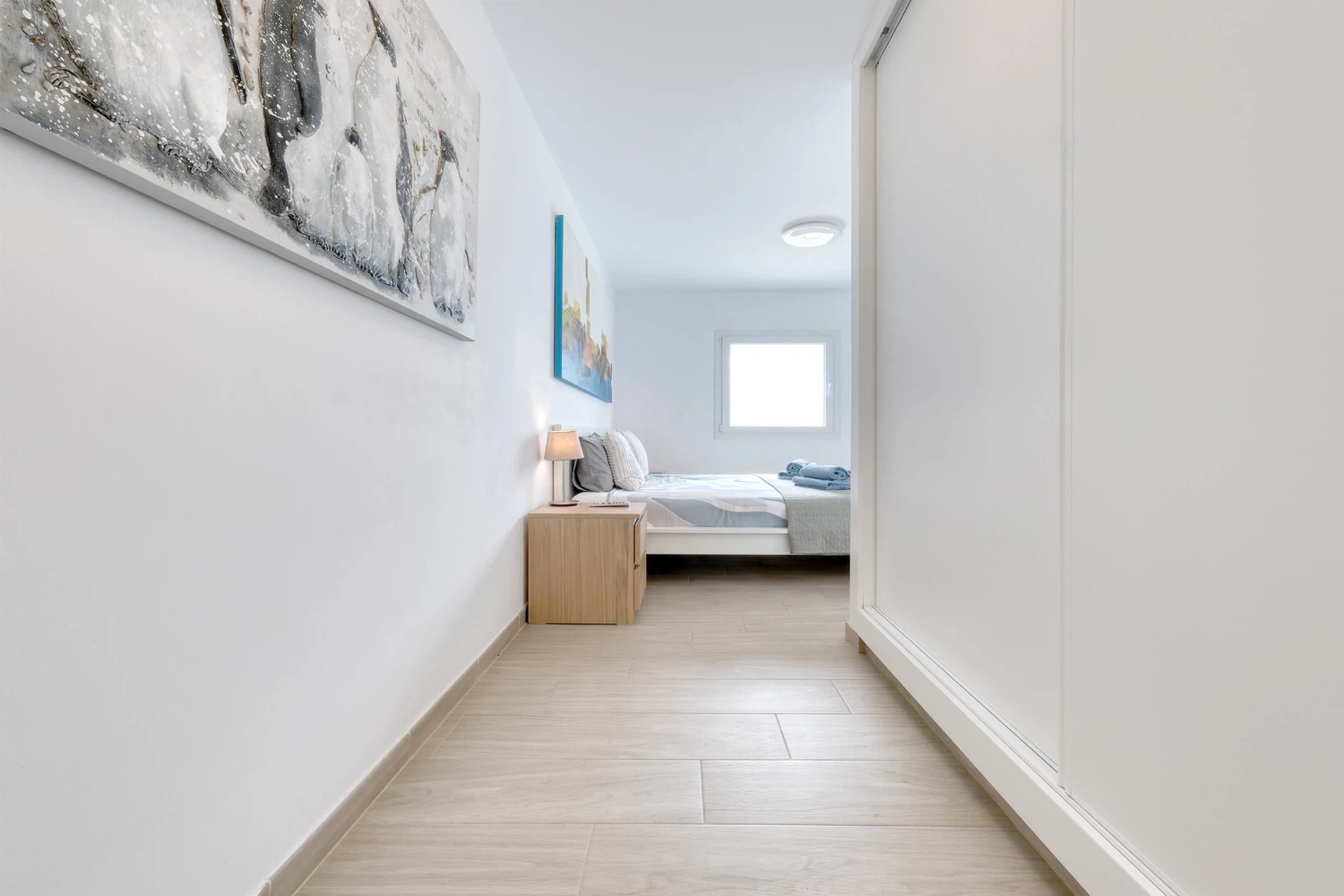 En su interior, dispone de un salón luminoso con televisión y cómodos sofás, ideal para descansar después de un día de playa.