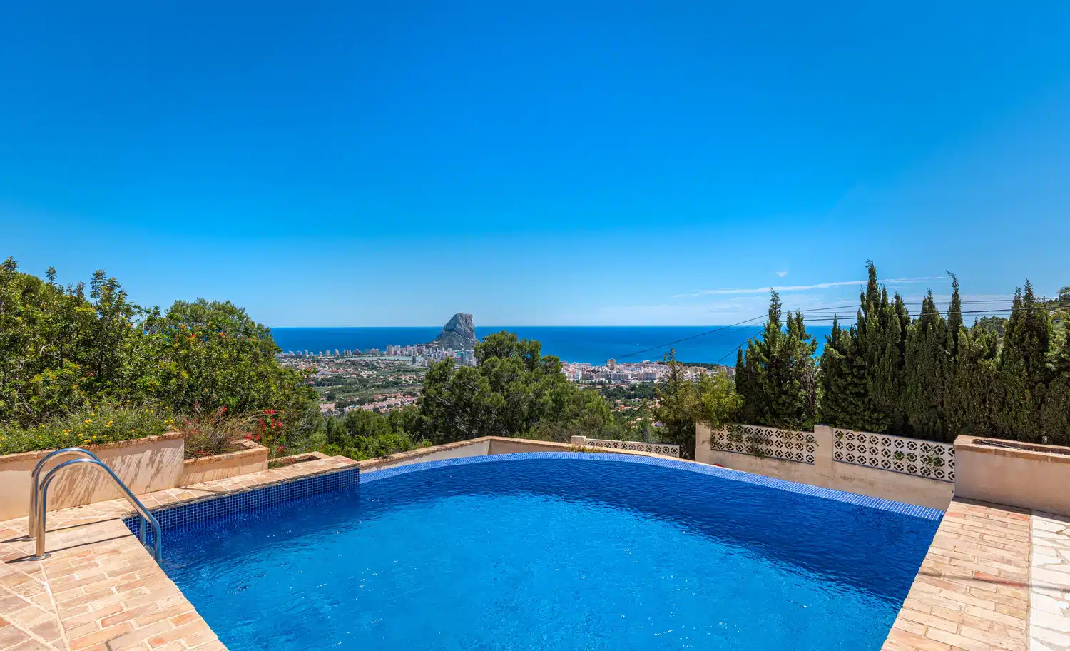 Exclusiva villa de lujo con piscina privada y vistas al mar en Calpe (Costa Blanca), para 8 personas, con cuatro dormitorios y cuatro baños en suite. Totalmente reformada, con jacuzzi interior, aire acondicionado en toda la vivienda y zonas exteriores pensadas para disfrutar del clima mediterráneo.