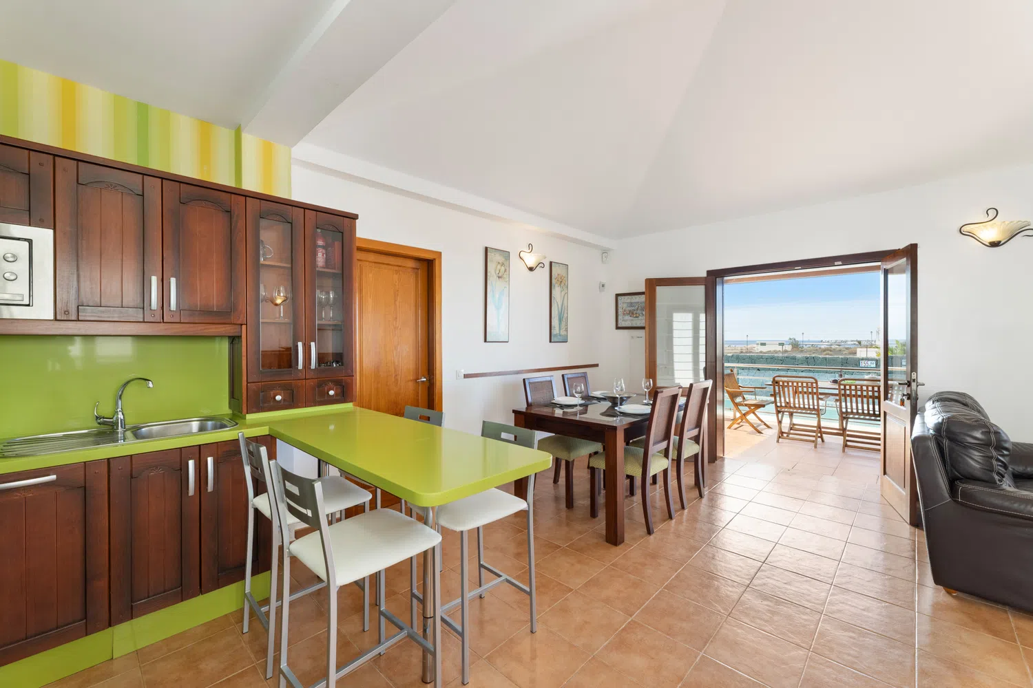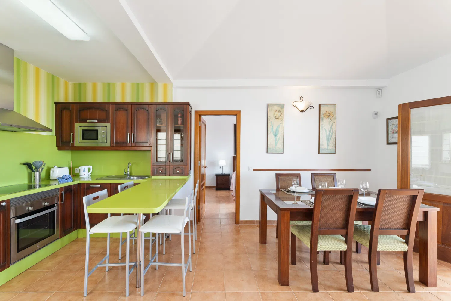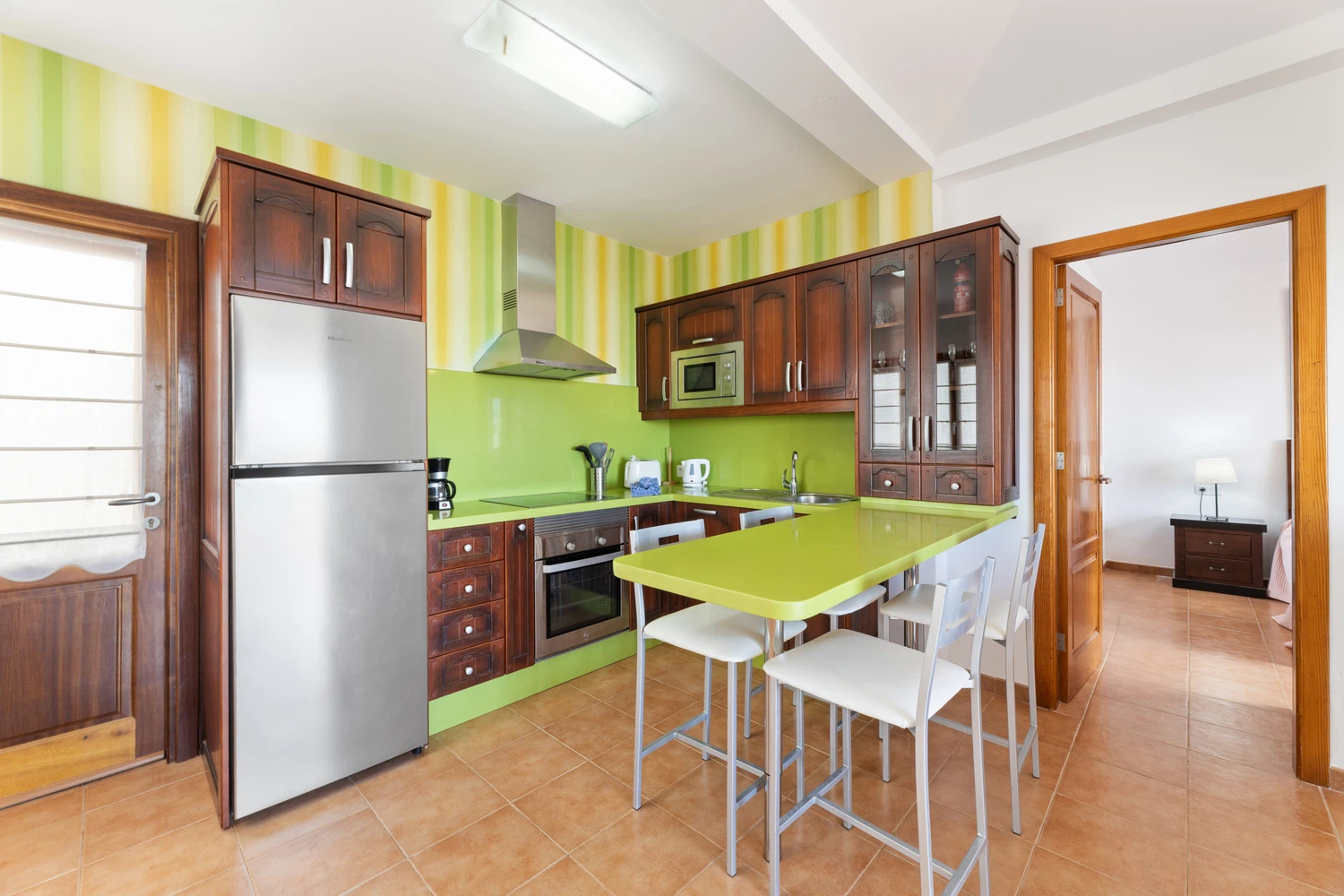 abierta con barra para desayunar. Equipada con todos los electrodomésticos. El salón