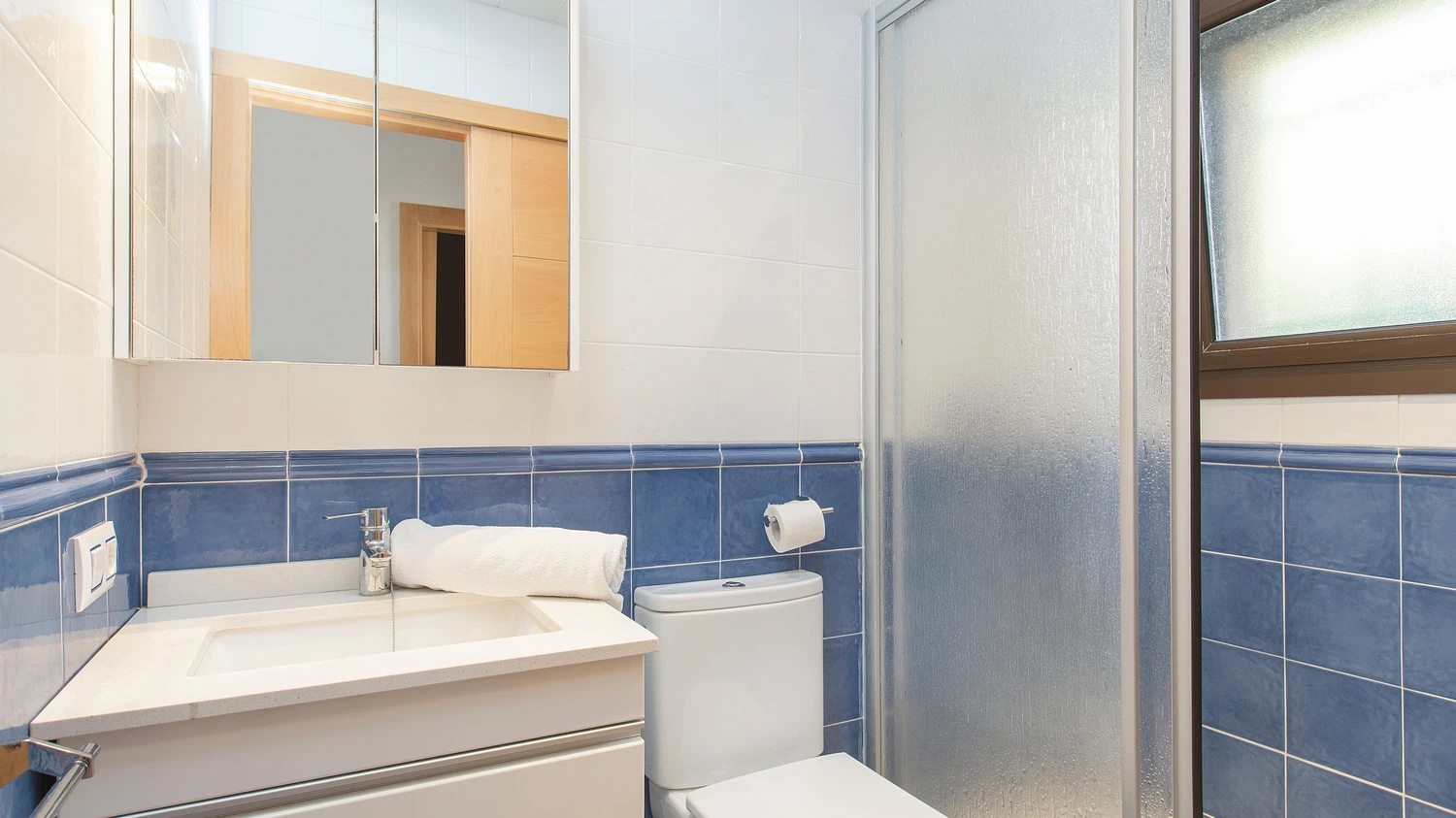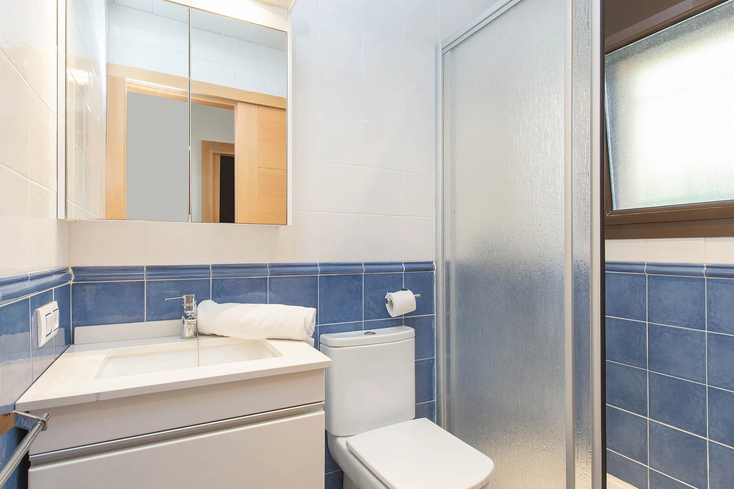 Zona interior de 120 m2: En el apartamento de arriba nos encontramos con un gran salón comedor con tv, cocina equipada (lavavajillas, lavadora, microondas), 2 habitaciones de matrimonio (135x190cm) y 1 baño con ducha.