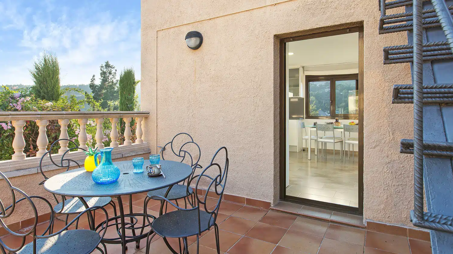 Zona exterior de 1.700 m2 con piscina privada, preciosos jardines y una gran terraza donde podrá disfrutar de desayunos y comidas con unas bonitas vistas a la montaña. También dispone de una barbacoa de obra y parking.
