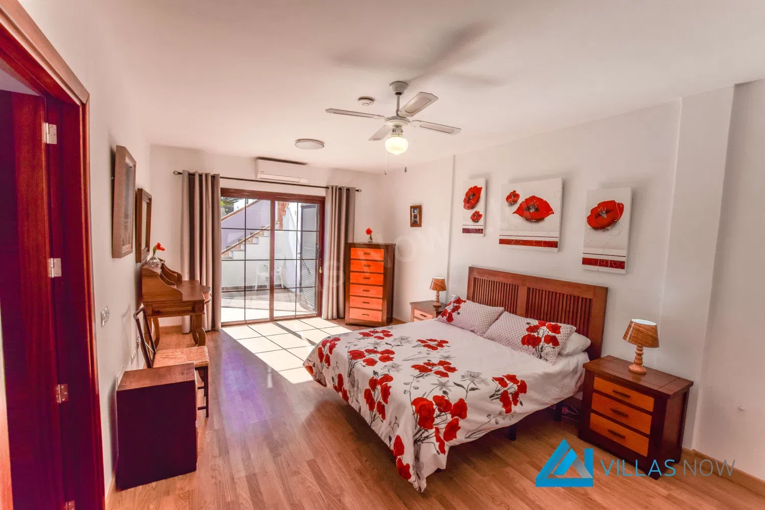 Subir las escaleras al nivel inferior le llevará a 3 dormitorios más, dos habitaciones dobles con camas King Size, una con baño privado, un gran dormitorio doble y dos baños familiares más. Cada dormitorio tiene puertas que dan a la terraza inferior y todas las ventanas y puertas están equipadas con contraventanas y mosquiteros.