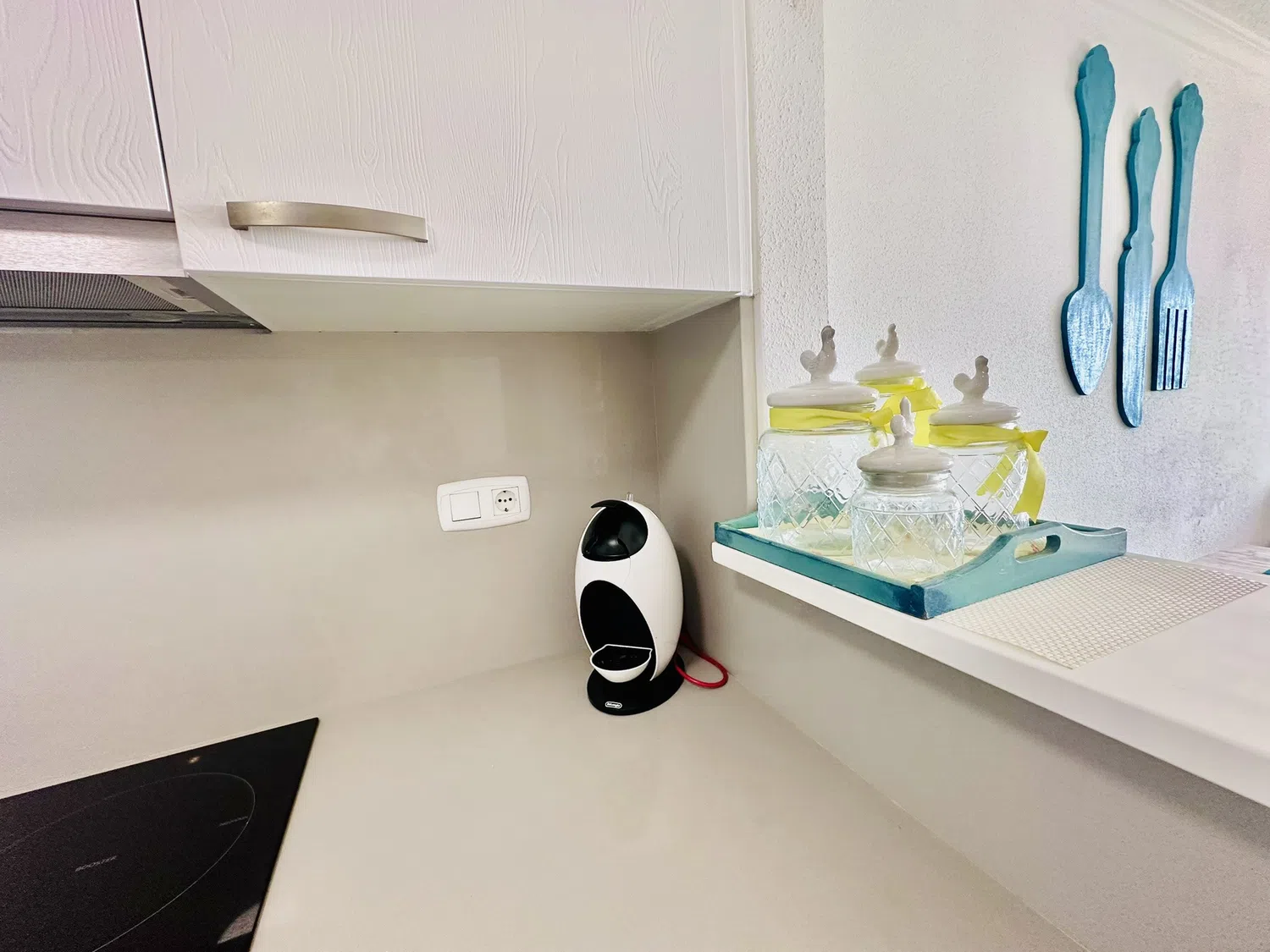 La cocina americana está totalmente equipada con vitrocerámica, horno, microondas, nevera, congelador, lavavajillas, lavadora, cafetera, tostadora y todos los utensilios necesarios para una estancia cómoda y placentera.