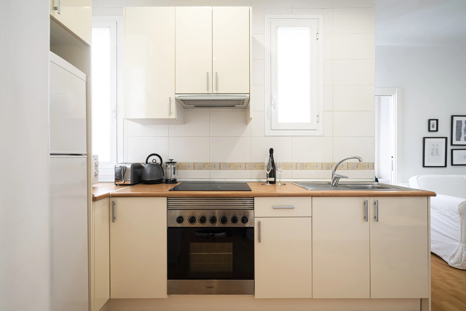 Hay disponible una cocina equipada con placa vitro cerámica eléctrica, frigorífico, microondas, cafetera italiana y menaje de hogar. Se pueden preparar comidas rápidas y para llevar.