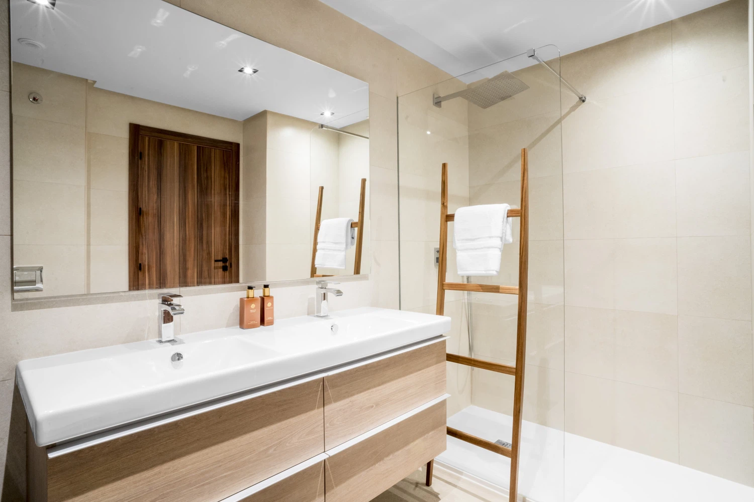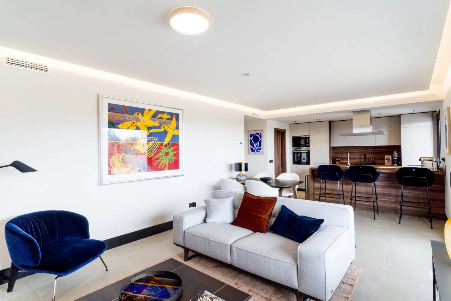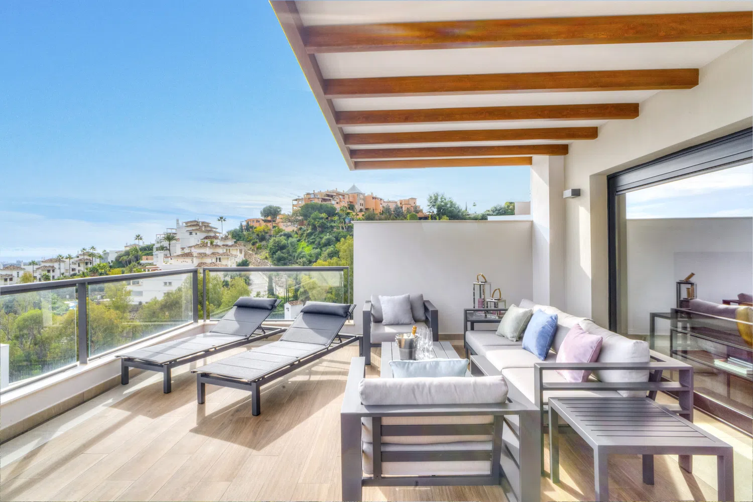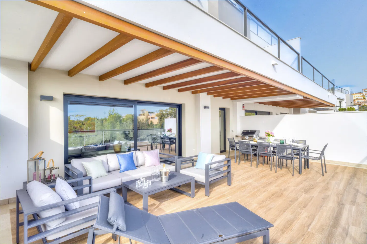 Al entrar en el apartamento, los invitados son recibidos con un recibidor con almacenamiento integrado, que se abre a la sala de estar/comedor con cocina de estilo americano. La cocina está completamente equipada con todo lo que se podría necesitar para cocinar y entretener, hasta una máquina de café Nespresso. Esta área conduce a través de ventanas de doble apertura a una terraza enorme con asientos tanto para comer como para relajarse al sol. Un pasillo lleva a dos dormitorios dobles con un baño familiar compartido, y un dormitorio principal espacioso con su propio baño en suite.